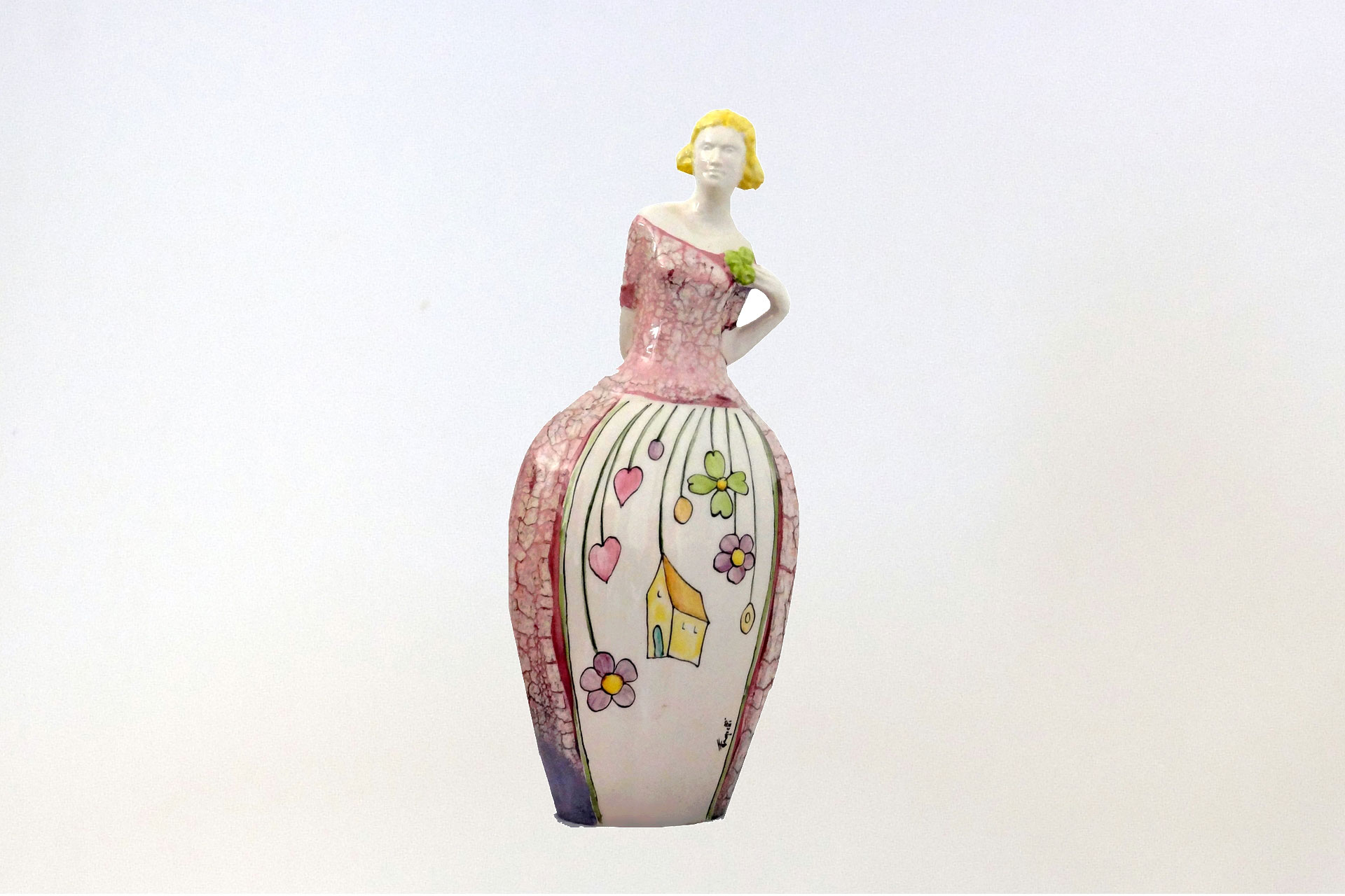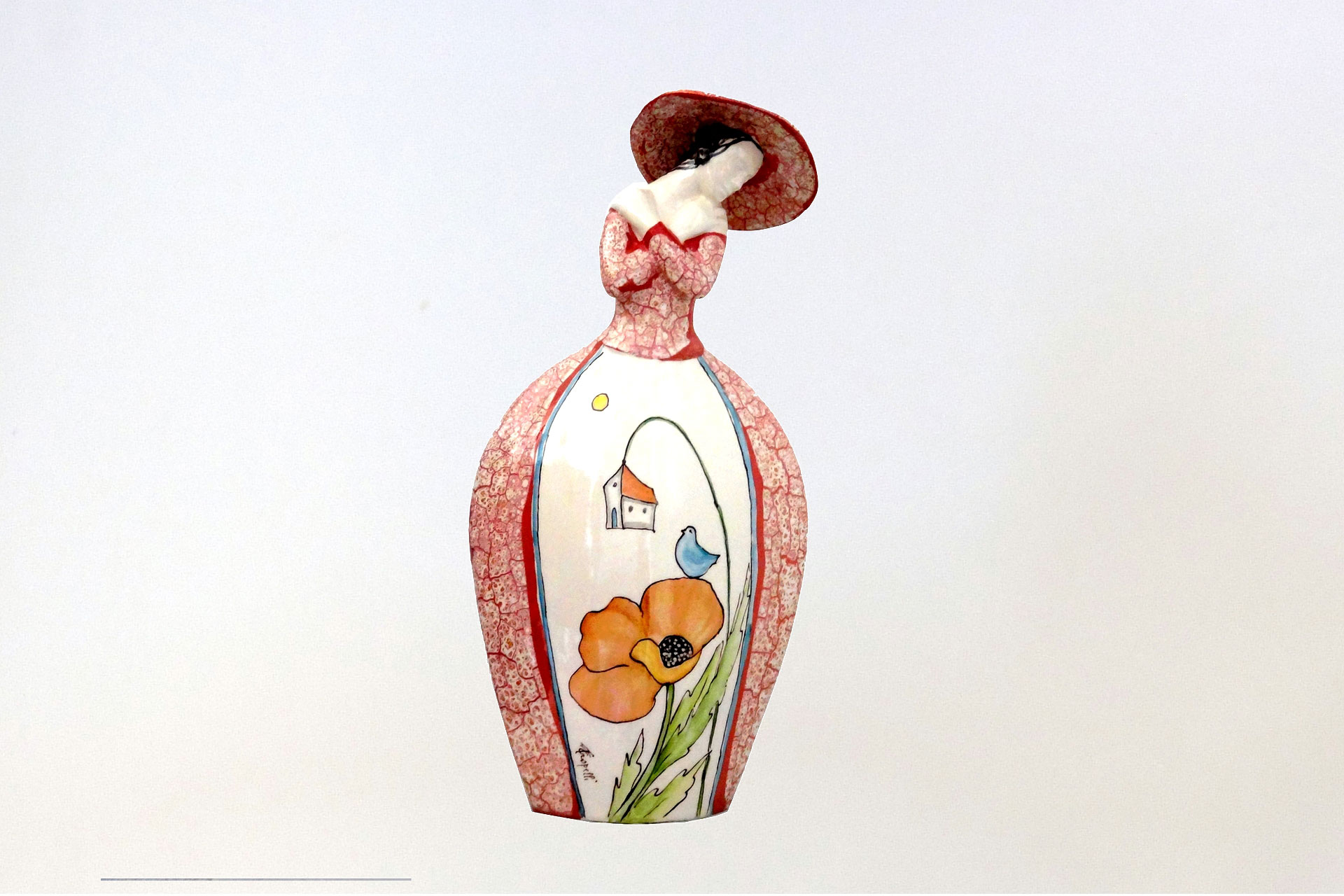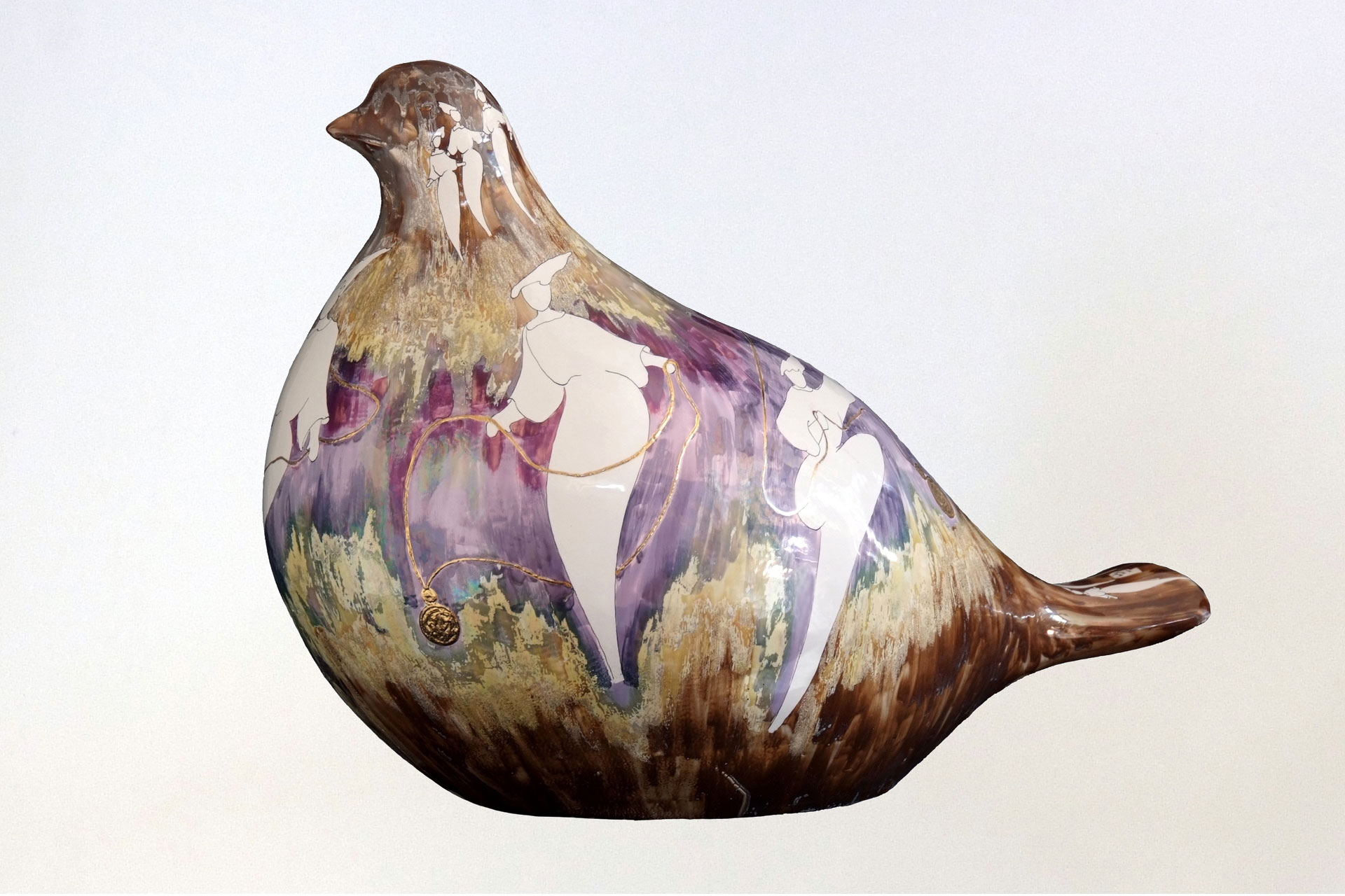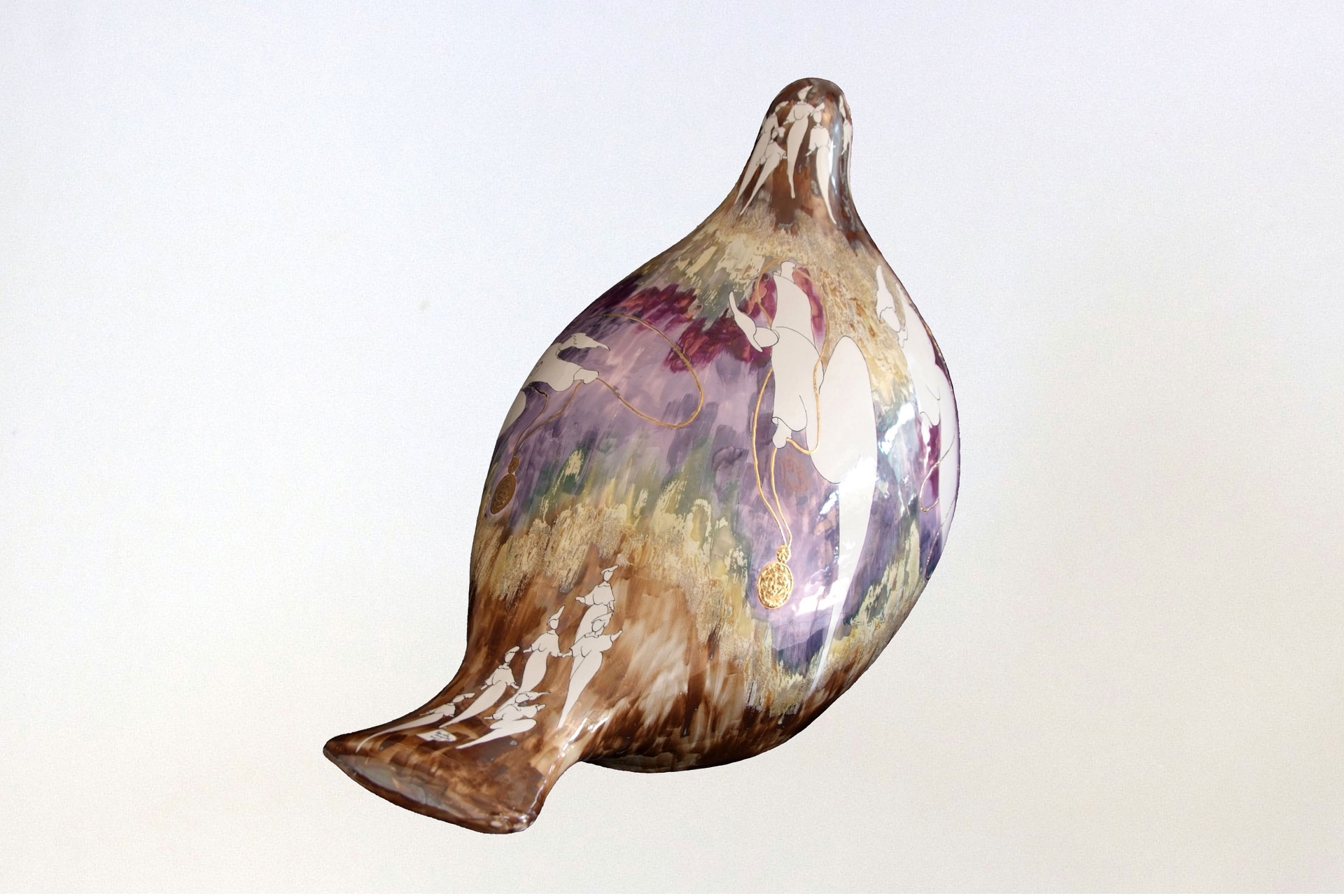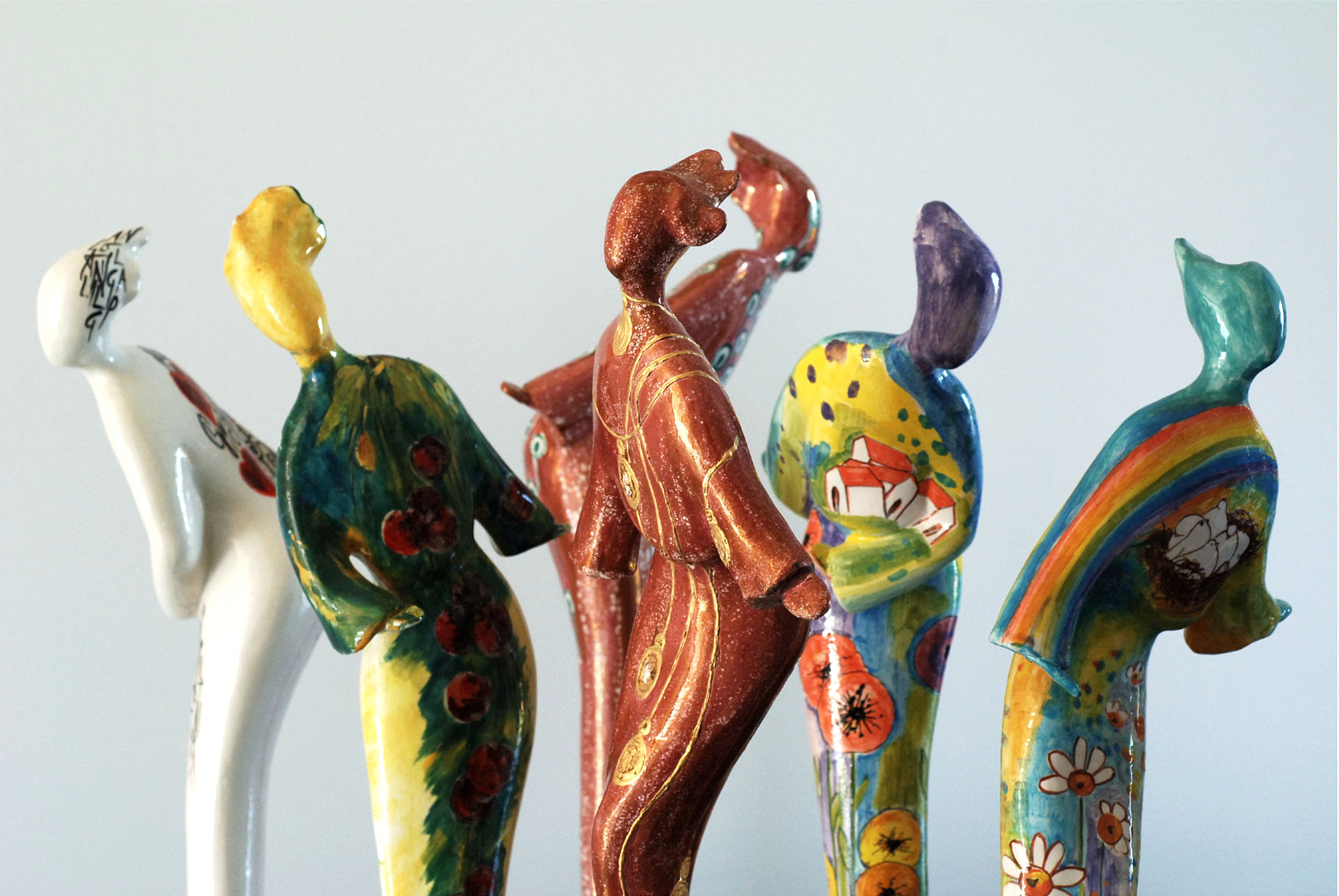 Donna colta e artista di vaglia, ottima disegnatrice e modellatrice, Fausta Cropelli ci offre qui – dopo i piccioni e gli spiritelli – la sua terza persuasiva serie di creature nate dall’alchimìa del gran fuoco e del piccolo fuoco, del biscuit, dalla preziosità degli smalti, delle cristalline, dei lustri, degli ori, degli engobi, insomma dalla varietà di quella plurisecolare tecnica ceramistica a più cotture, che lei ha appreso da autodidatta, ma che ha saputo aggiornare e reinventare con stile personale, uno stile che non esclude la commistione di materiali, la ricerca e la sperimentazione di nuove strade. Forme modulari e seriali, replicate con gli stampi, ma che divengono, come le definisce Fausta, “le mie tele”, le superfici sui cui esprimere e dilatare un’inesauribile, sontuoso repertorio pittorico, una saturazione decorativa fatta di pennellate talora astratte, di sapienti gocciolature, di segni, di motivi floreali, vegetali, figurativi, in un proliferare gestuale che va letto sia nel dettaglio sia nell’assieme.