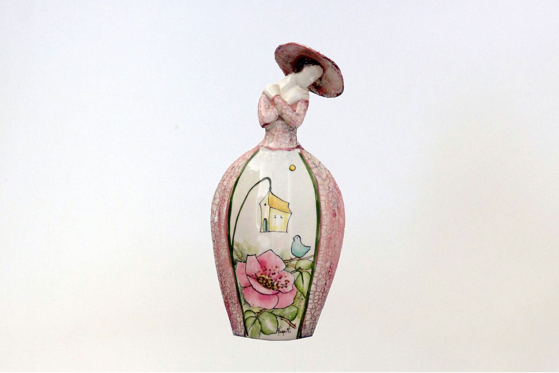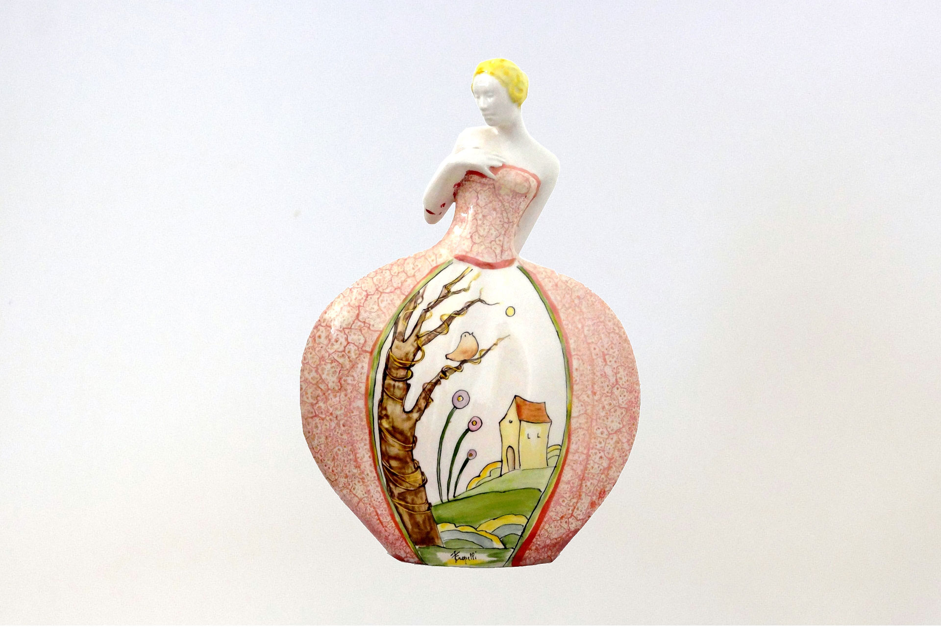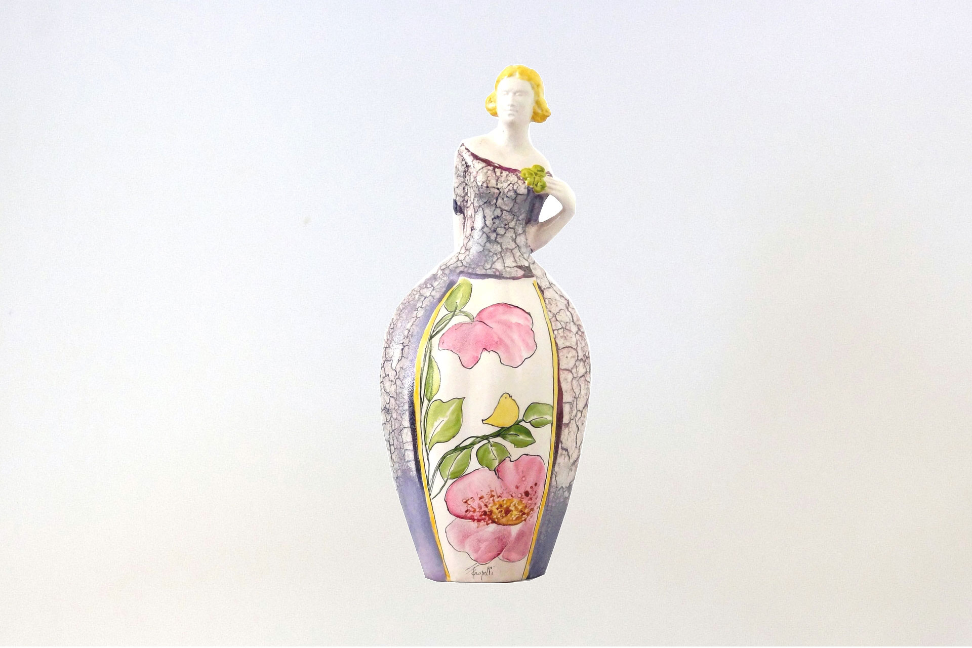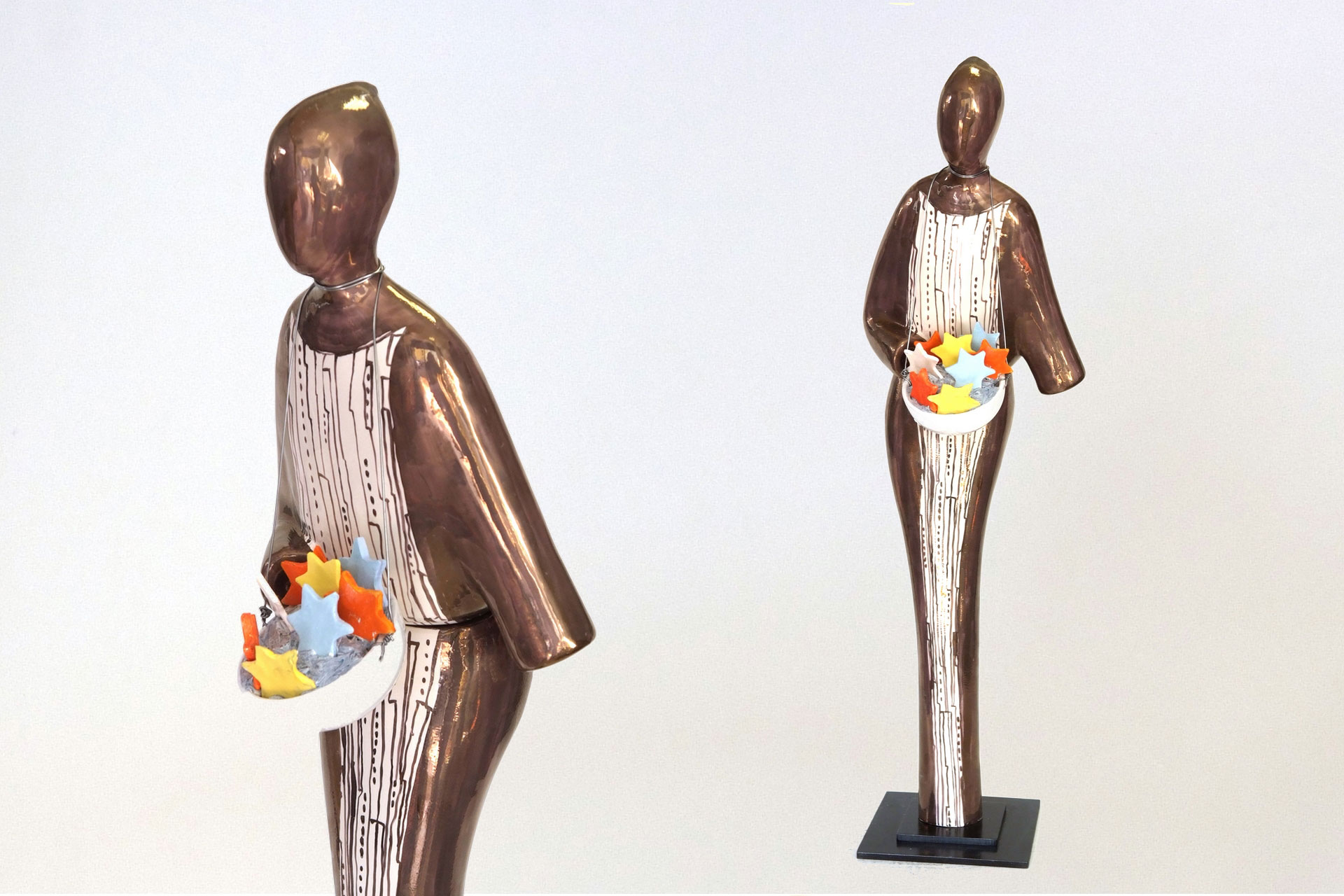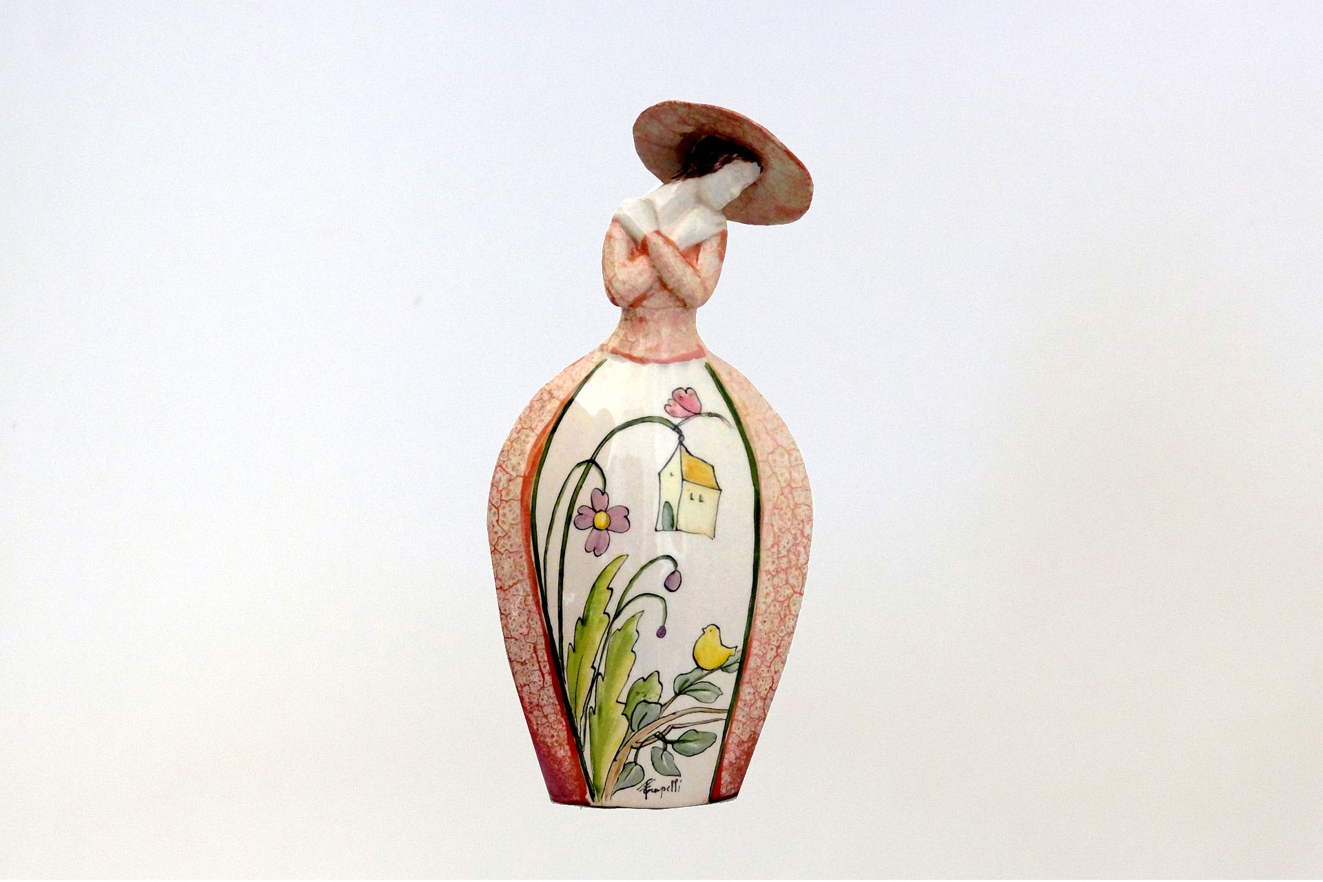 Donna colta e artista di vaglia, ottima disegnatrice e modellatrice, Fausta Cropelli ci offre qui – dopo i piccioni e gli spiritelli – la sua terza persuasiva serie di creature nate dall’alchimìa del gran fuoco e del piccolo fuoco, del biscuit, dalla preziosità degli smalti, delle cristalline, dei lustri, degli ori, degli engobi, insomma dalla varietà di quella plurisecolare tecnica ceramistica a più cotture, che lei ha appreso da autodidatta, ma che ha saputo aggiornare e reinventare con stile personale, uno stile che non esclude la commistione di materiali, la ricerca e la sperimentazione di nuove strade. Forme modulari e seriali, replicate con gli stampi, ma che divengono, come le definisce Fausta, “le mie tele”, le superfici sui cui esprimere e dilatare un’inesauribile, sontuoso repertorio pittorico, una saturazione decorativa fatta di pennellate talora astratte, di sapienti gocciolature, di segni, di motivi floreali, vegetali, figurativi, in un proliferare gestuale che va letto sia nel dettaglio sia nell’assieme.