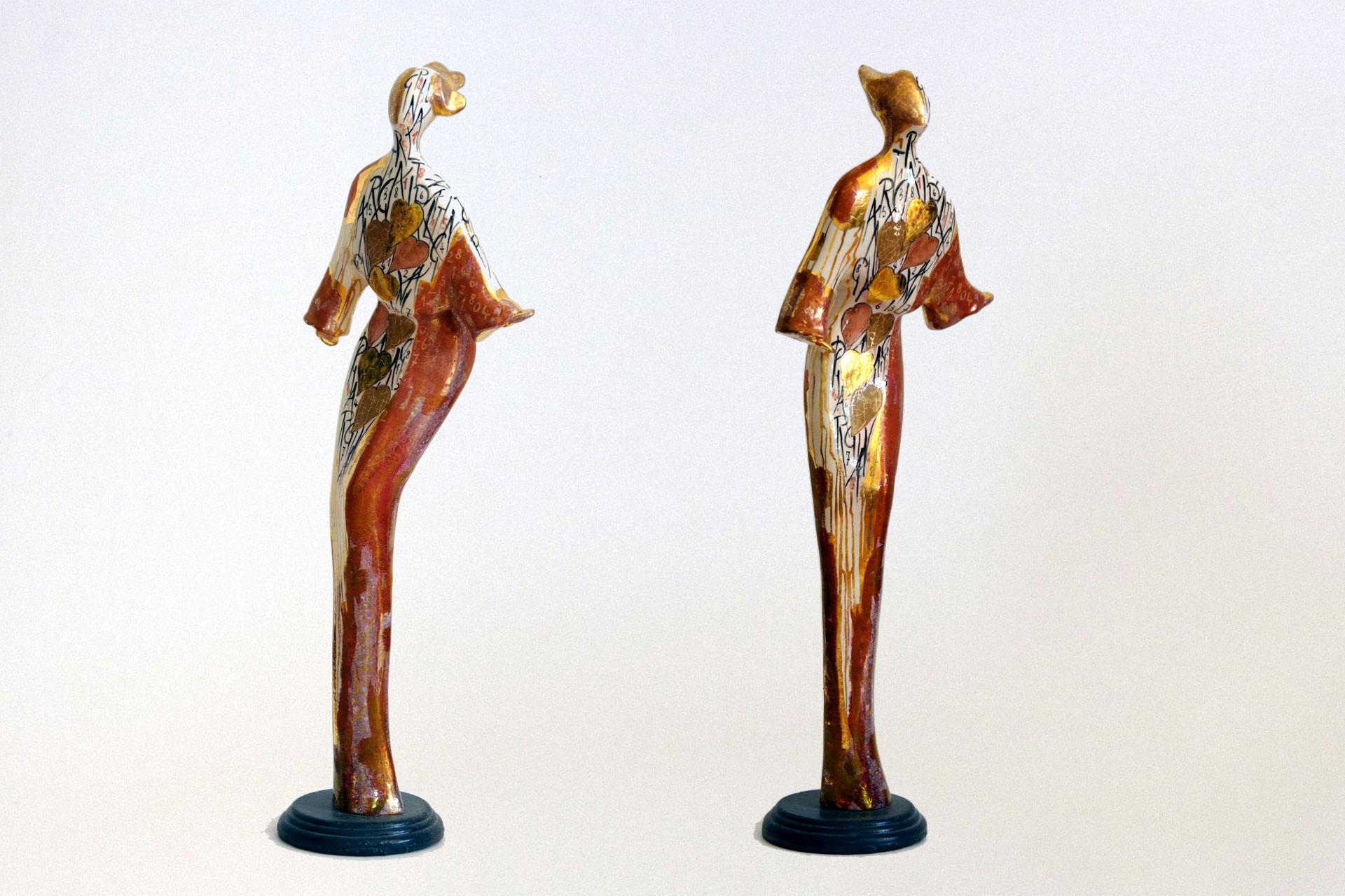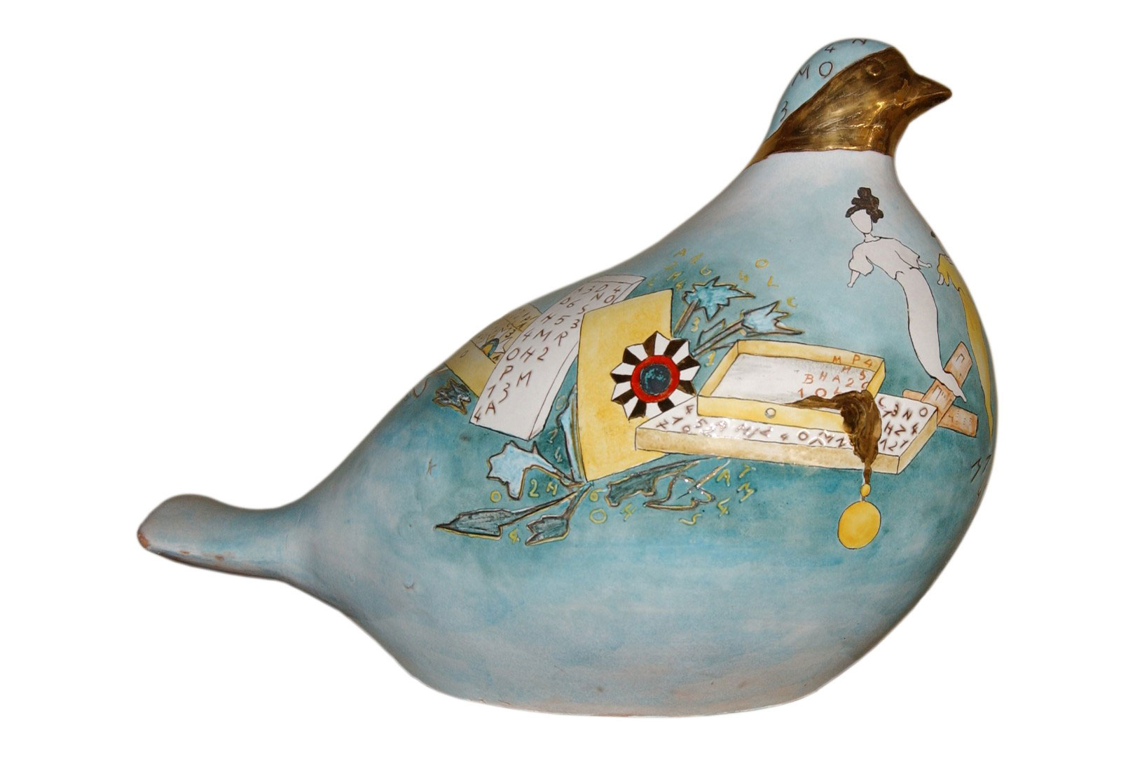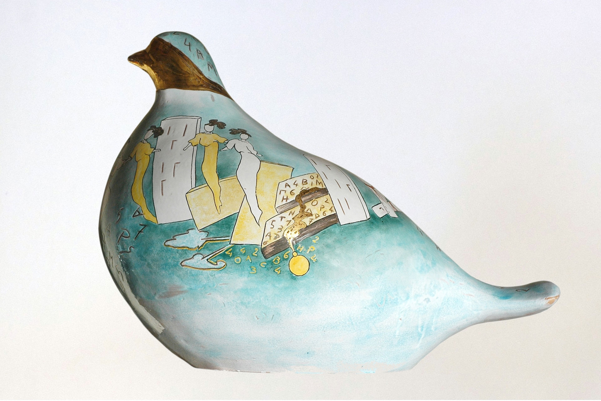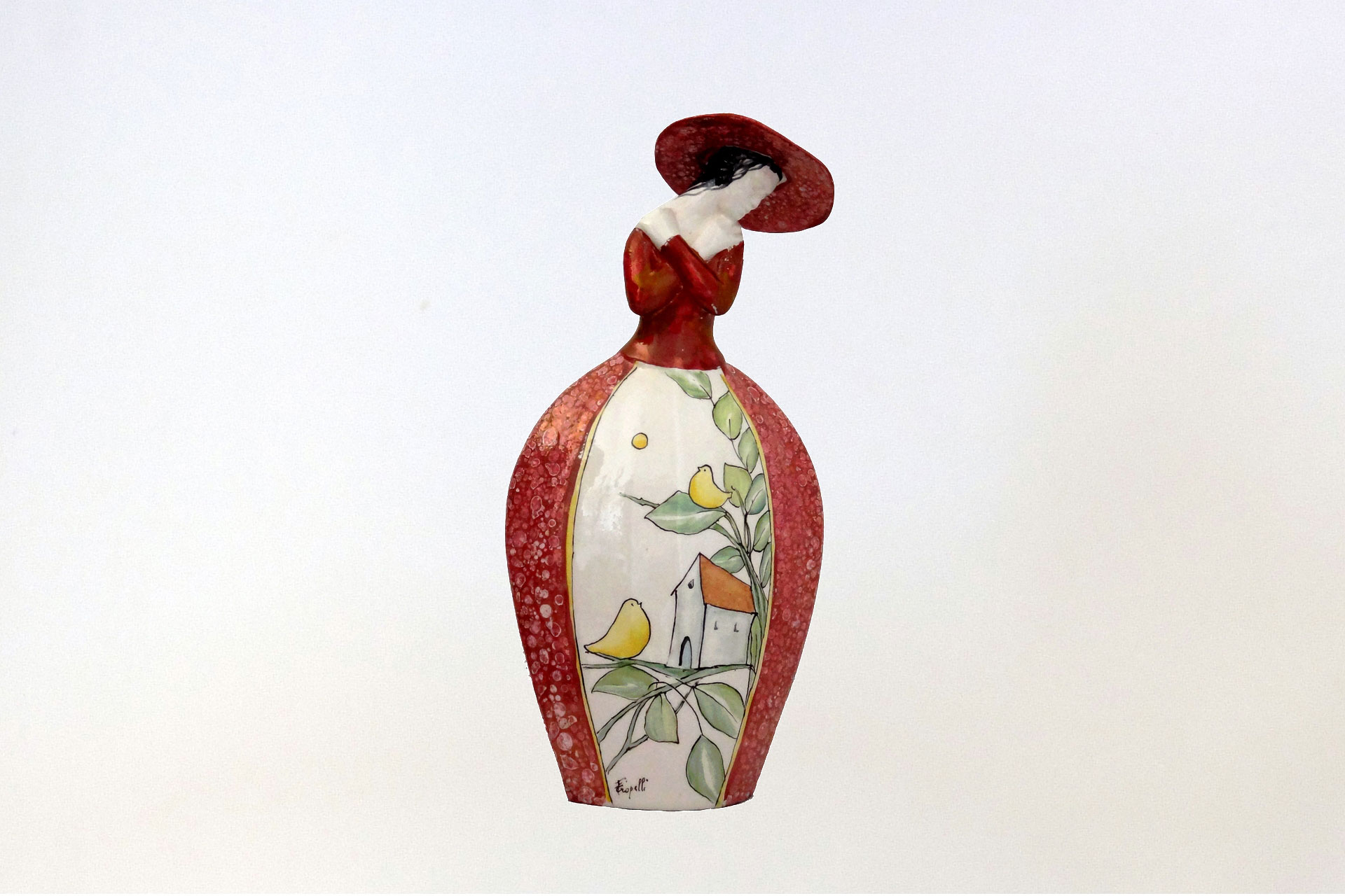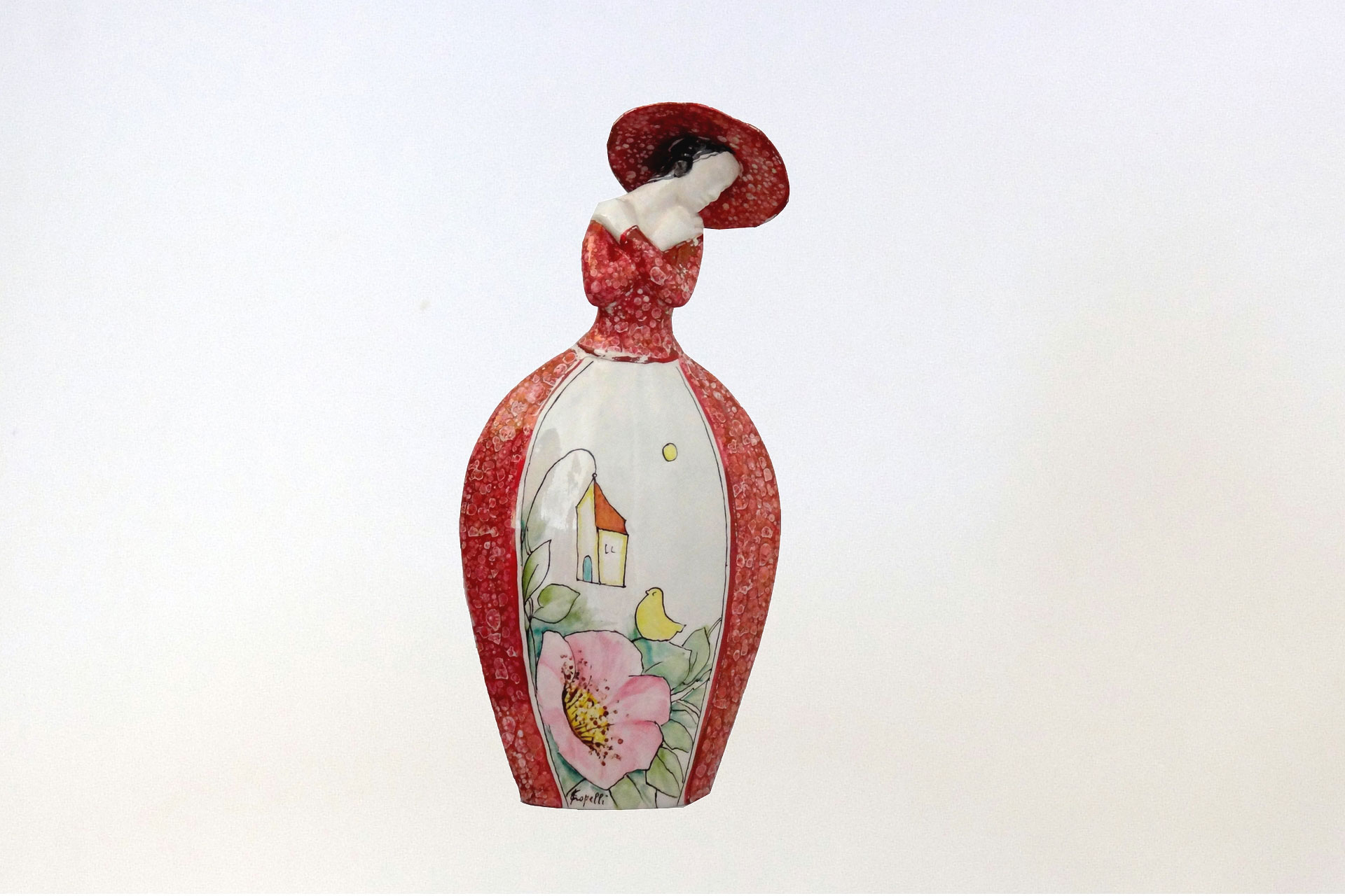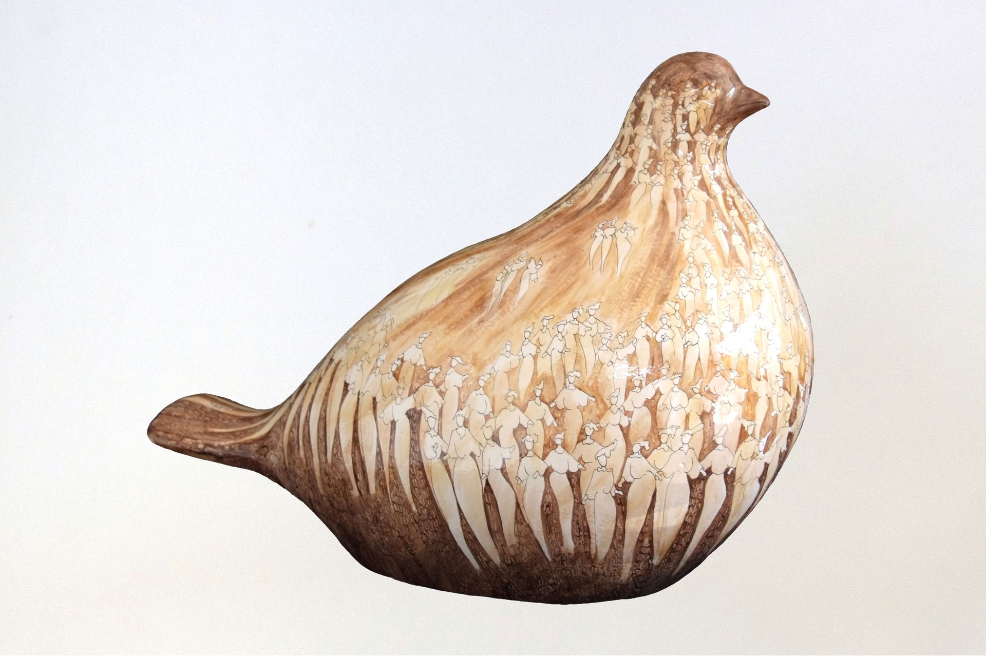 Donna colta e artista di vaglia, ottima disegnatrice e modellatrice, Fausta Cropelli ci offre qui – dopo i piccioni e gli spiritelli – la sua terza persuasiva serie di creature nate dall’alchimìa del gran fuoco e del piccolo fuoco, del biscuit, dalla preziosità degli smalti, delle cristalline, dei lustri, degli ori, degli engobi, insomma dalla varietà di quella plurisecolare tecnica ceramistica a più cotture, che lei ha appreso da autodidatta, ma che ha saputo aggiornare e reinventare con stile personale, uno stile che non esclude la commistione di materiali, la ricerca e la sperimentazione di nuove strade. Forme modulari e seriali, replicate con gli stampi, ma che divengono, come le definisce Fausta, “le mie tele”, le superfici sui cui esprimere e dilatare un’inesauribile, sontuoso repertorio pittorico, una saturazione decorativa fatta di pennellate talora astratte, di sapienti gocciolature, di segni, di motivi floreali, vegetali, figurativi, in un proliferare gestuale che va letto sia nel dettaglio sia nell’assieme.