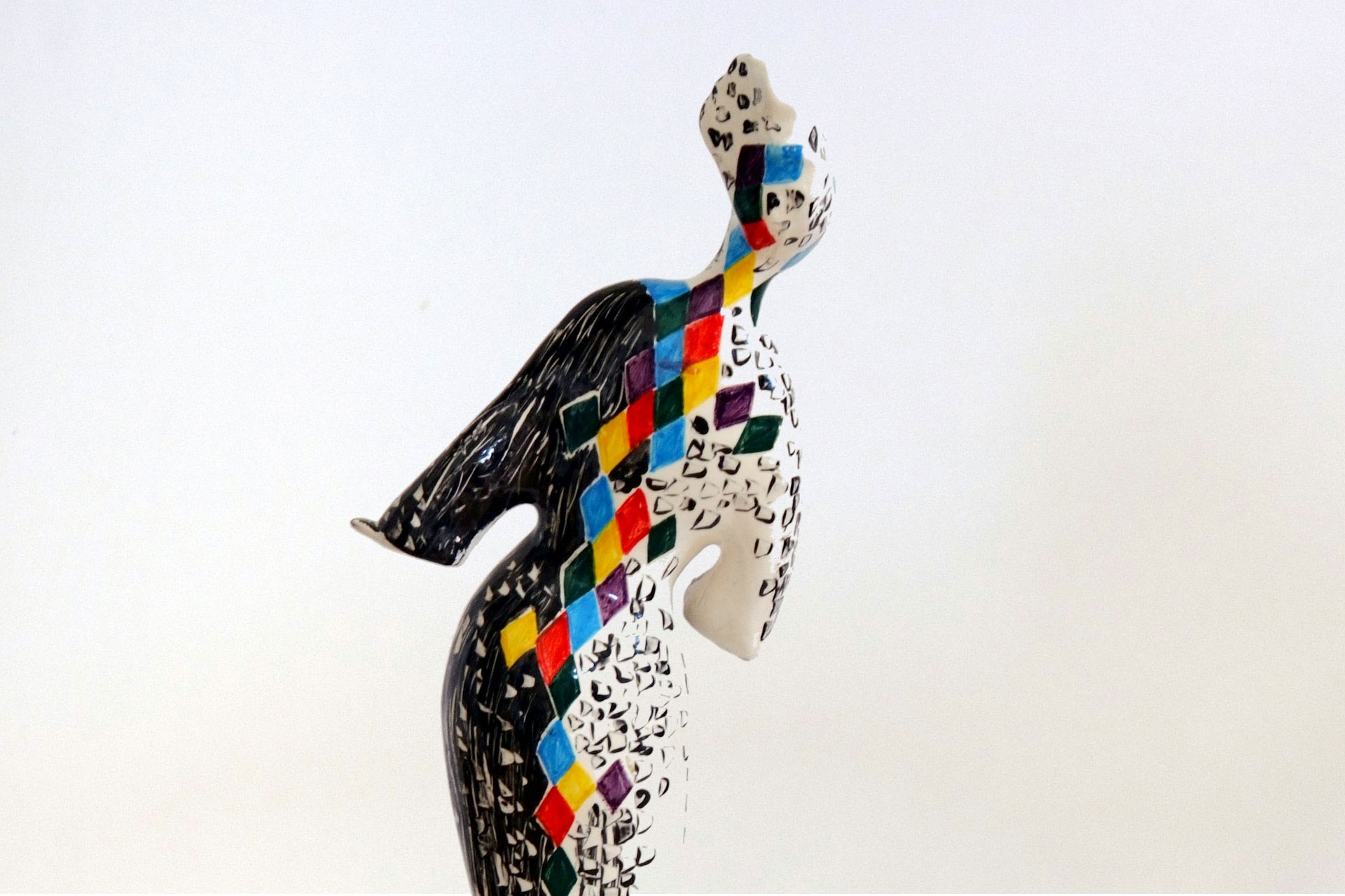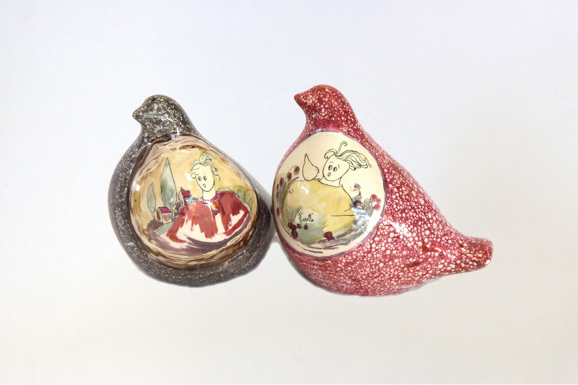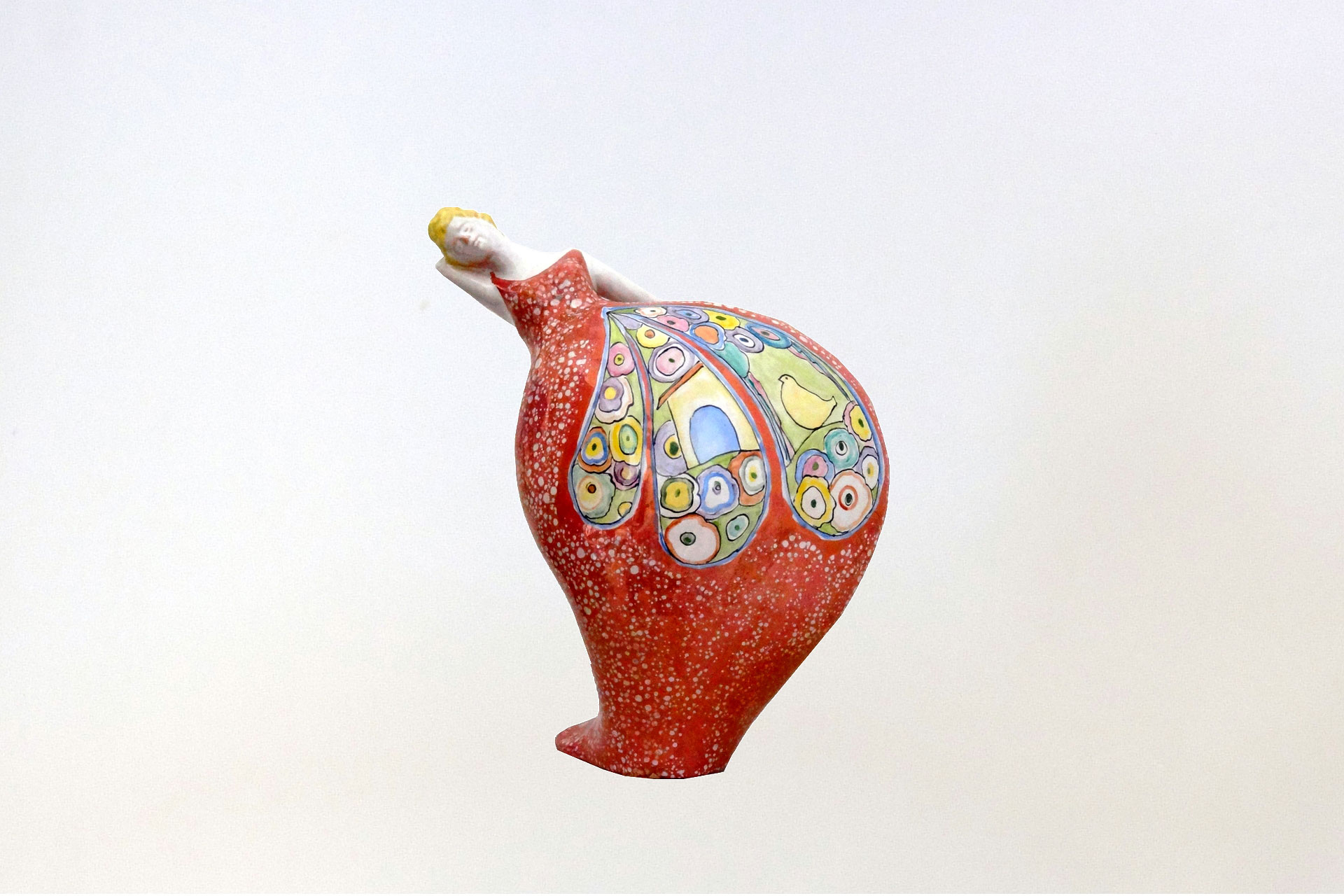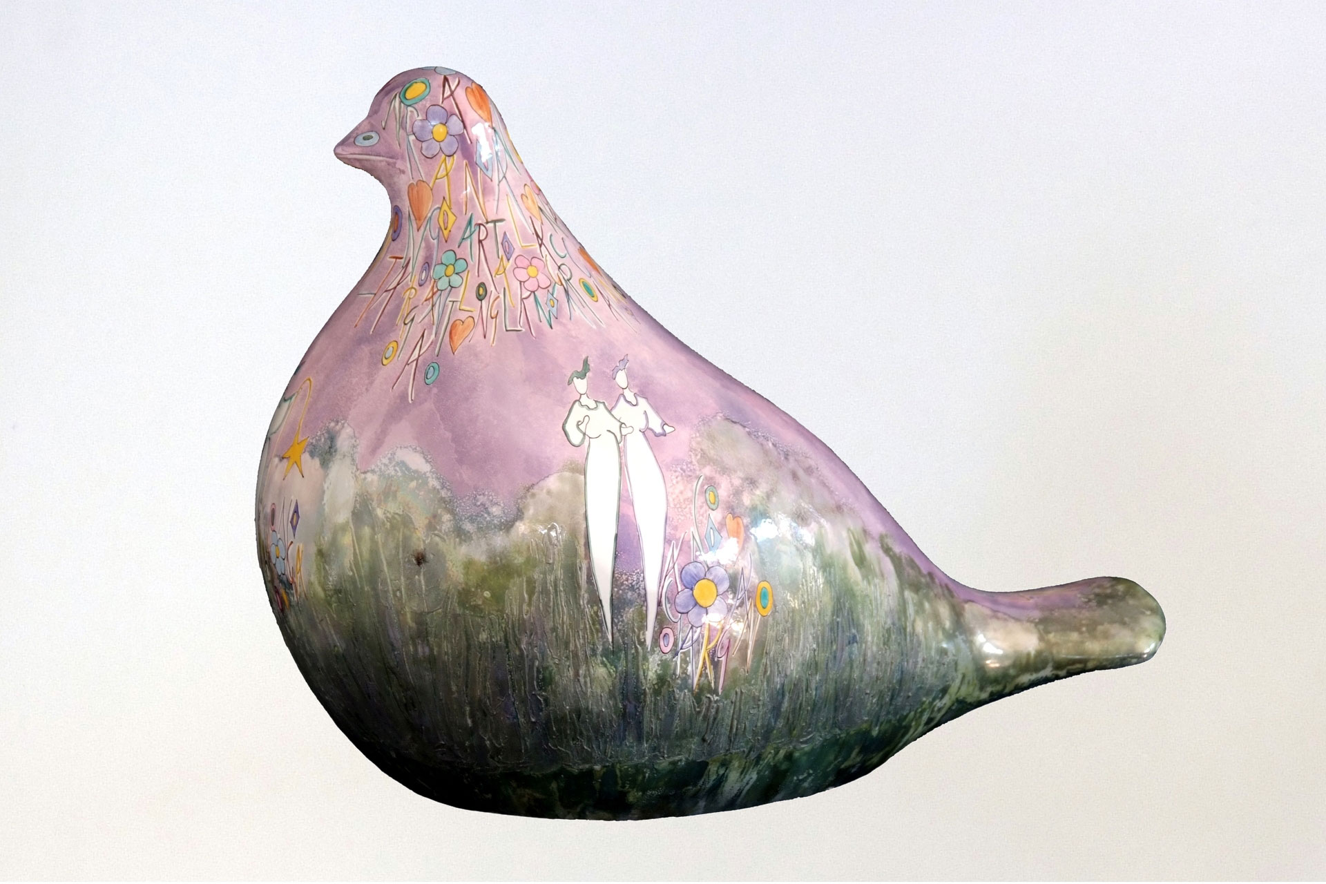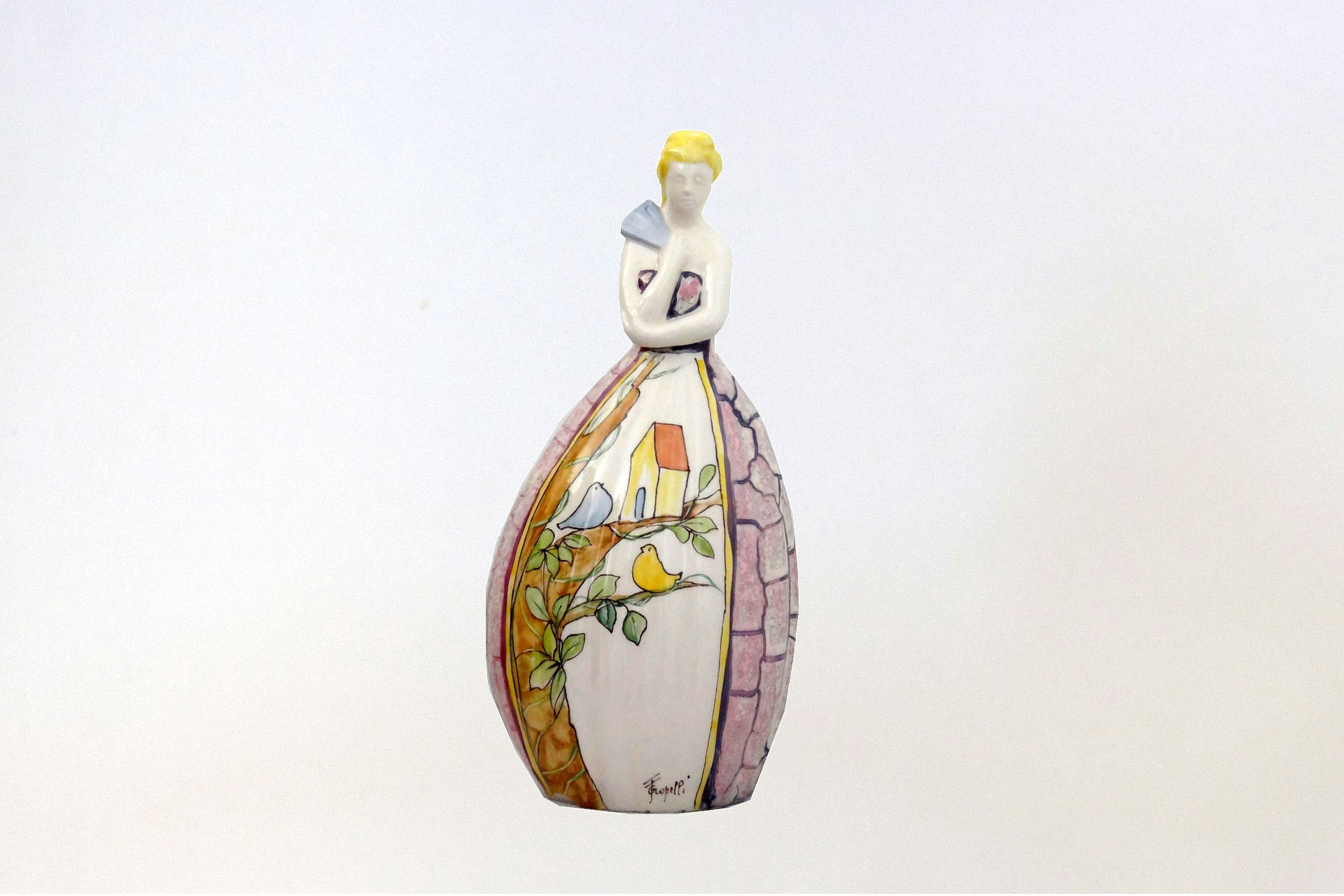Donna colta e artista di vaglia, ottima disegnatrice e modellatrice, Fausta Cropelli ci offre qui – dopo i piccioni e gli spiritelli – la sua terza persuasiva serie di creature nate dall’alchimìa del gran fuoco e del piccolo fuoco, del biscuit, dalla preziosità degli smalti, delle cristalline, dei lustri, degli ori, degli engobi, insomma dalla varietà di quella plurisecolare tecnica ceramistica a più cotture, che lei ha appreso da autodidatta, ma che ha saputo aggiornare e reinventare con stile personale, uno stile che non esclude la commistione di materiali, la ricerca e la sperimentazione di nuove strade. Forme modulari e seriali, replicate con gli stampi, ma che divengono, come le definisce Fausta, “le mie tele”, le superfici sui cui esprimere e dilatare un’inesauribile, sontuoso repertorio pittorico, una saturazione decorativa fatta di pennellate talora astratte, di sapienti gocciolature, di segni, di motivi floreali, vegetali, figurativi, in un proliferare gestuale che va letto sia nel dettaglio sia nell’assieme.
