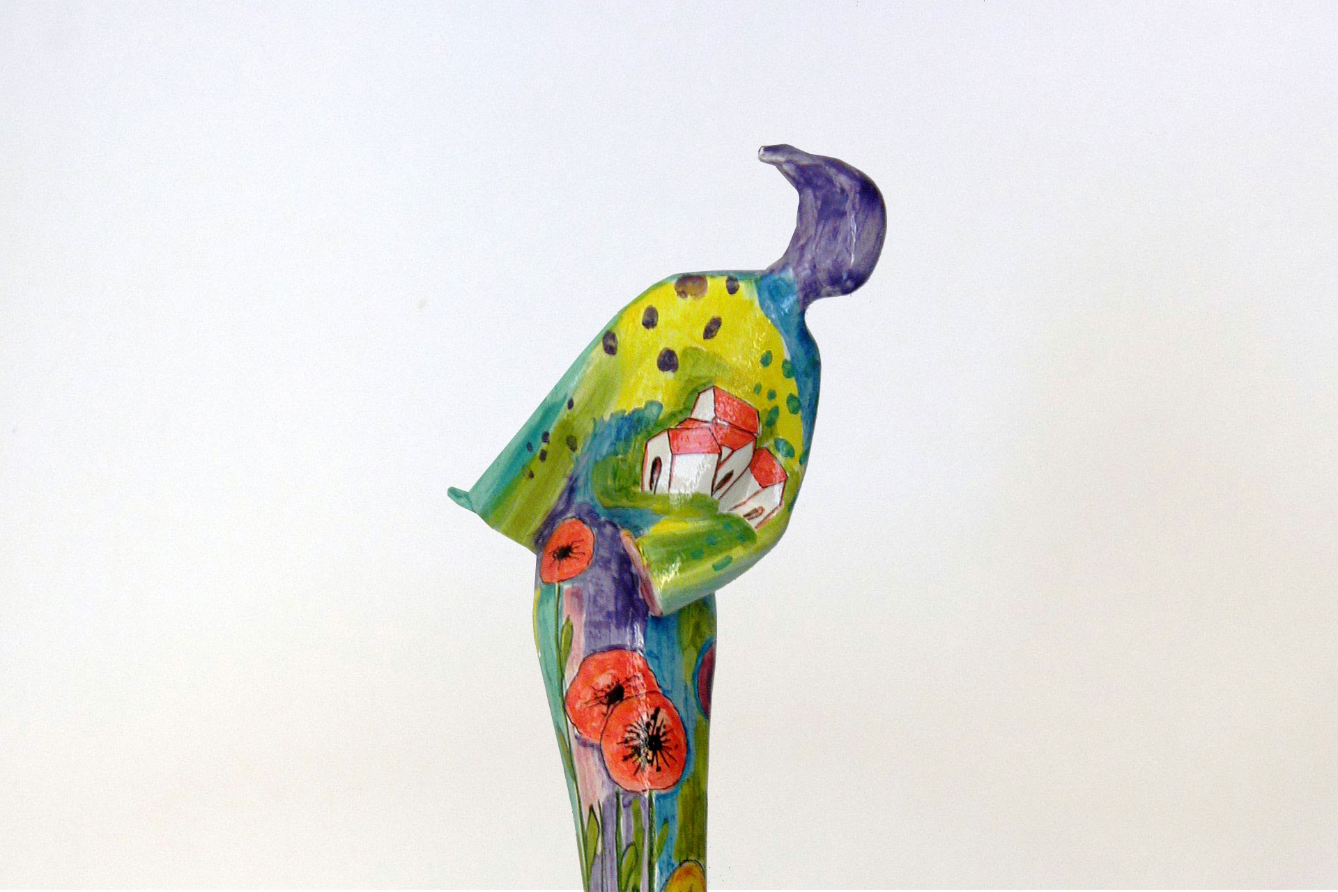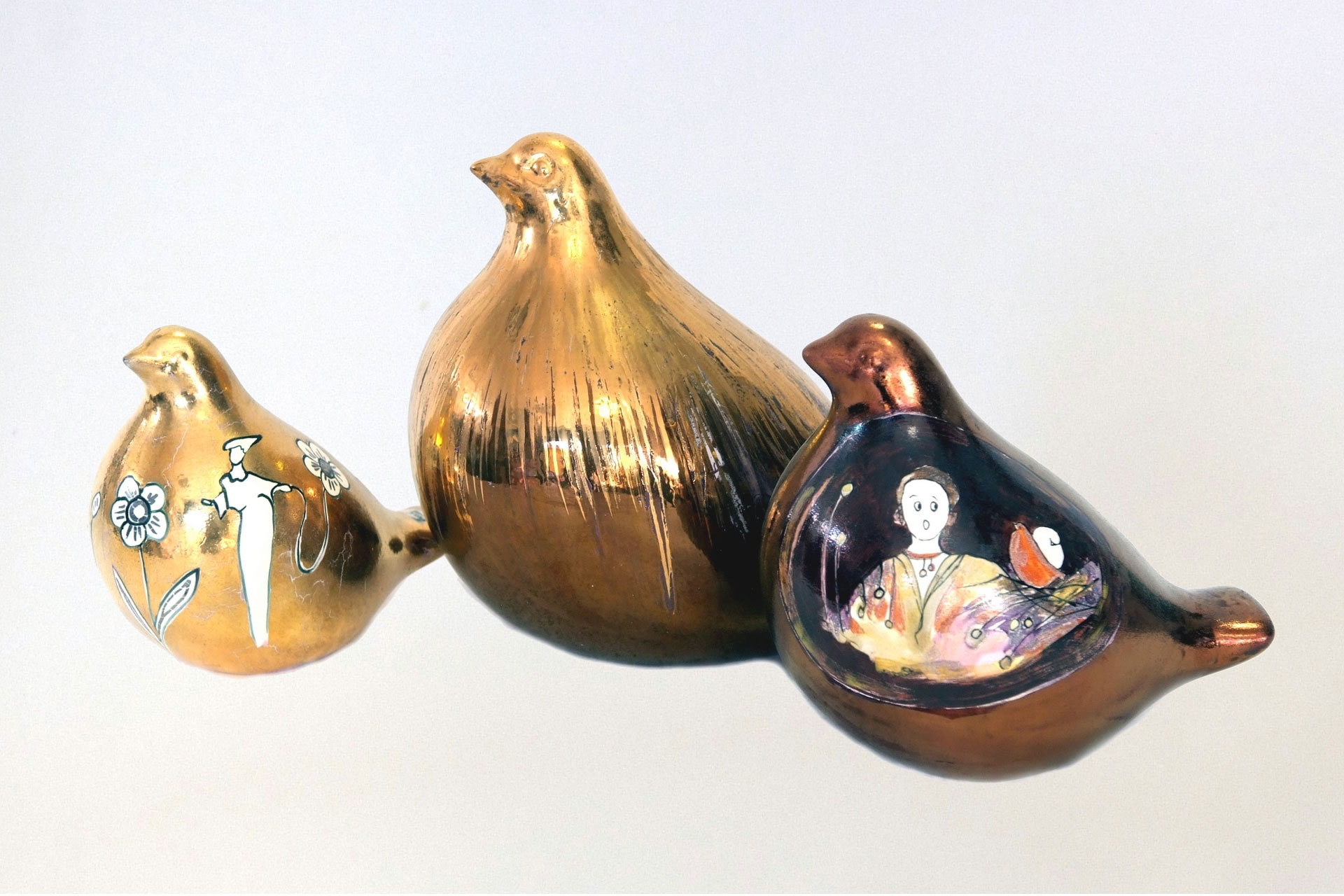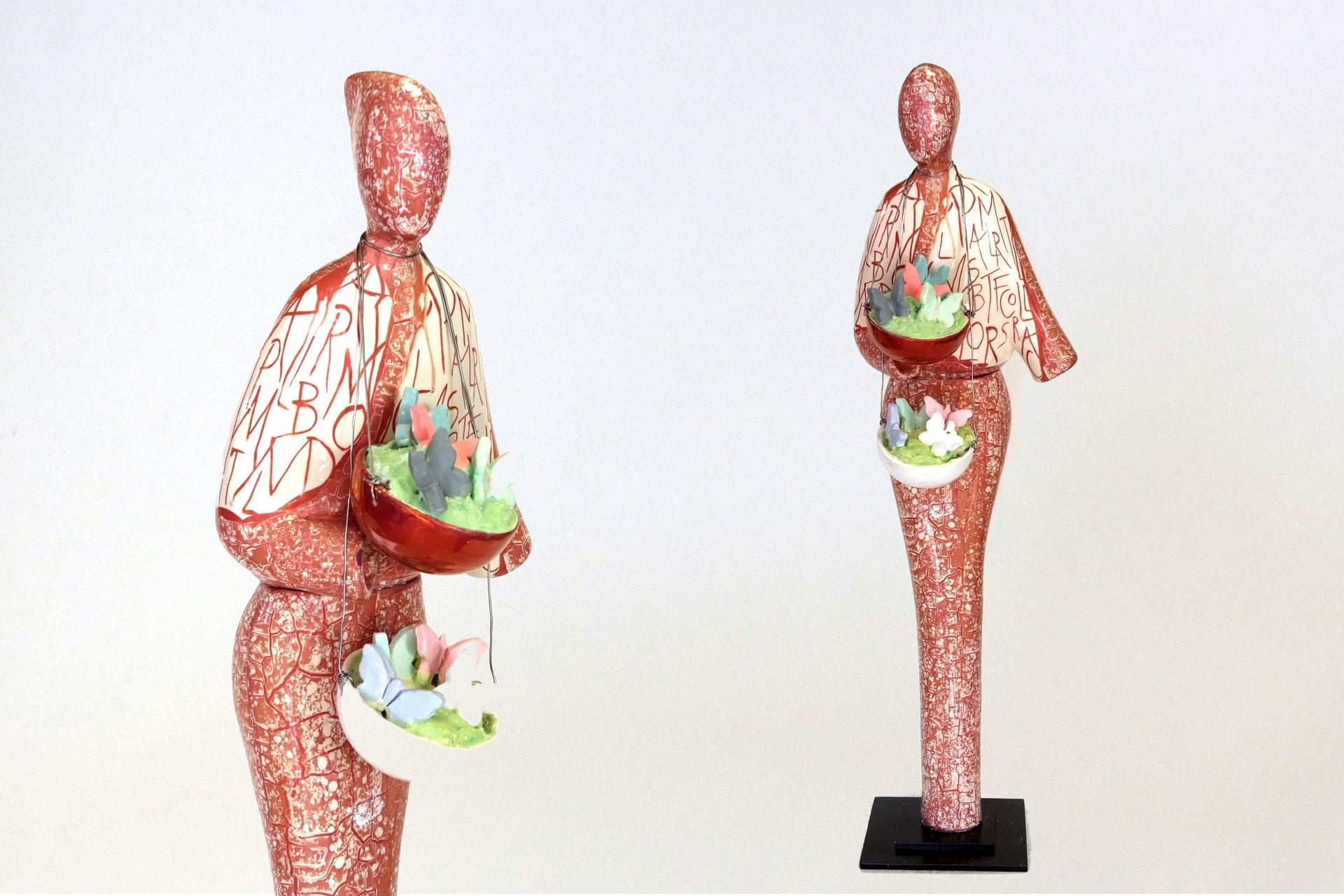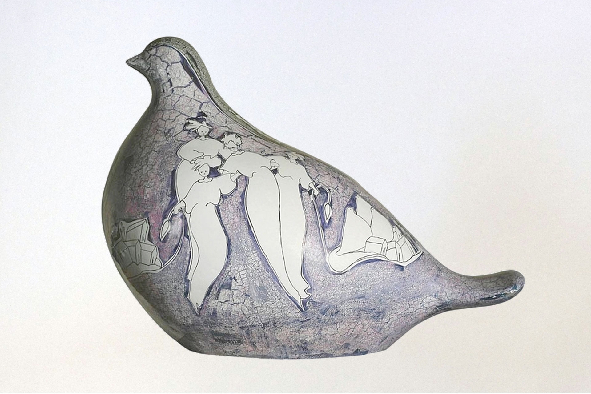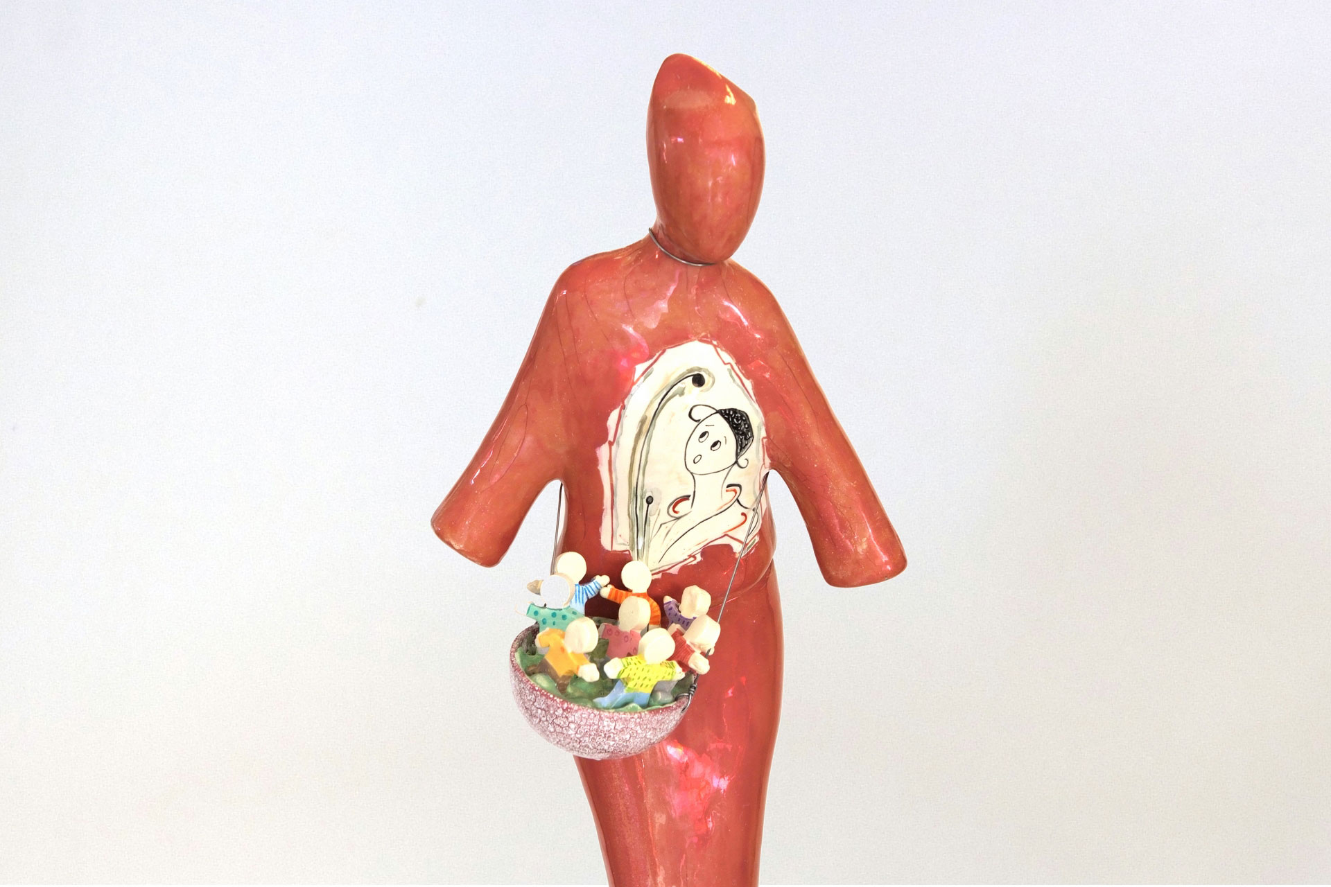Donna colta e artista di vaglia, ottima disegnatrice e modellatrice, Fausta Cropelli ci offre qui – dopo i piccioni e gli spiritelli – la sua terza persuasiva serie di creature nate dall’alchimìa del gran fuoco e del piccolo fuoco, del biscuit, dalla preziosità degli smalti, delle cristalline, dei lustri, degli ori, degli engobi, insomma dalla varietà di quella plurisecolare tecnica ceramistica a più cotture, che lei ha appreso da autodidatta, ma che ha saputo aggiornare e reinventare con stile personale, uno stile che non esclude la commistione di materiali, la ricerca e la sperimentazione di nuove strade. Forme modulari e seriali, replicate con gli stampi, ma che divengono, come le definisce Fausta, “le mie tele”, le superfici sui cui esprimere e dilatare un’inesauribile, sontuoso repertorio pittorico, una saturazione decorativa fatta di pennellate talora astratte, di sapienti gocciolature, di segni, di motivi floreali, vegetali, figurativi, in un proliferare gestuale che va letto sia nel dettaglio sia nell’assieme.