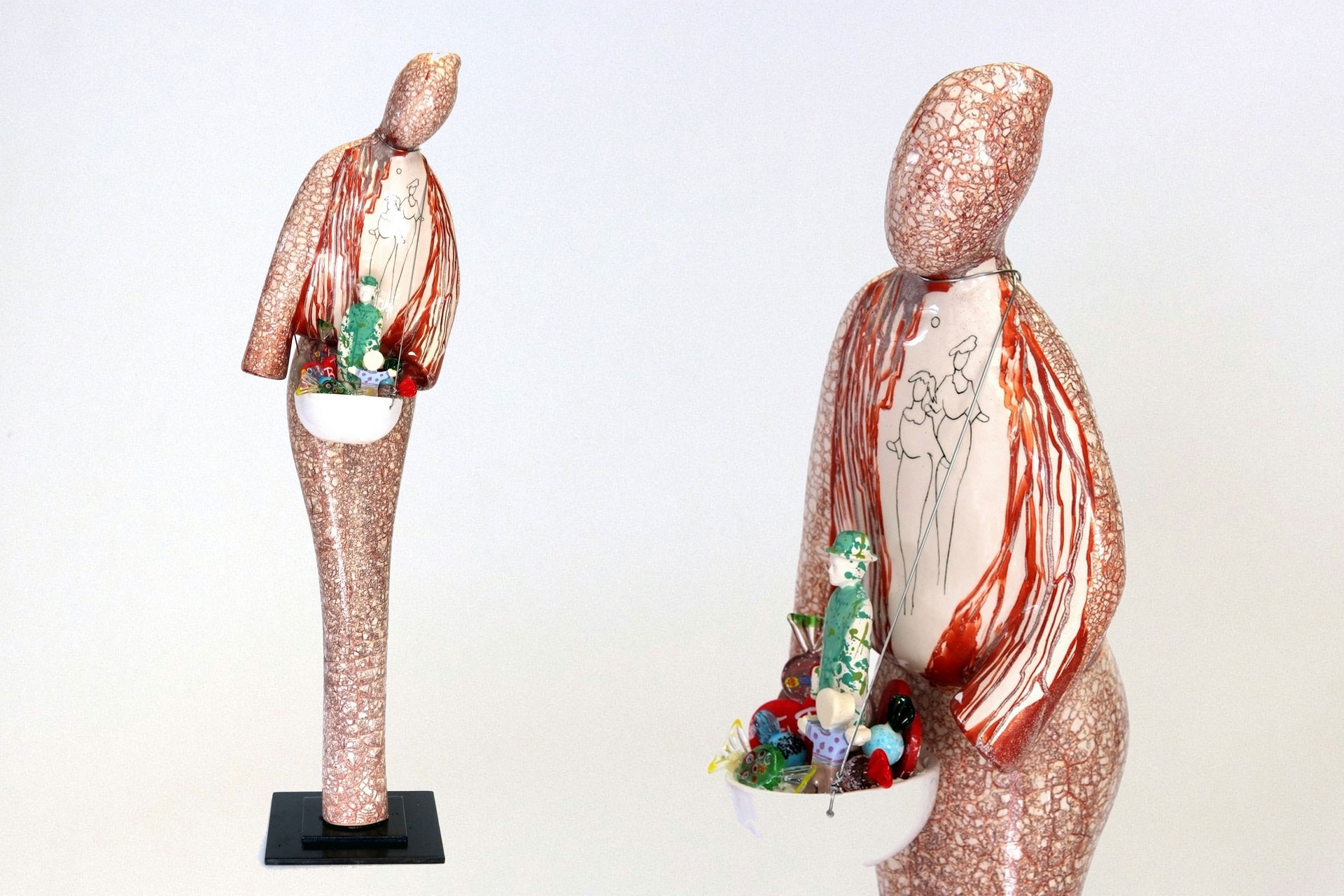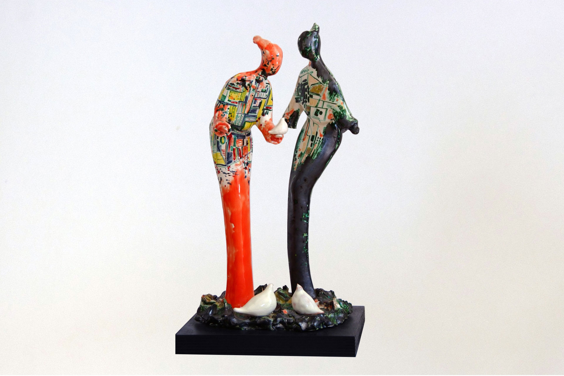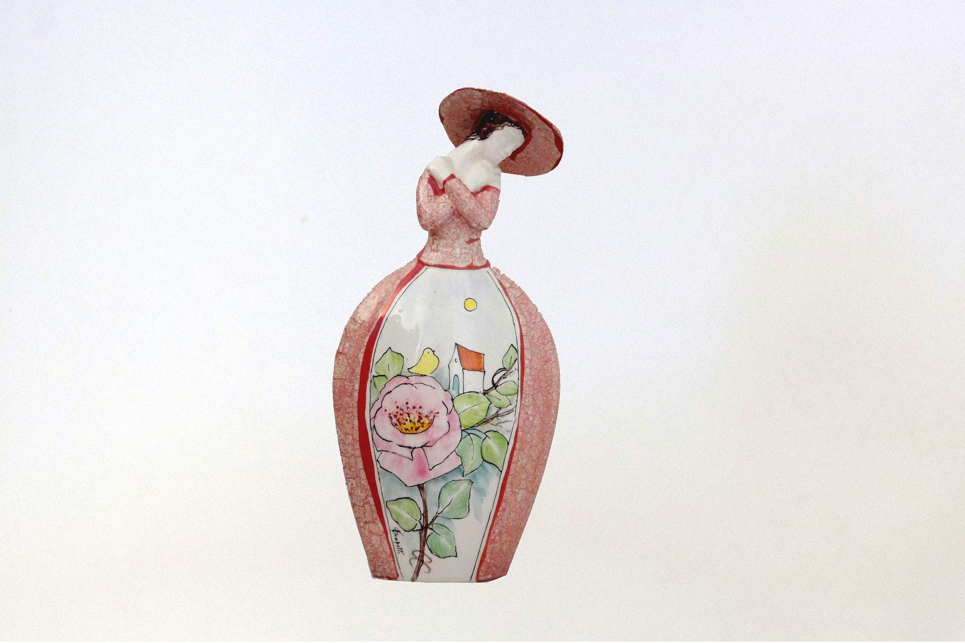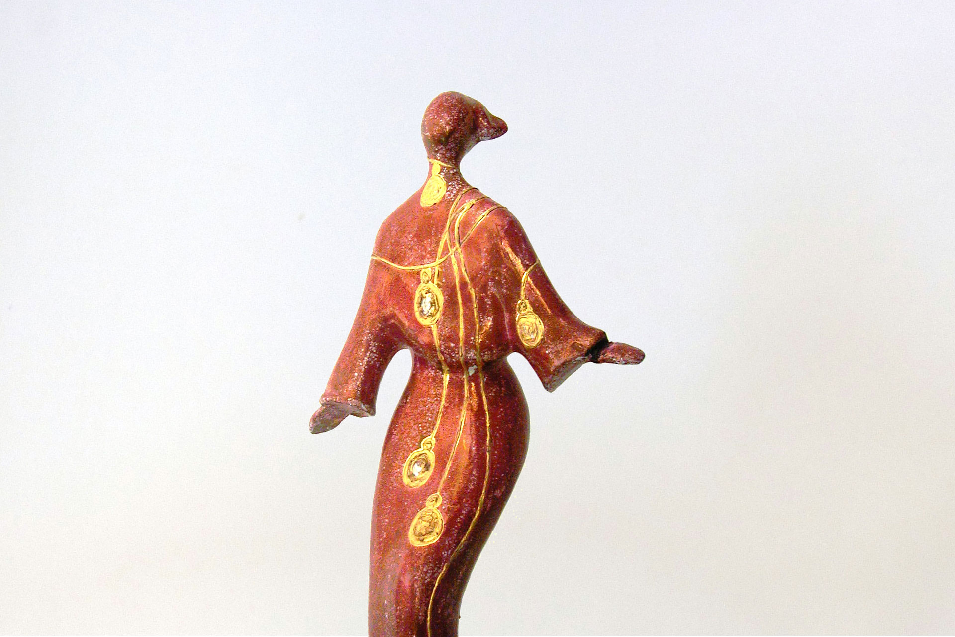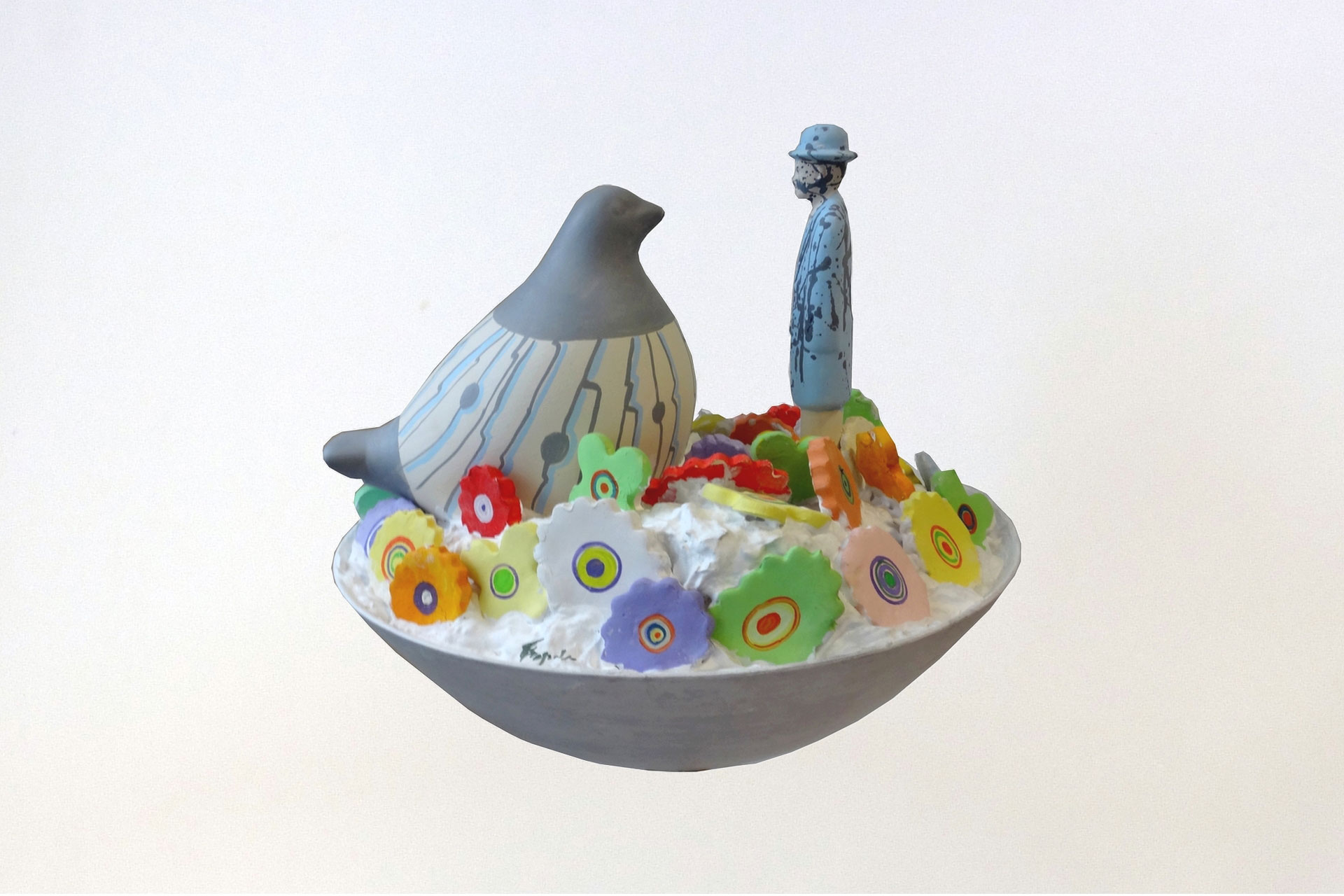 Donna colta e artista di vaglia, ottima disegnatrice e modellatrice, Fausta Cropelli ci offre qui – dopo i piccioni e gli spiritelli – la sua terza persuasiva serie di creature nate dall’alchimìa del gran fuoco e del piccolo fuoco, del biscuit, dalla preziosità degli smalti, delle cristalline, dei lustri, degli ori, degli engobi, insomma dalla varietà di quella plurisecolare tecnica ceramistica a più cotture, che lei ha appreso da autodidatta, ma che ha saputo aggiornare e reinventare con stile personale, uno stile che non esclude la commistione di materiali, la ricerca e la sperimentazione di nuove strade. Forme modulari e seriali, replicate con gli stampi, ma che divengono, come le definisce Fausta, “le mie tele”, le superfici sui cui esprimere e dilatare un’inesauribile, sontuoso repertorio pittorico, una saturazione decorativa fatta di pennellate talora astratte, di sapienti gocciolature, di segni, di motivi floreali, vegetali, figurativi, in un proliferare gestuale che va letto sia nel dettaglio sia nell’assieme.