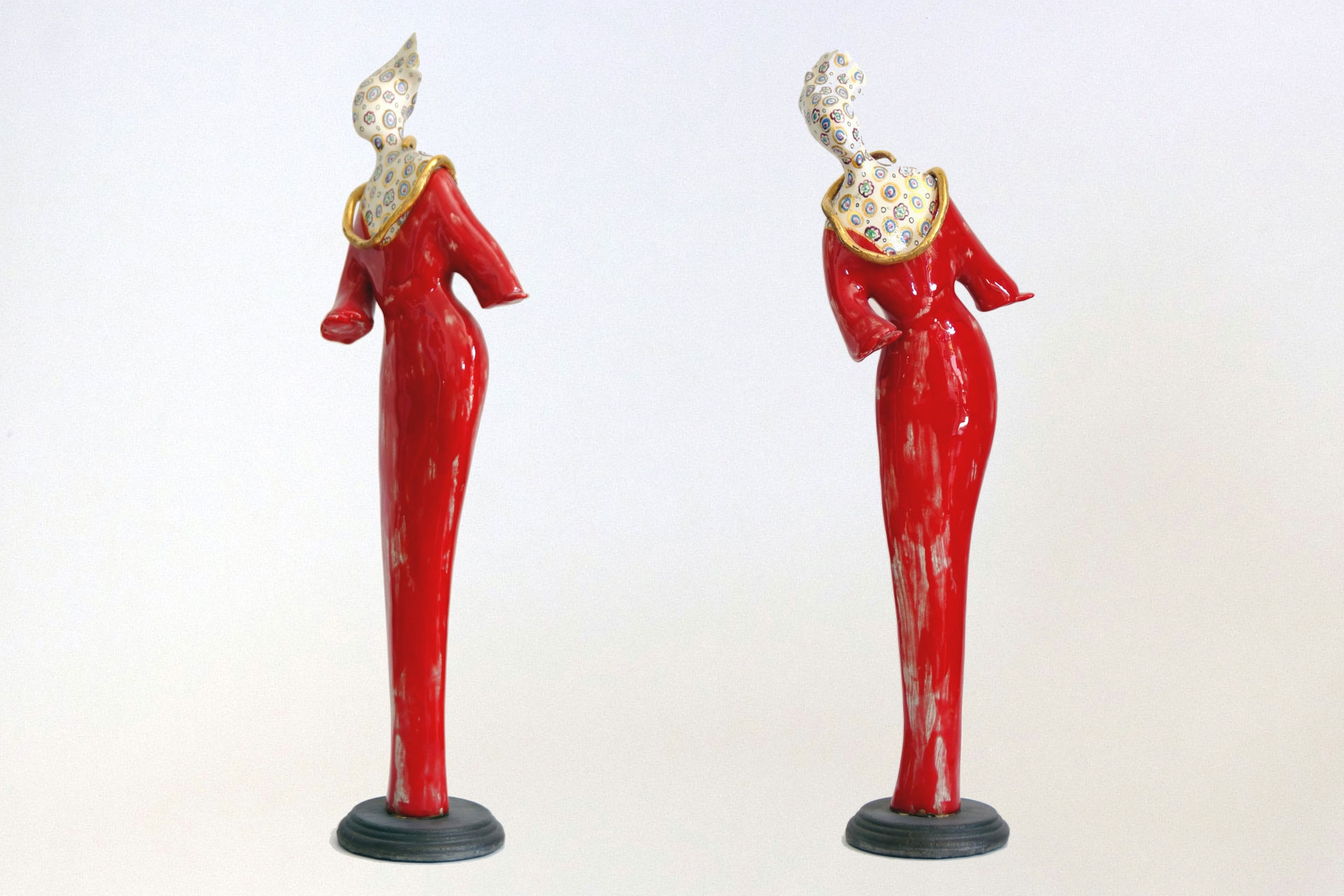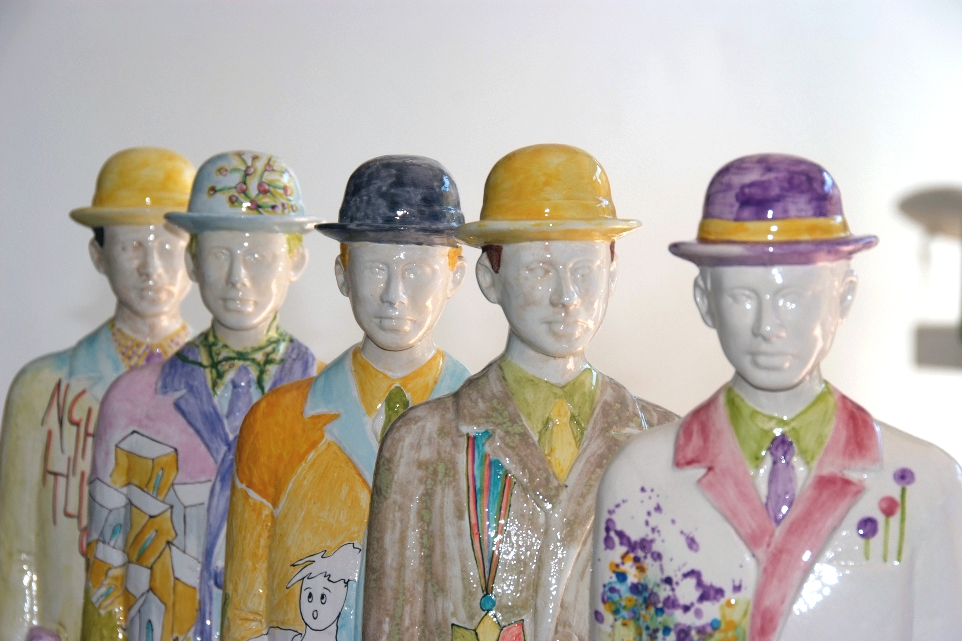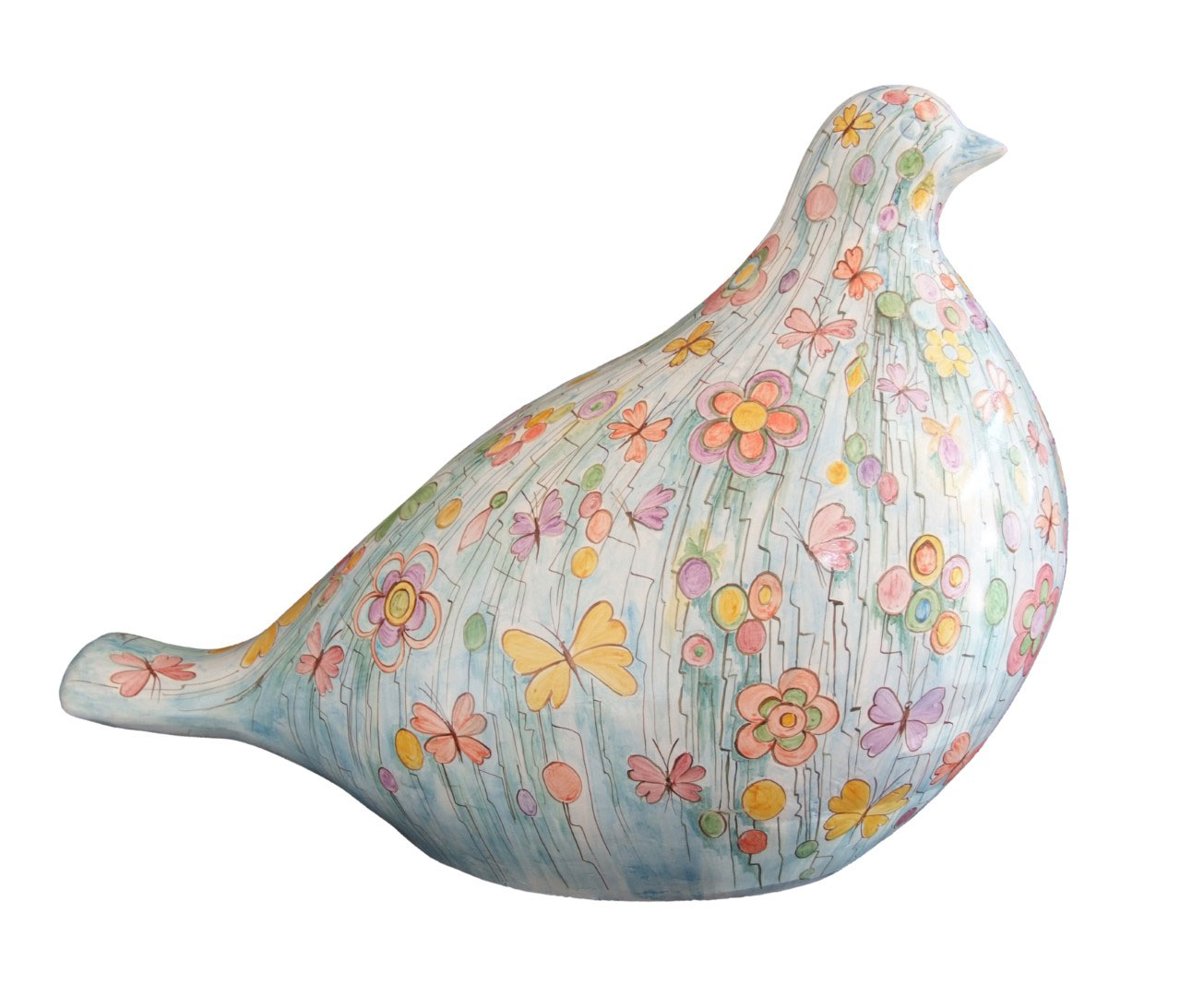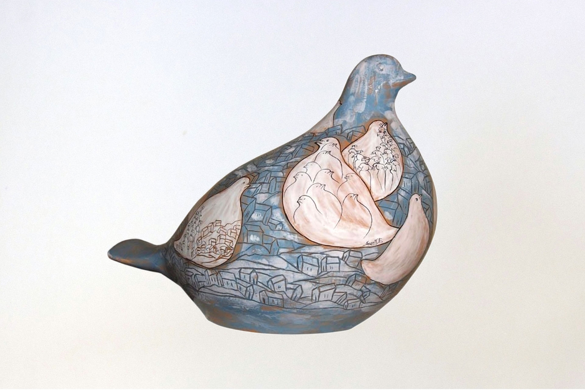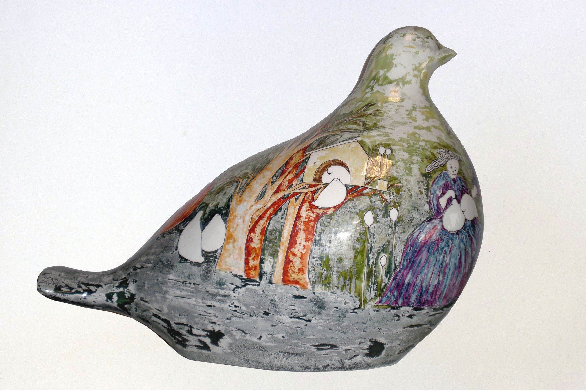 Donna colta e artista di vaglia, ottima disegnatrice e modellatrice, Fausta Cropelli ci offre qui – dopo i piccioni e gli spiritelli – la sua terza persuasiva serie di creature nate dall’alchimìa del gran fuoco e del piccolo fuoco, del biscuit, dalla preziosità degli smalti, delle cristalline, dei lustri, degli ori, degli engobi, insomma dalla varietà di quella plurisecolare tecnica ceramistica a più cotture, che lei ha appreso da autodidatta, ma che ha saputo aggiornare e reinventare con stile personale, uno stile che non esclude la commistione di materiali, la ricerca e la sperimentazione di nuove strade. Forme modulari e seriali, replicate con gli stampi, ma che divengono, come le definisce Fausta, “le mie tele”, le superfici sui cui esprimere e dilatare un’inesauribile, sontuoso repertorio pittorico, una saturazione decorativa fatta di pennellate talora astratte, di sapienti gocciolature, di segni, di motivi floreali, vegetali, figurativi, in un proliferare gestuale che va letto sia nel dettaglio sia nell’assieme.