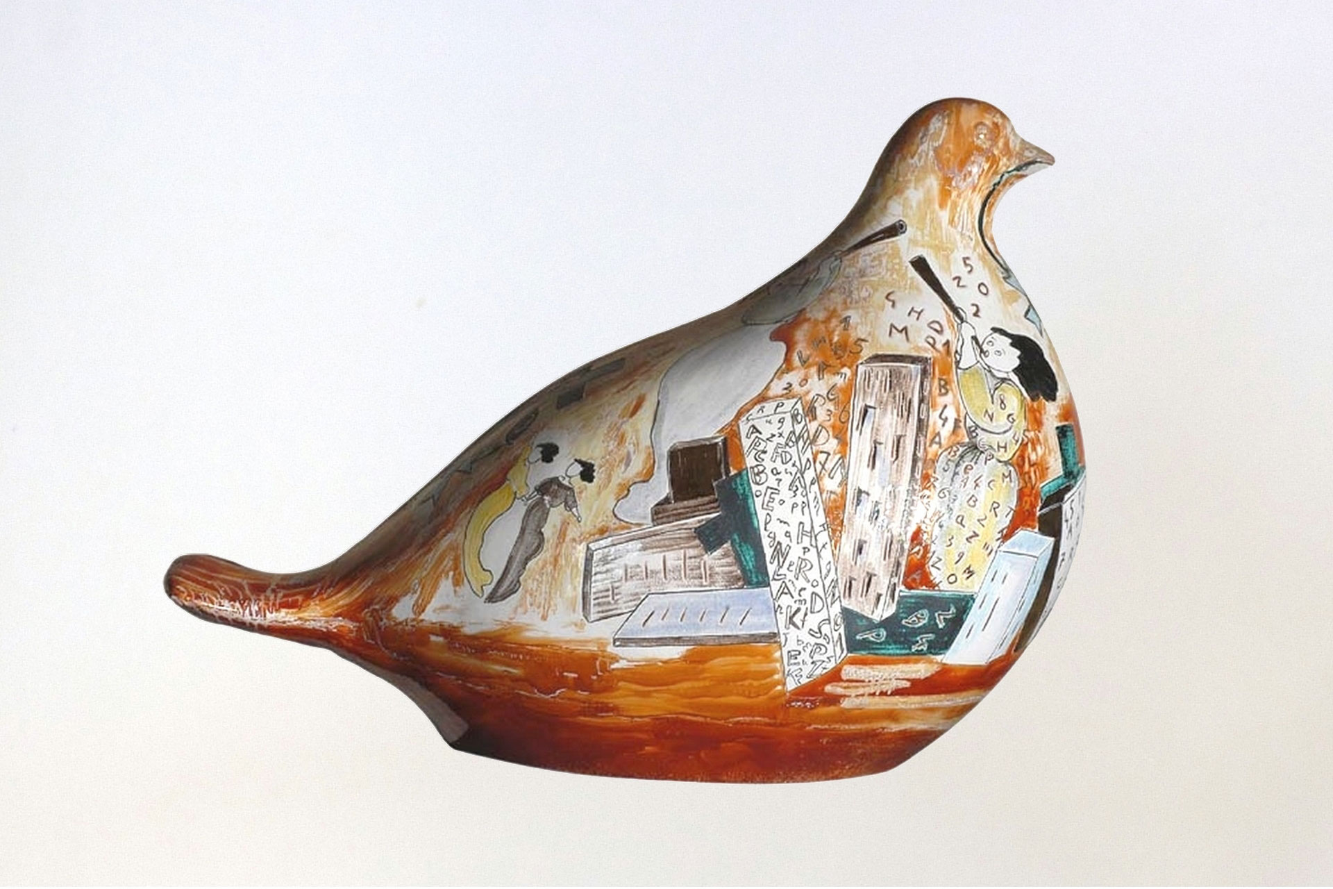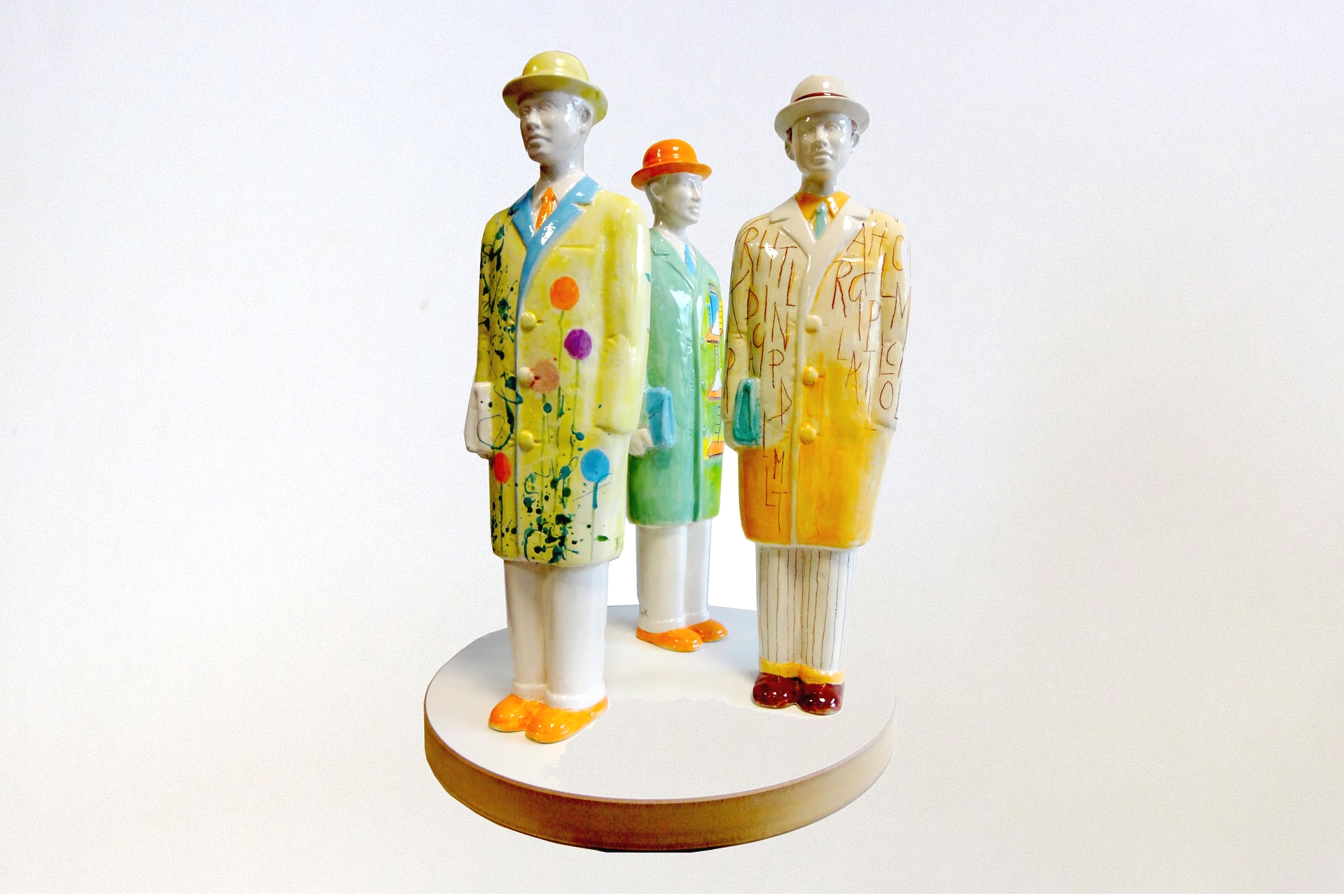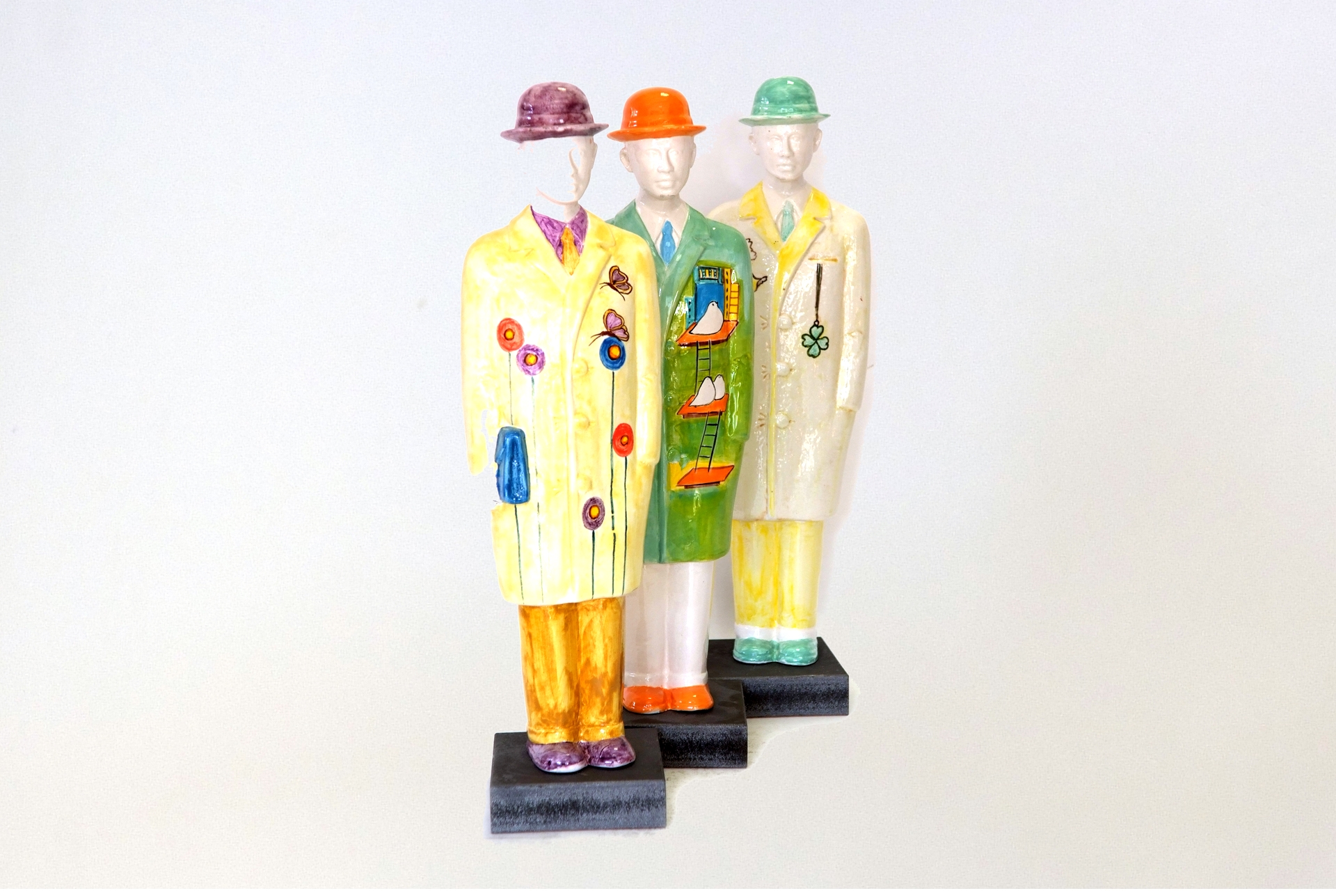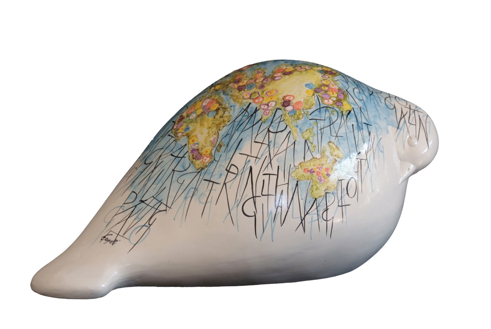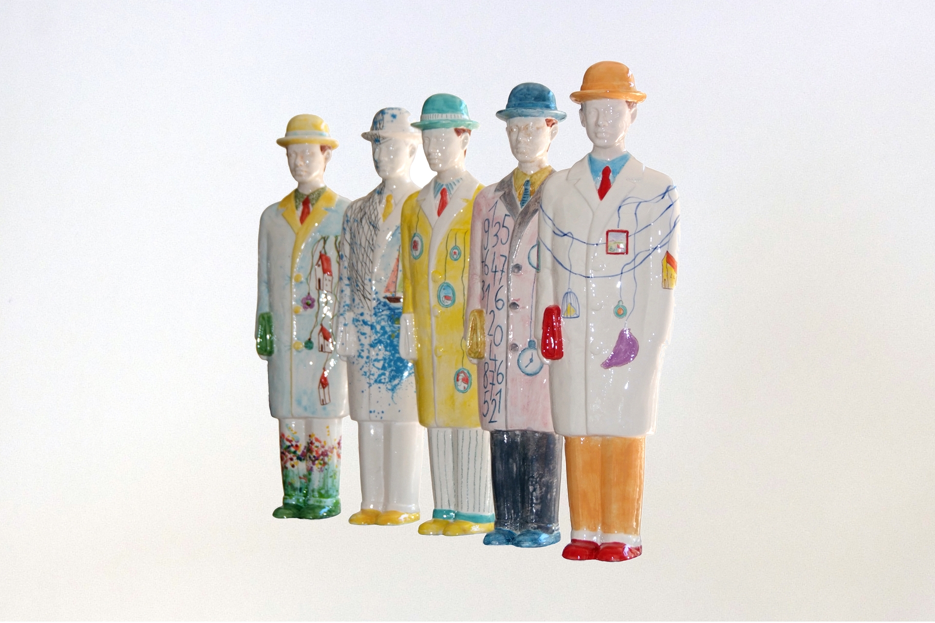 Donna colta e artista di vaglia, ottima disegnatrice e modellatrice, Fausta Cropelli ci offre qui – dopo i piccioni e gli spiritelli – la sua terza persuasiva serie di creature nate dall’alchimìa del gran fuoco e del piccolo fuoco, del biscuit, dalla preziosità degli smalti, delle cristalline, dei lustri, degli ori, degli engobi, insomma dalla varietà di quella plurisecolare tecnica ceramistica a più cotture, che lei ha appreso da autodidatta, ma che ha saputo aggiornare e reinventare con stile personale, uno stile che non esclude la commistione di materiali, la ricerca e la sperimentazione di nuove strade. Forme modulari e seriali, replicate con gli stampi, ma che divengono, come le definisce Fausta, “le mie tele”, le superfici sui cui esprimere e dilatare un’inesauribile, sontuoso repertorio pittorico, una saturazione decorativa fatta di pennellate talora astratte, di sapienti gocciolature, di segni, di motivi floreali, vegetali, figurativi, in un proliferare gestuale che va letto sia nel dettaglio sia nell’assieme.