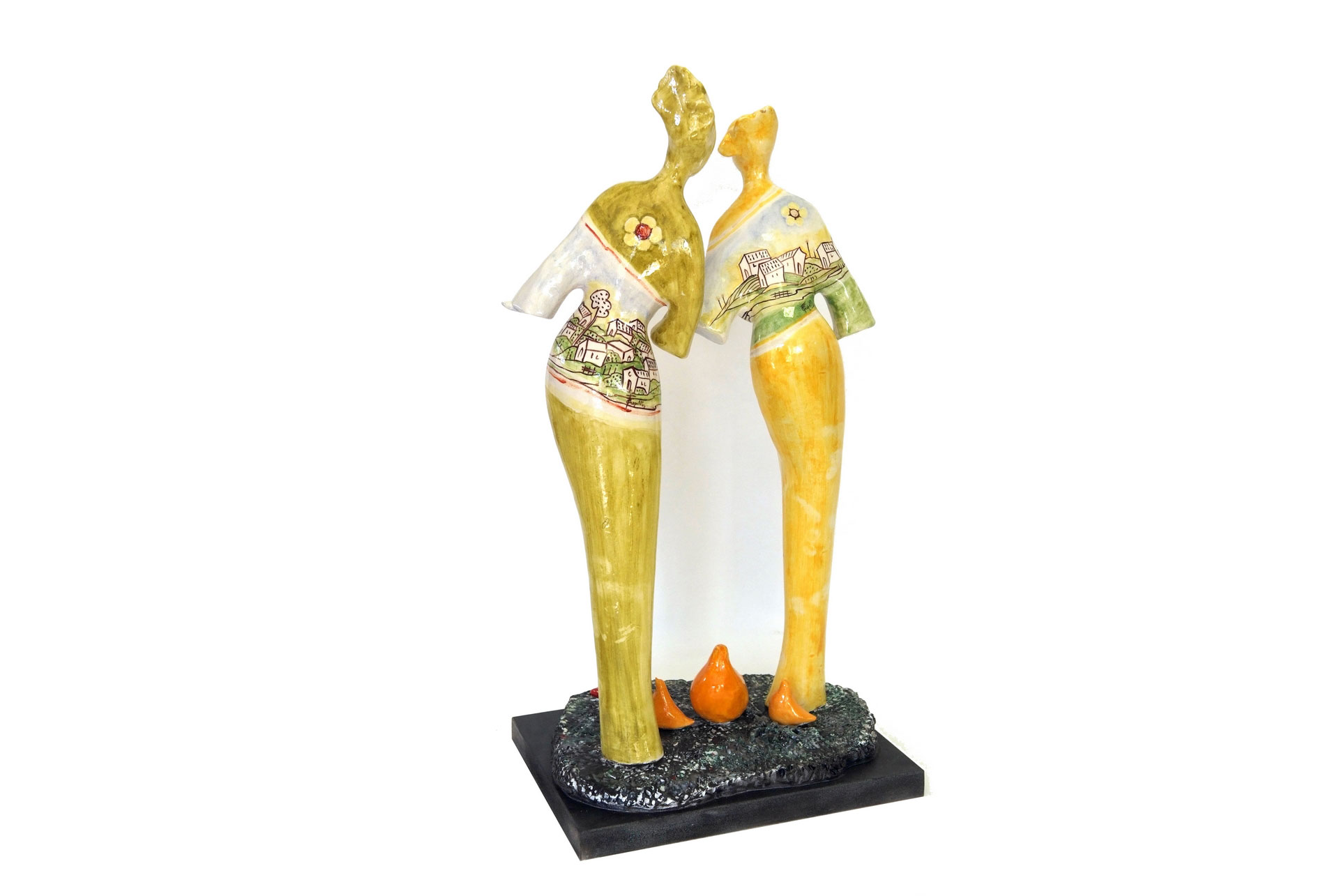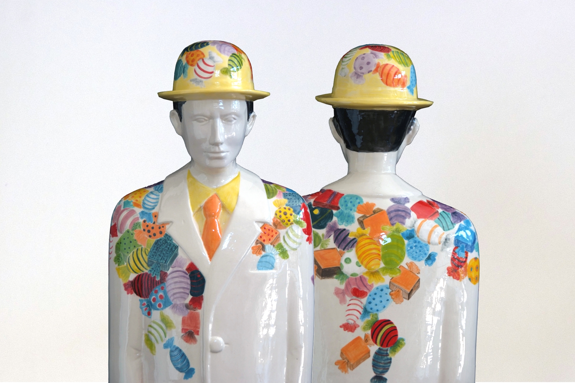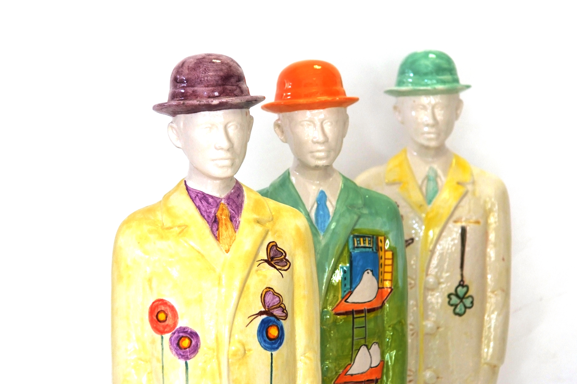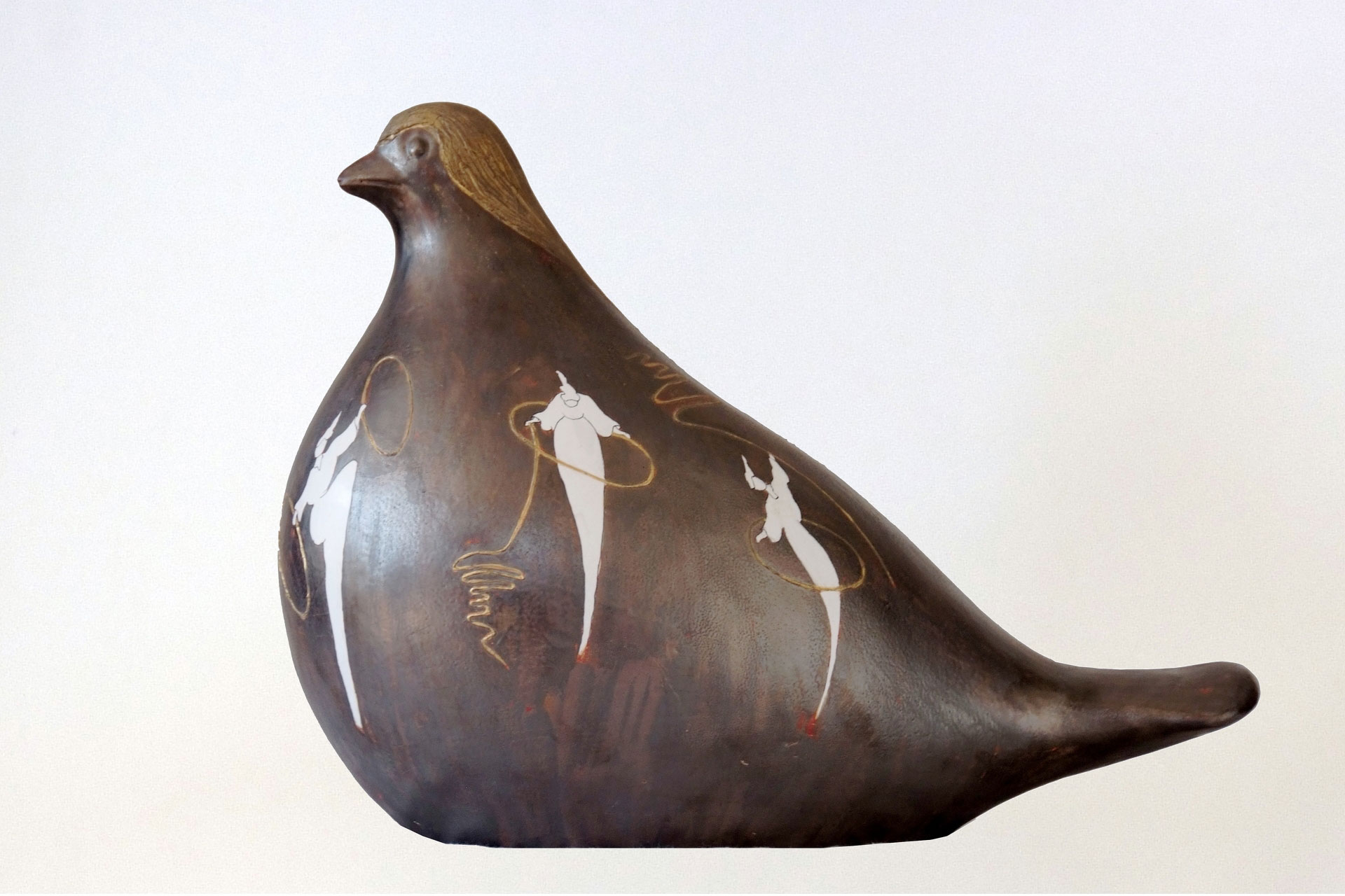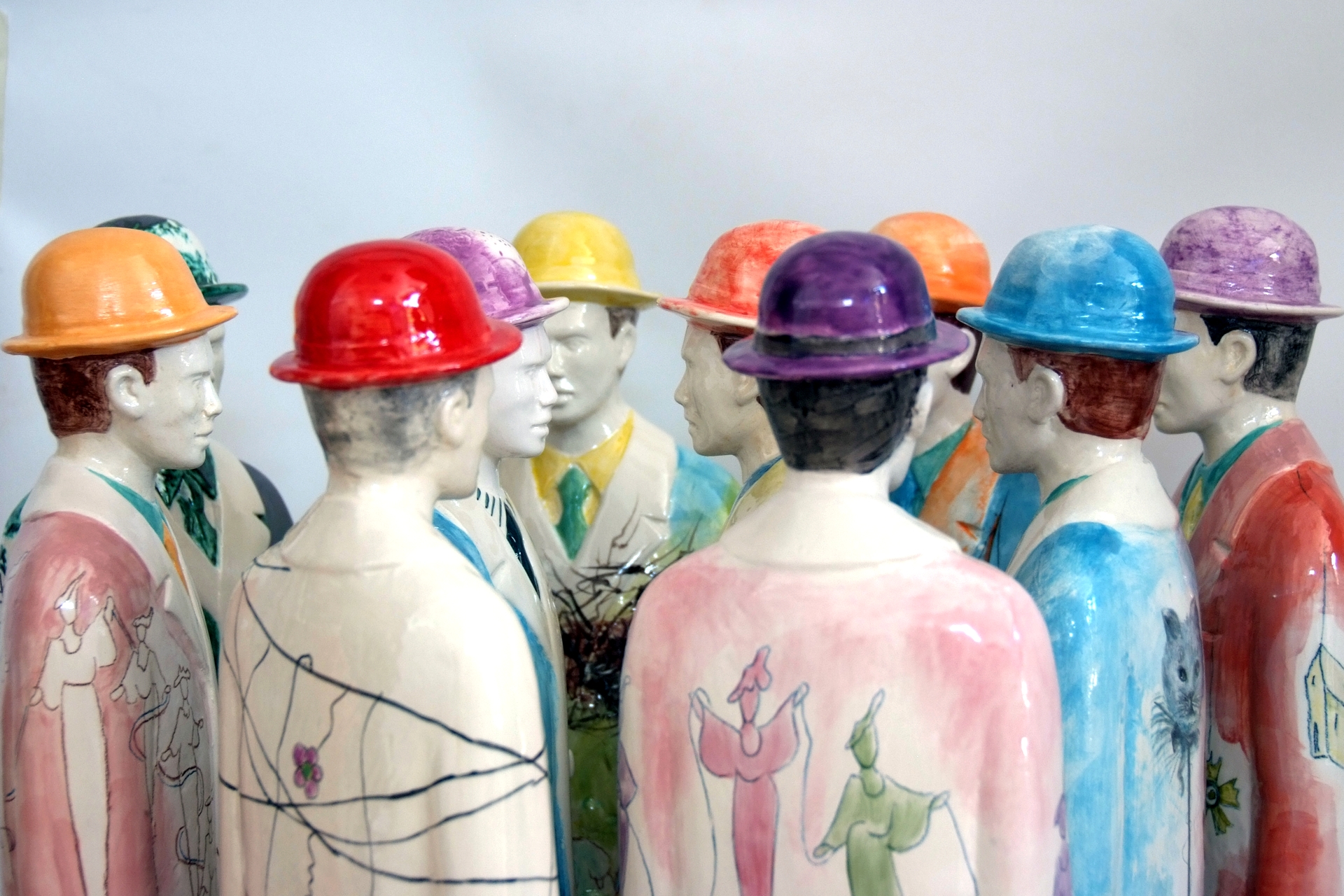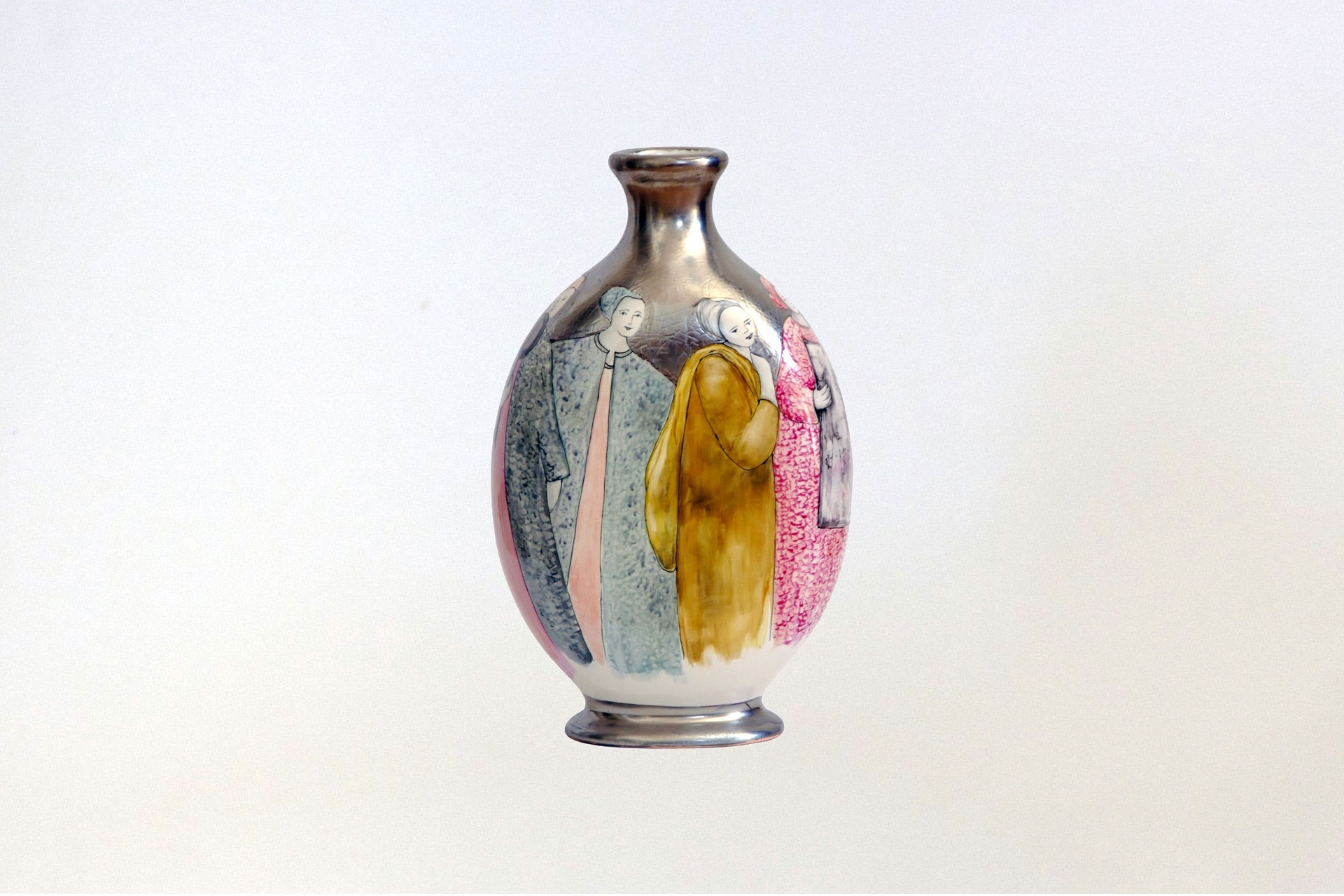 Donna colta e artista di vaglia, ottima disegnatrice e modellatrice, Fausta Cropelli ci offre qui – dopo i piccioni e gli spiritelli – la sua terza persuasiva serie di creature nate dall’alchimìa del gran fuoco e del piccolo fuoco, del biscuit, dalla preziosità degli smalti, delle cristalline, dei lustri, degli ori, degli engobi, insomma dalla varietà di quella plurisecolare tecnica ceramistica a più cotture, che lei ha appreso da autodidatta, ma che ha saputo aggiornare e reinventare con stile personale, uno stile che non esclude la commistione di materiali, la ricerca e la sperimentazione di nuove strade. Forme modulari e seriali, replicate con gli stampi, ma che divengono, come le definisce Fausta, “le mie tele”, le superfici sui cui esprimere e dilatare un’inesauribile, sontuoso repertorio pittorico, una saturazione decorativa fatta di pennellate talora astratte, di sapienti gocciolature, di segni, di motivi floreali, vegetali, figurativi, in un proliferare gestuale che va letto sia nel dettaglio sia nell’assieme.