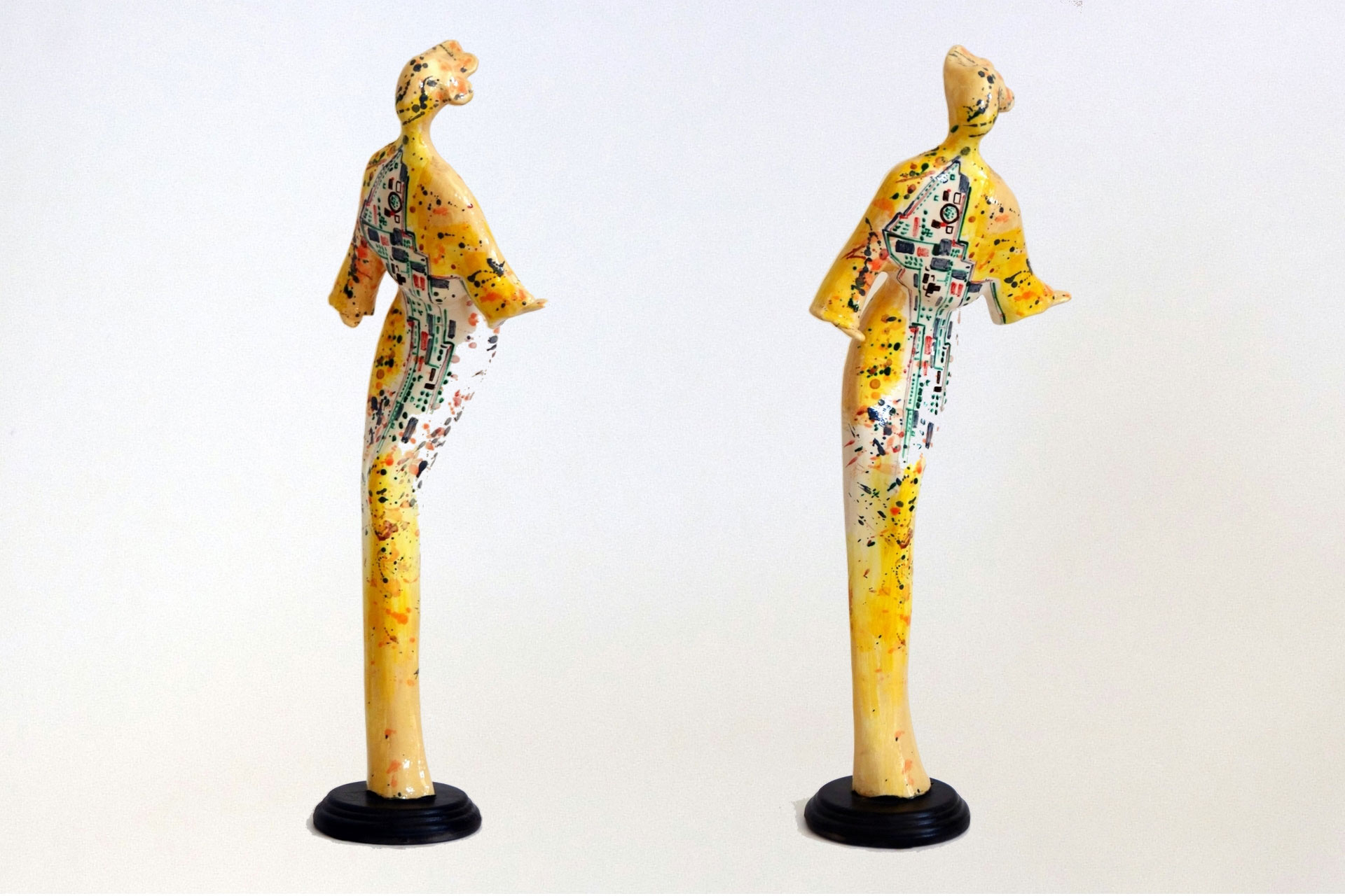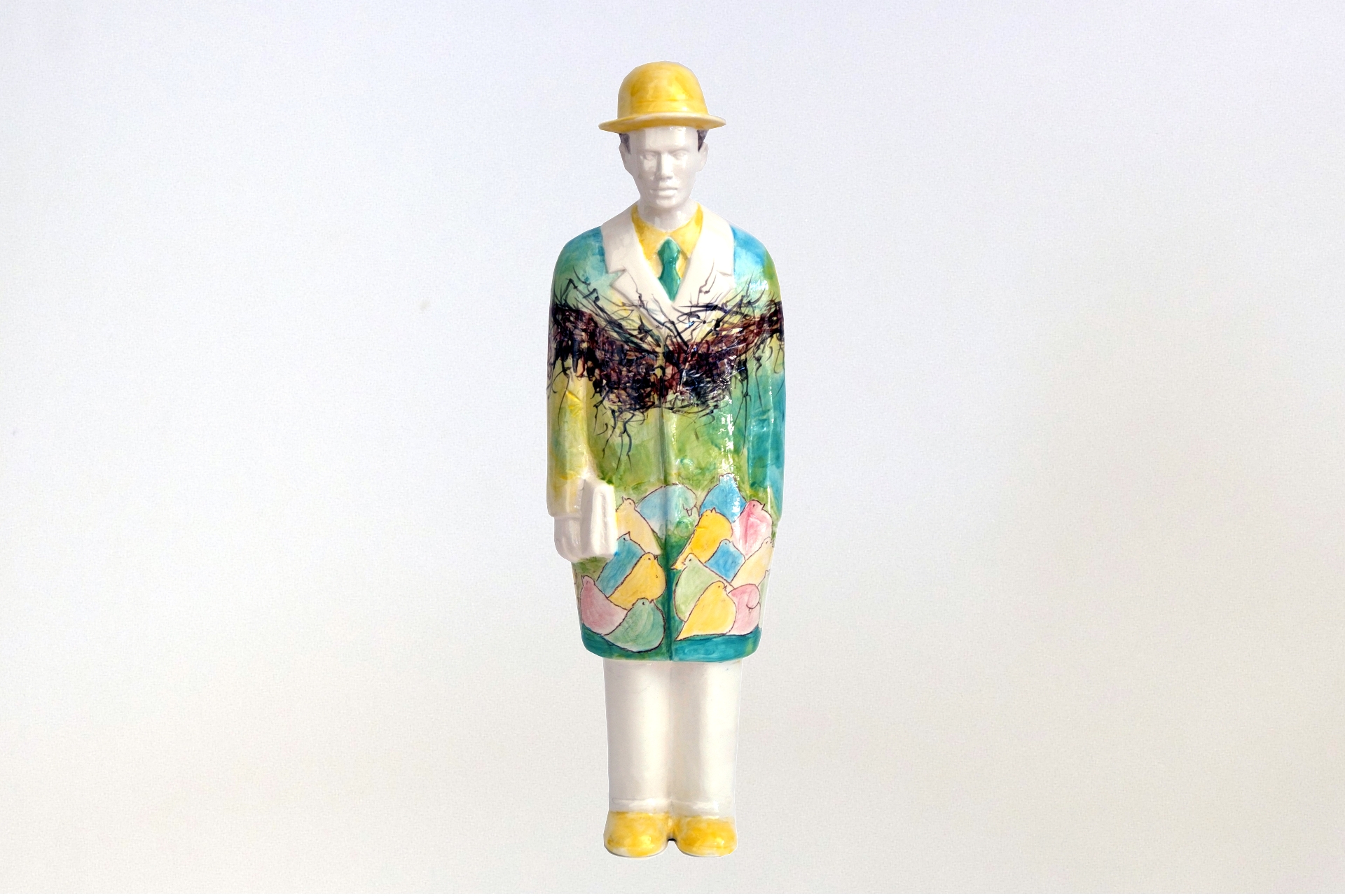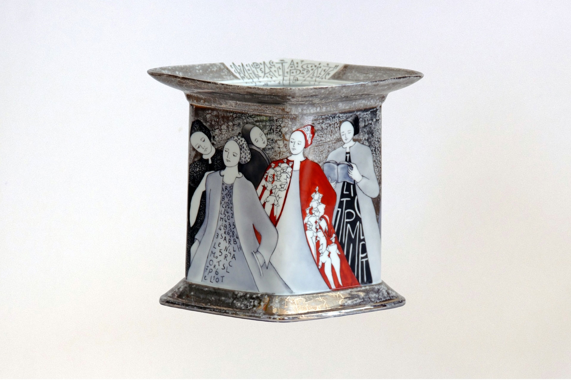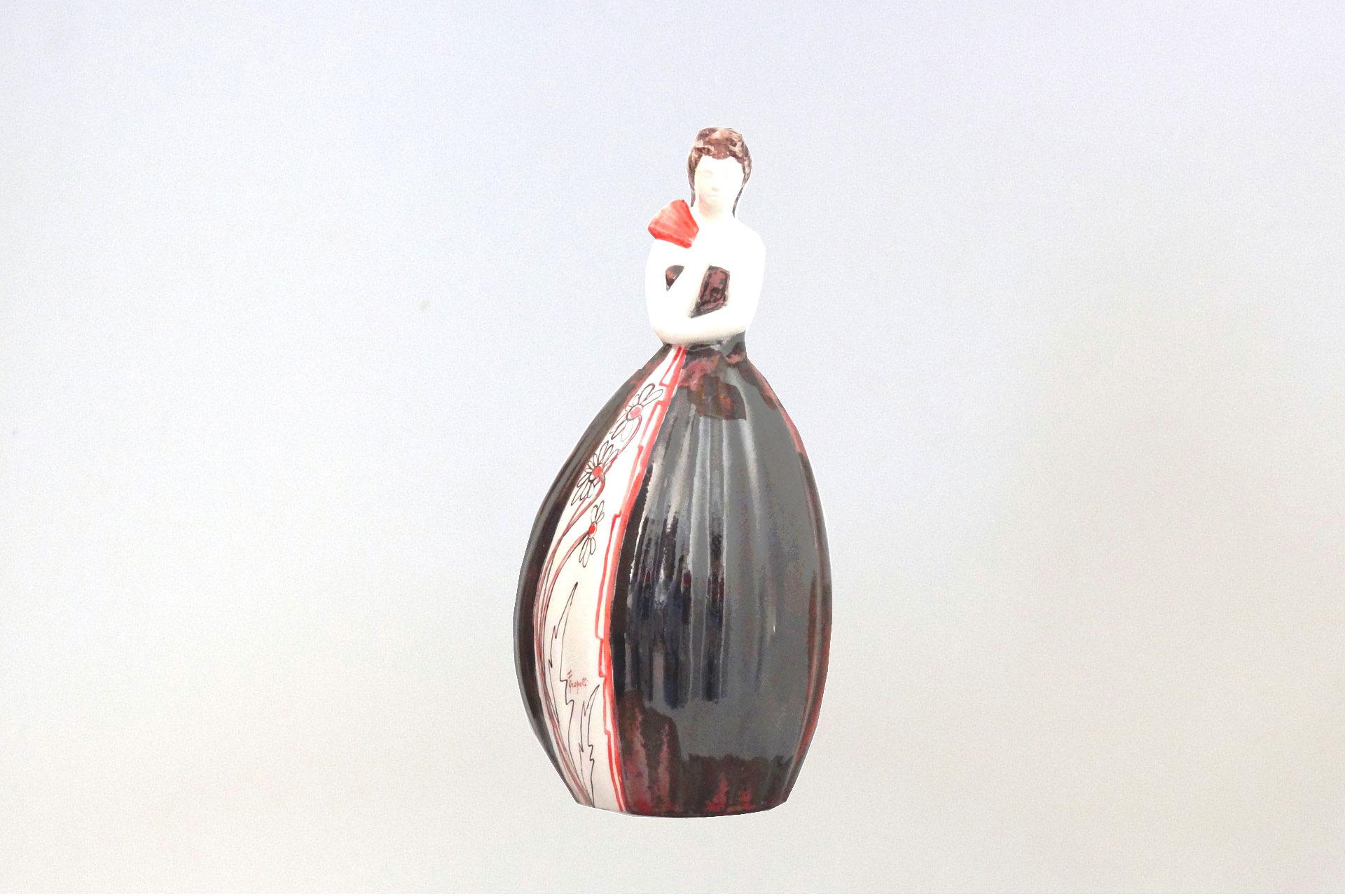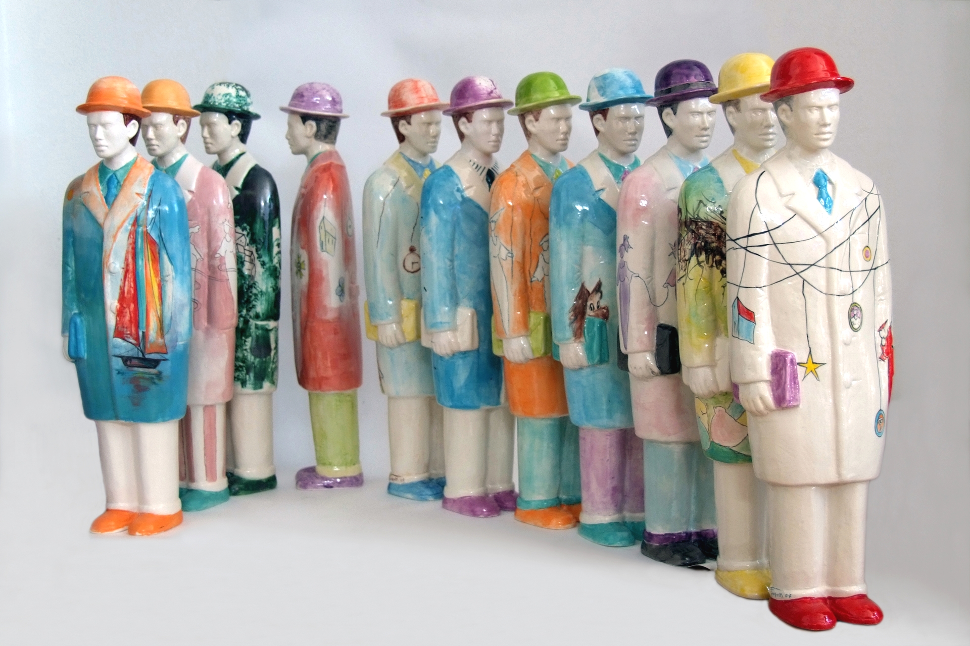 Donna colta e artista di vaglia, ottima disegnatrice e modellatrice, Fausta Cropelli ci offre qui – dopo i piccioni e gli spiritelli – la sua terza persuasiva serie di creature nate dall’alchimìa del gran fuoco e del piccolo fuoco, del biscuit, dalla preziosità degli smalti, delle cristalline, dei lustri, degli ori, degli engobi, insomma dalla varietà di quella plurisecolare tecnica ceramistica a più cotture, che lei ha appreso da autodidatta, ma che ha saputo aggiornare e reinventare con stile personale, uno stile che non esclude la commistione di materiali, la ricerca e la sperimentazione di nuove strade. Forme modulari e seriali, replicate con gli stampi, ma che divengono, come le definisce Fausta, “le mie tele”, le superfici sui cui esprimere e dilatare un’inesauribile, sontuoso repertorio pittorico, una saturazione decorativa fatta di pennellate talora astratte, di sapienti gocciolature, di segni, di motivi floreali, vegetali, figurativi, in un proliferare gestuale che va letto sia nel dettaglio sia nell’assieme.