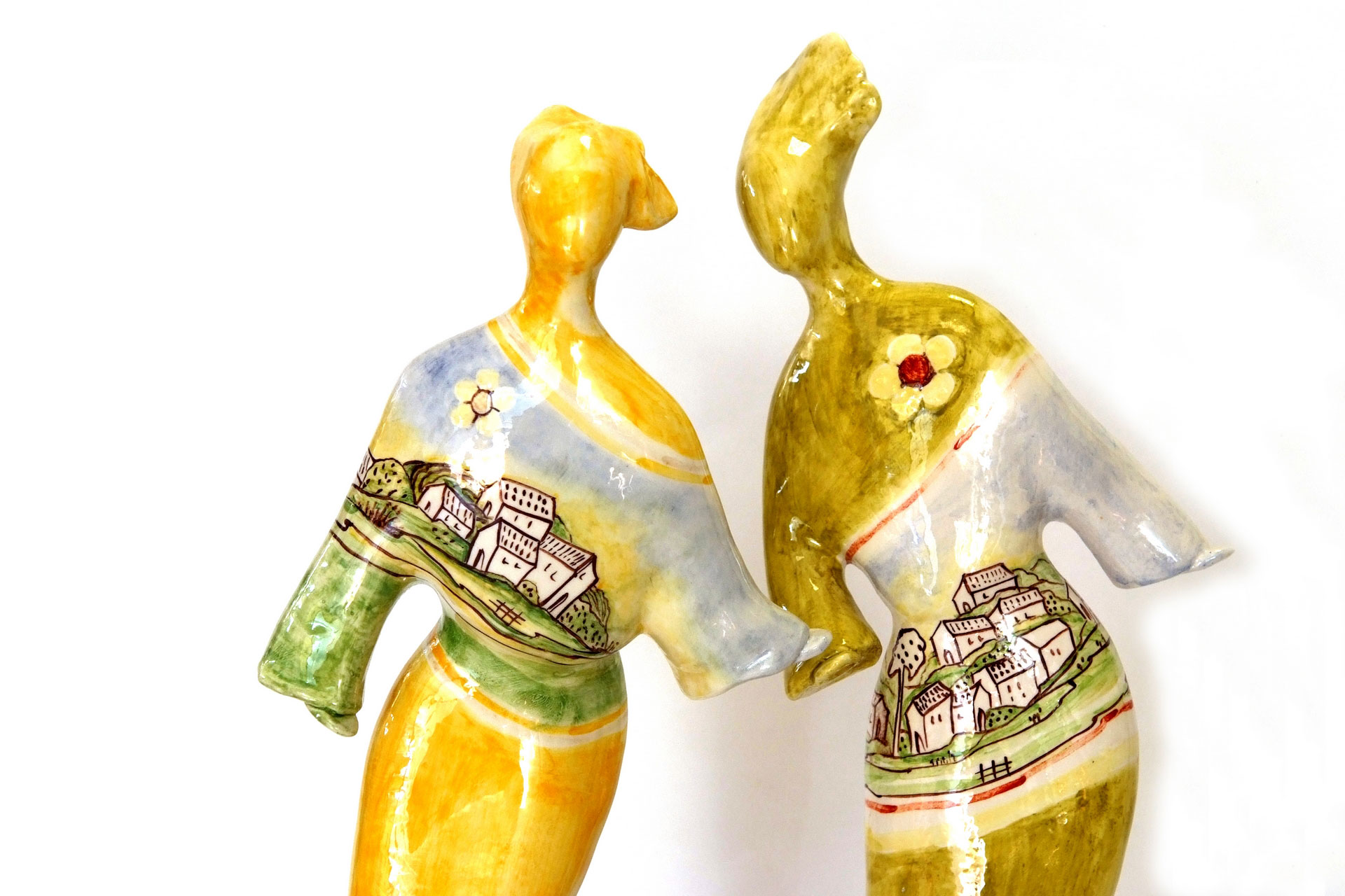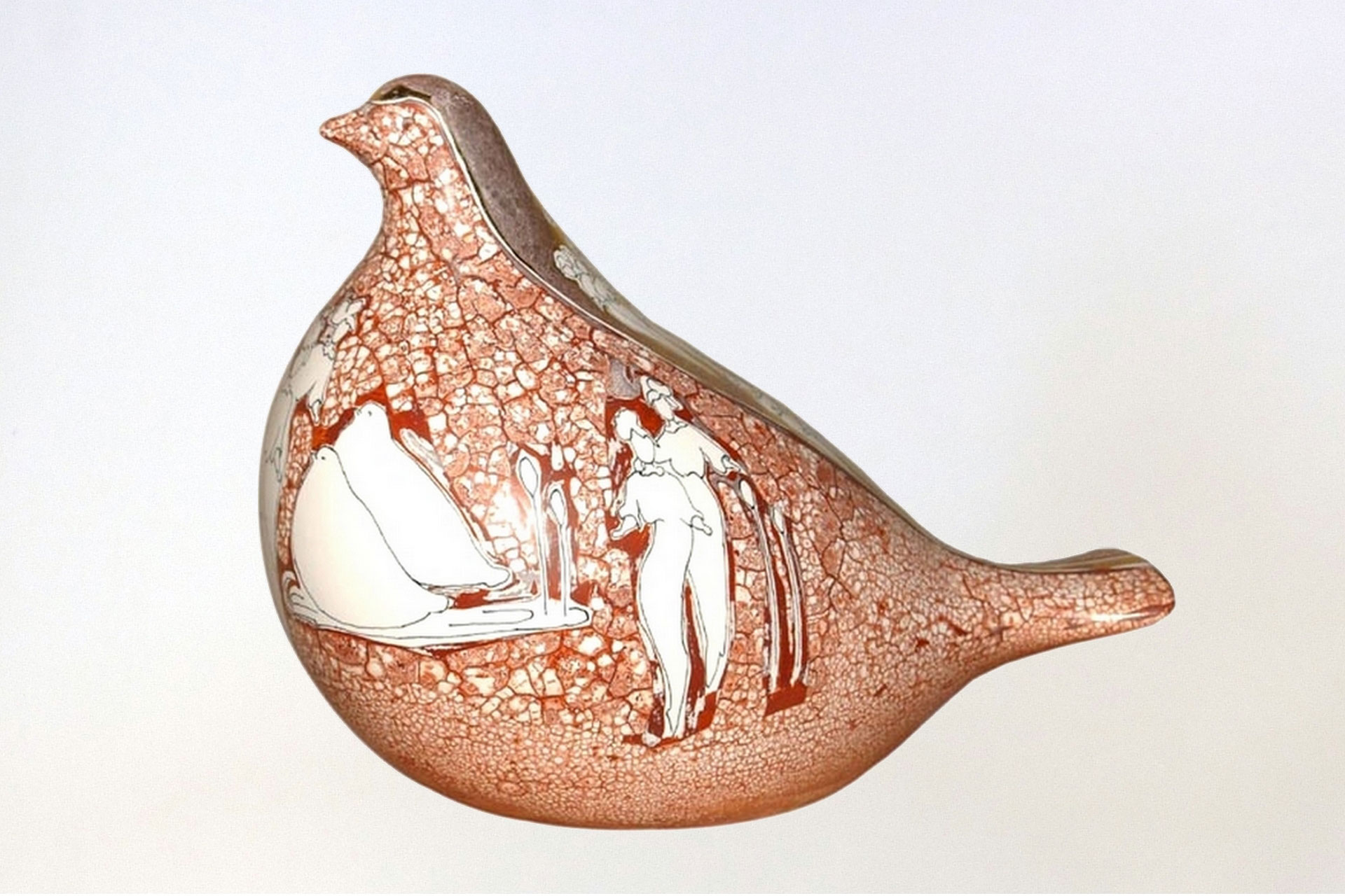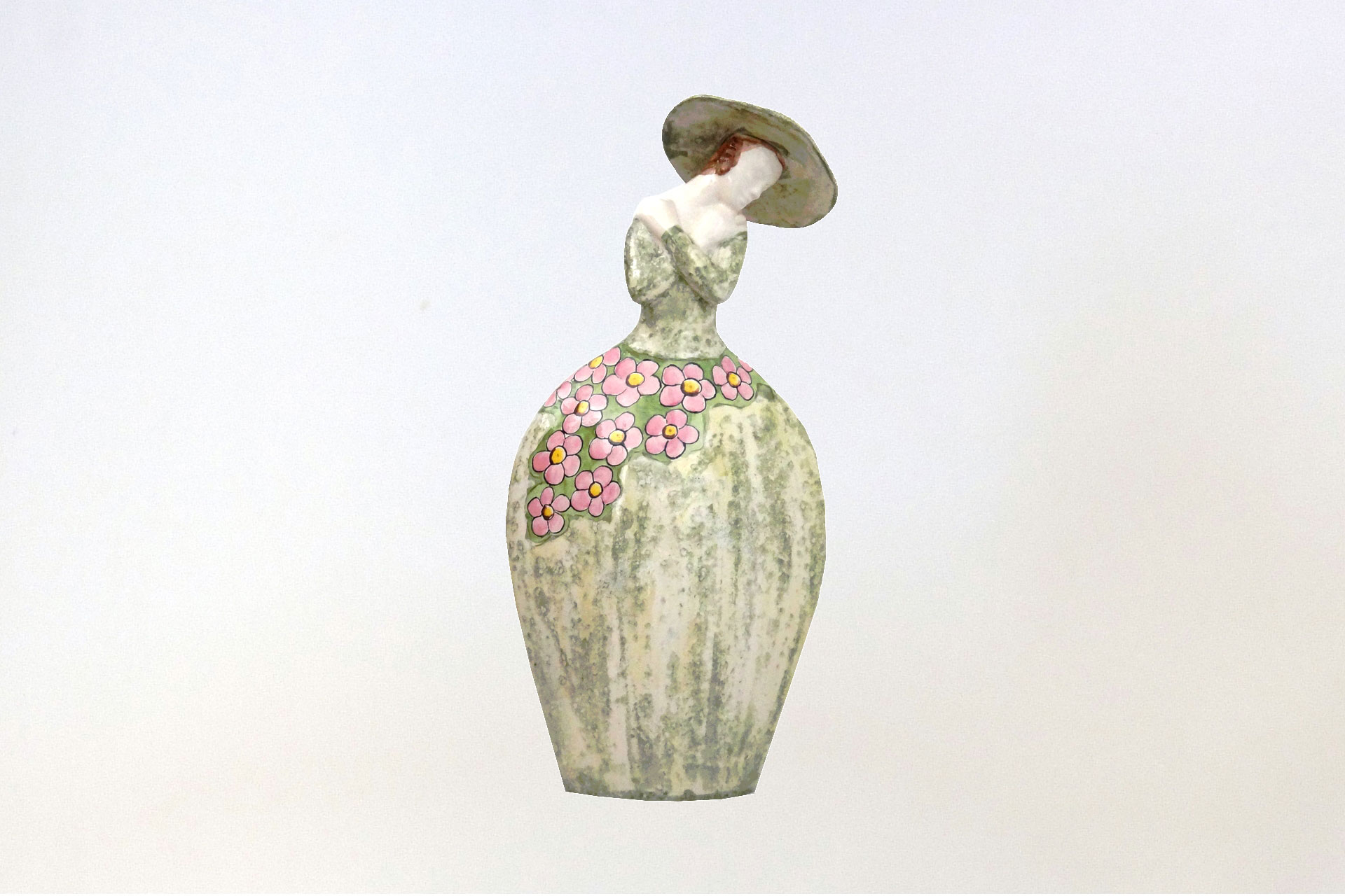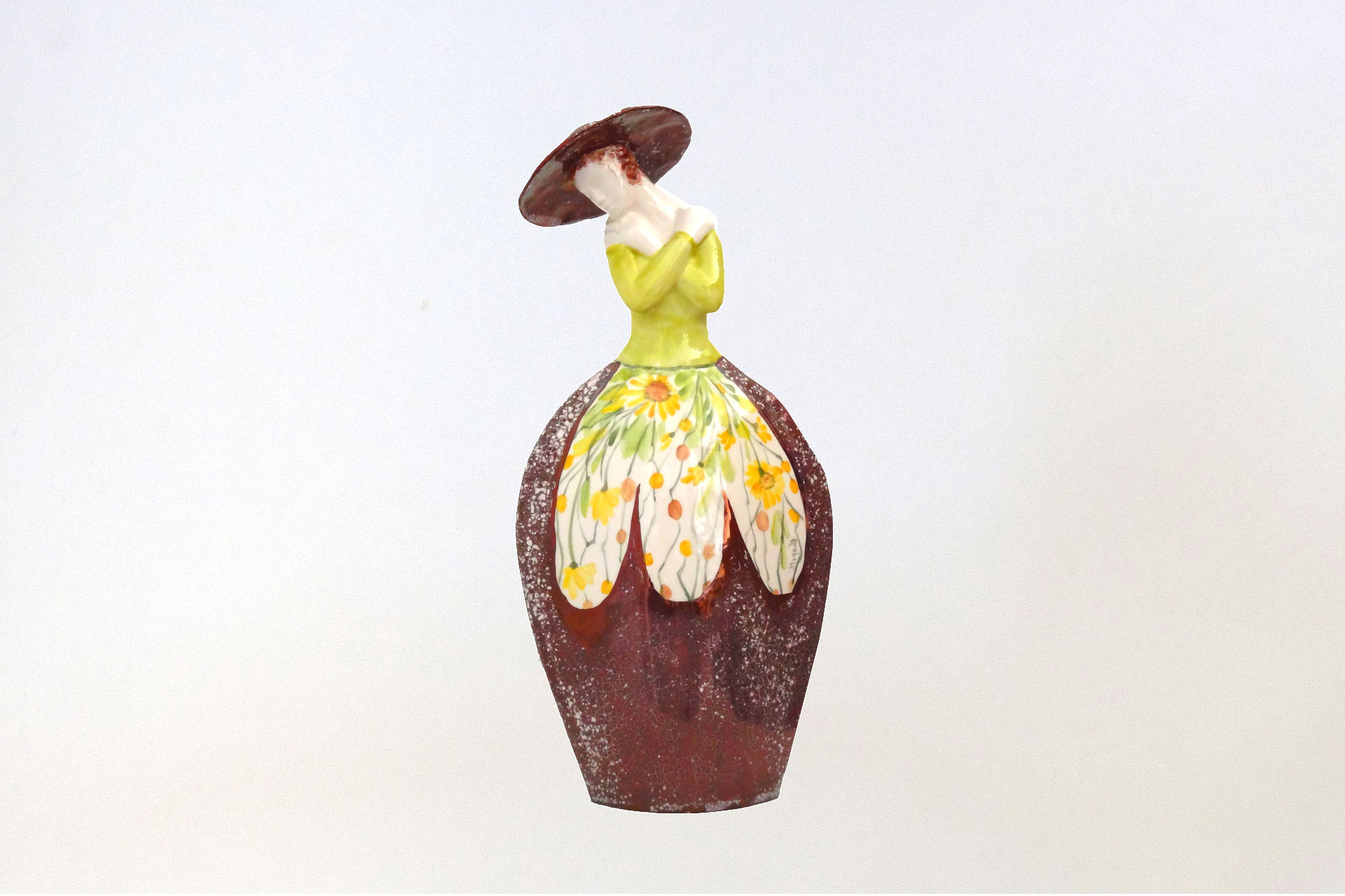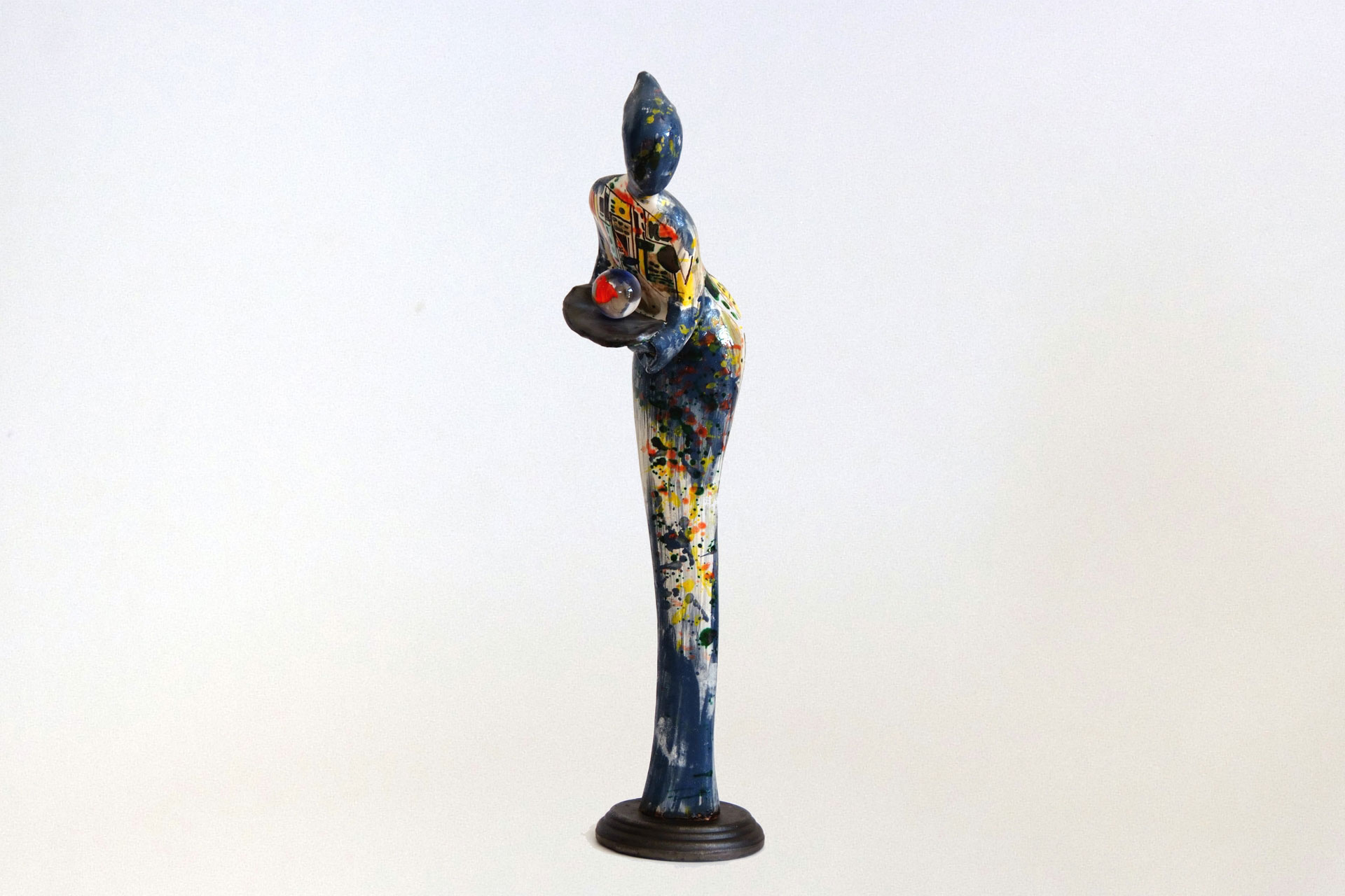 Donna colta e artista di vaglia, ottima disegnatrice e modellatrice, Fausta Cropelli ci offre qui – dopo i piccioni e gli spiritelli – la sua terza persuasiva serie di creature nate dall’alchimìa del gran fuoco e del piccolo fuoco, del biscuit, dalla preziosità degli smalti, delle cristalline, dei lustri, degli ori, degli engobi, insomma dalla varietà di quella plurisecolare tecnica ceramistica a più cotture, che lei ha appreso da autodidatta, ma che ha saputo aggiornare e reinventare con stile personale, uno stile che non esclude la commistione di materiali, la ricerca e la sperimentazione di nuove strade. Forme modulari e seriali, replicate con gli stampi, ma che divengono, come le definisce Fausta, “le mie tele”, le superfici sui cui esprimere e dilatare un’inesauribile, sontuoso repertorio pittorico, una saturazione decorativa fatta di pennellate talora astratte, di sapienti gocciolature, di segni, di motivi floreali, vegetali, figurativi, in un proliferare gestuale che va letto sia nel dettaglio sia nell’assieme.