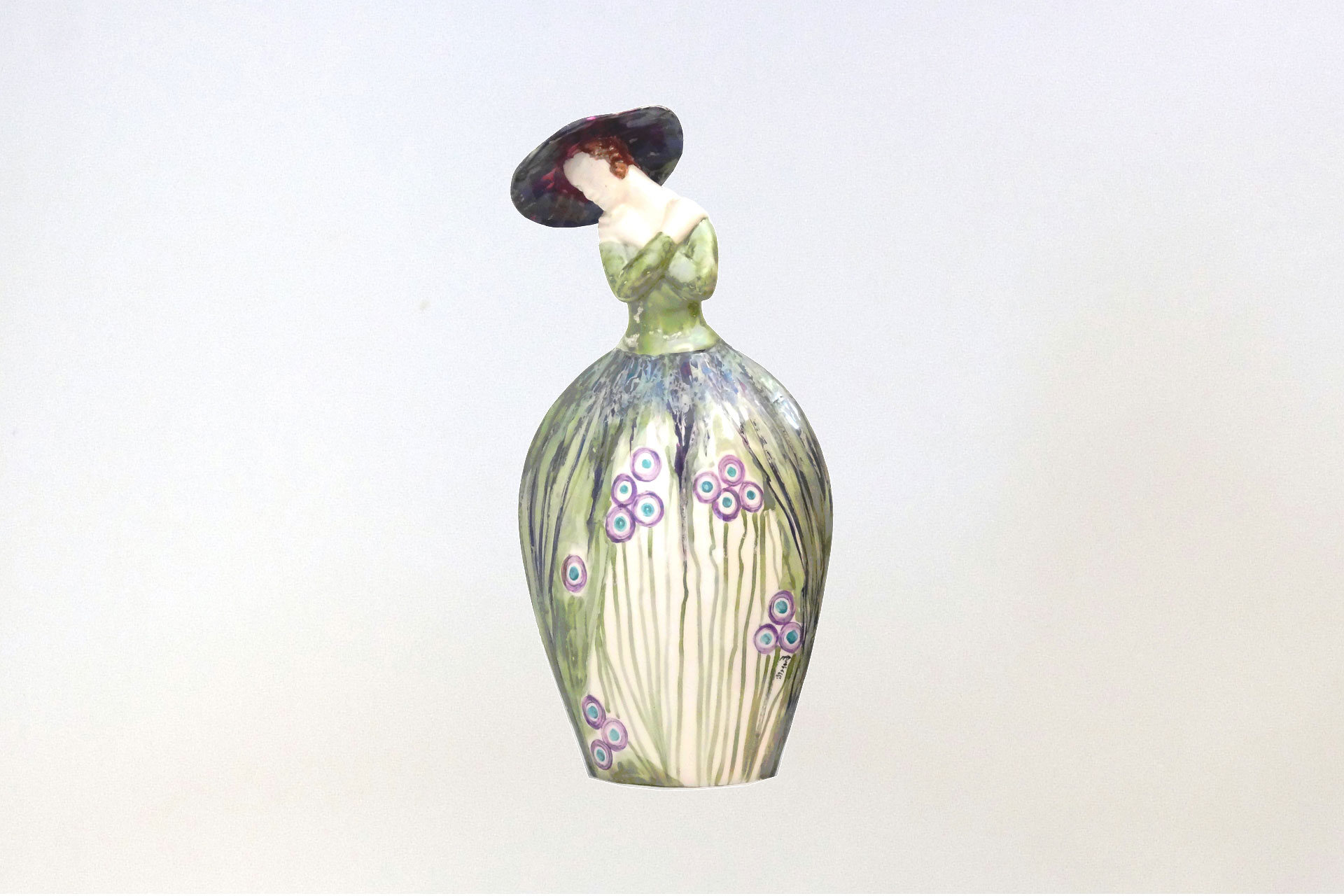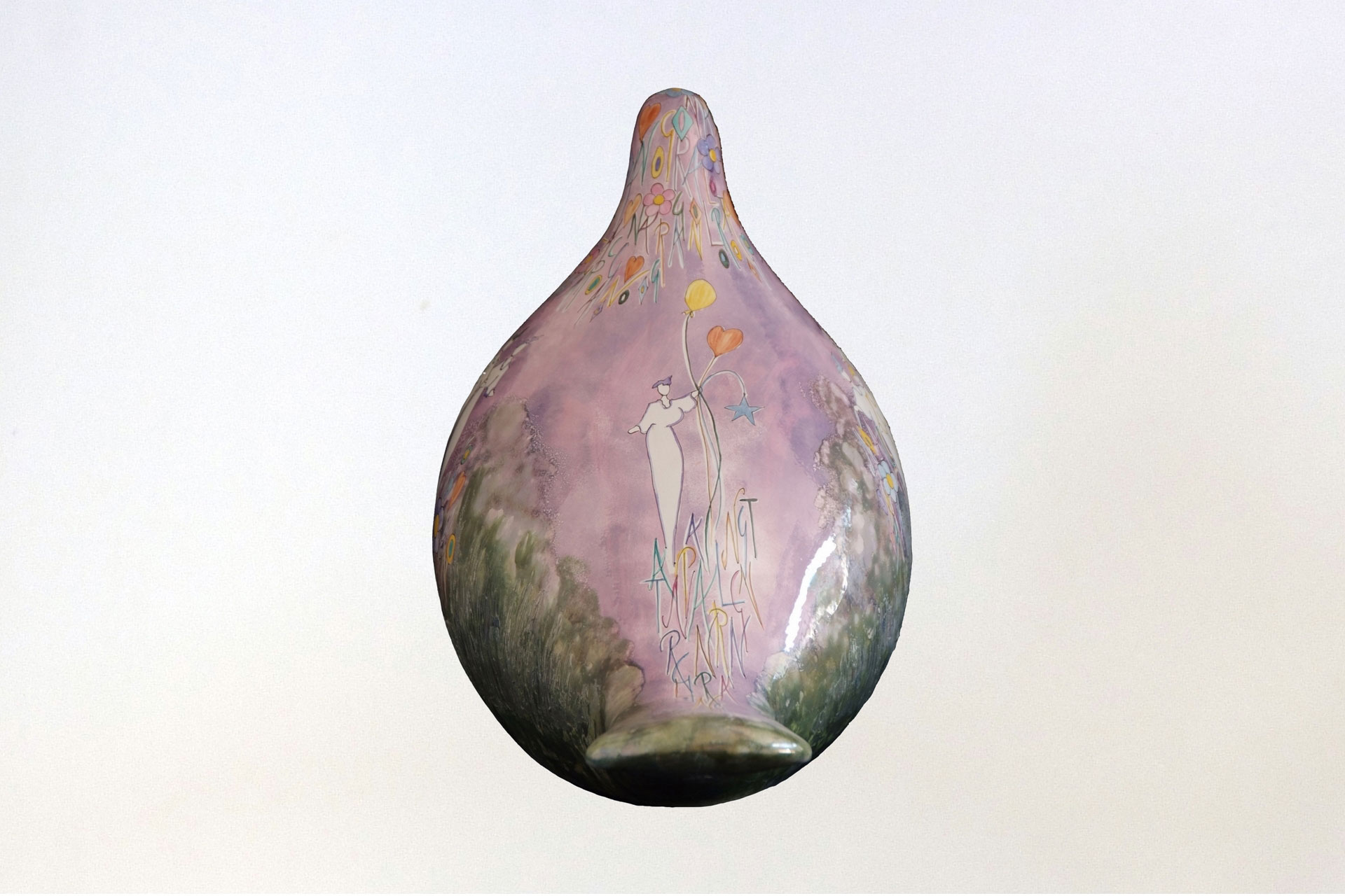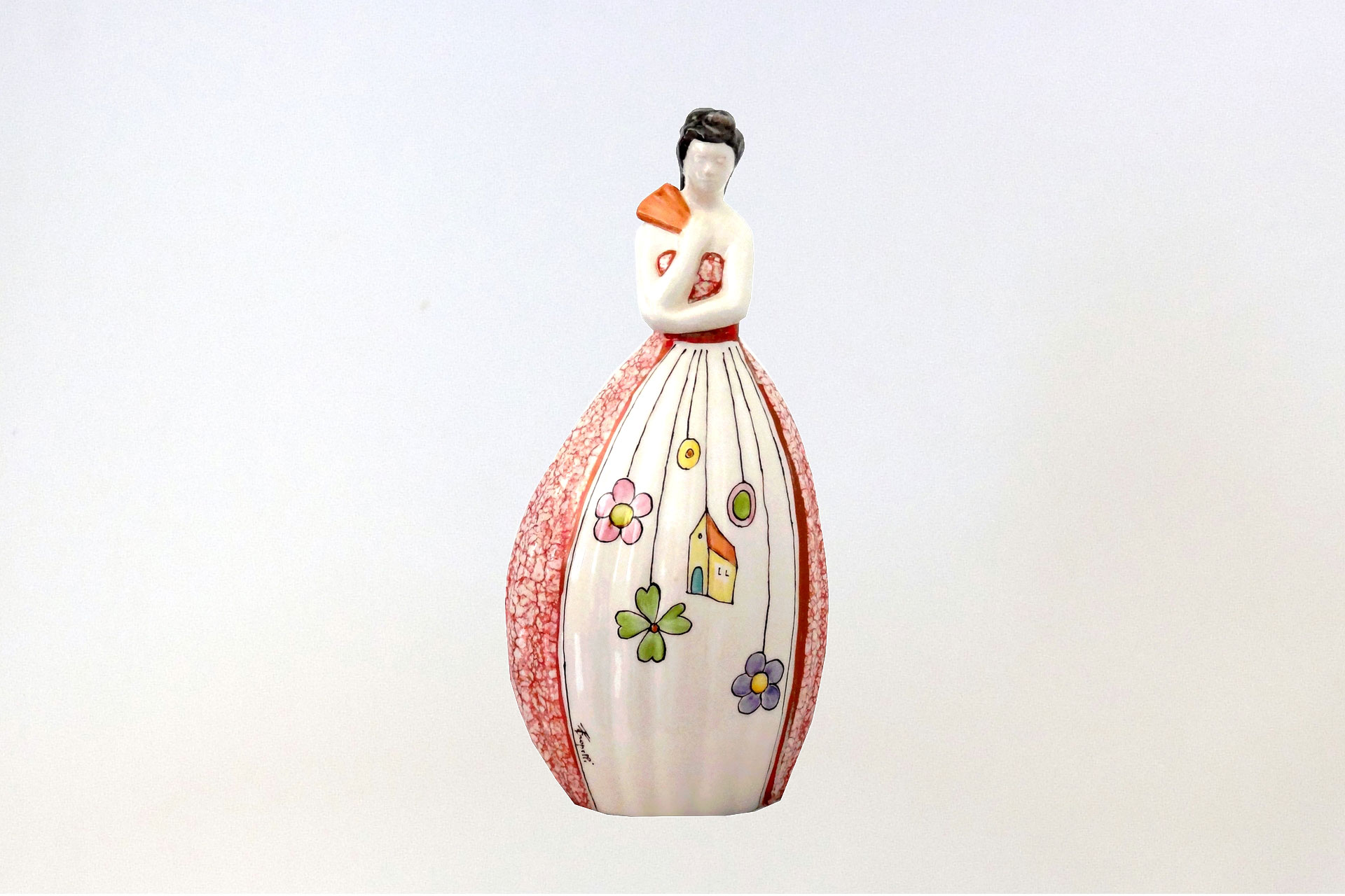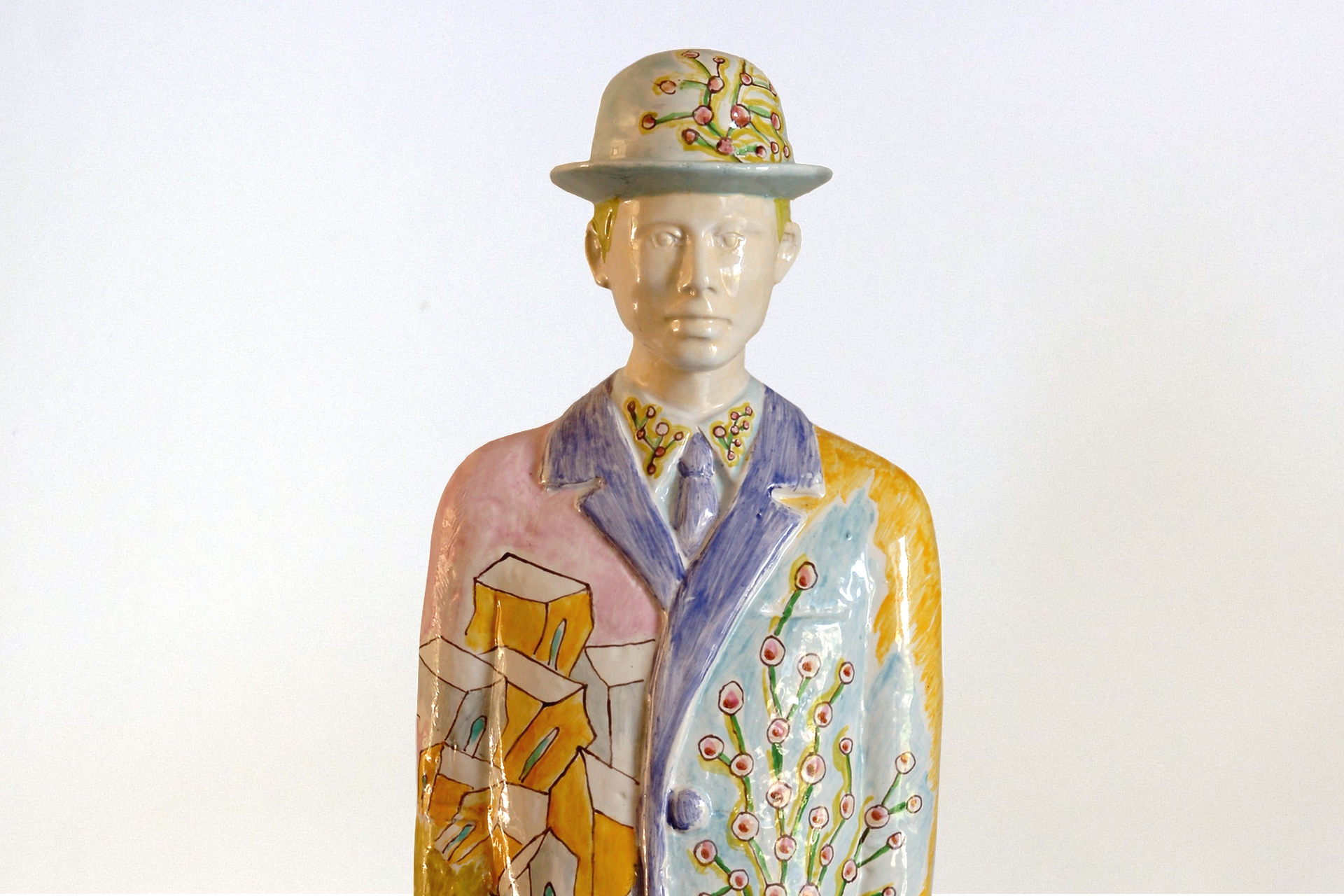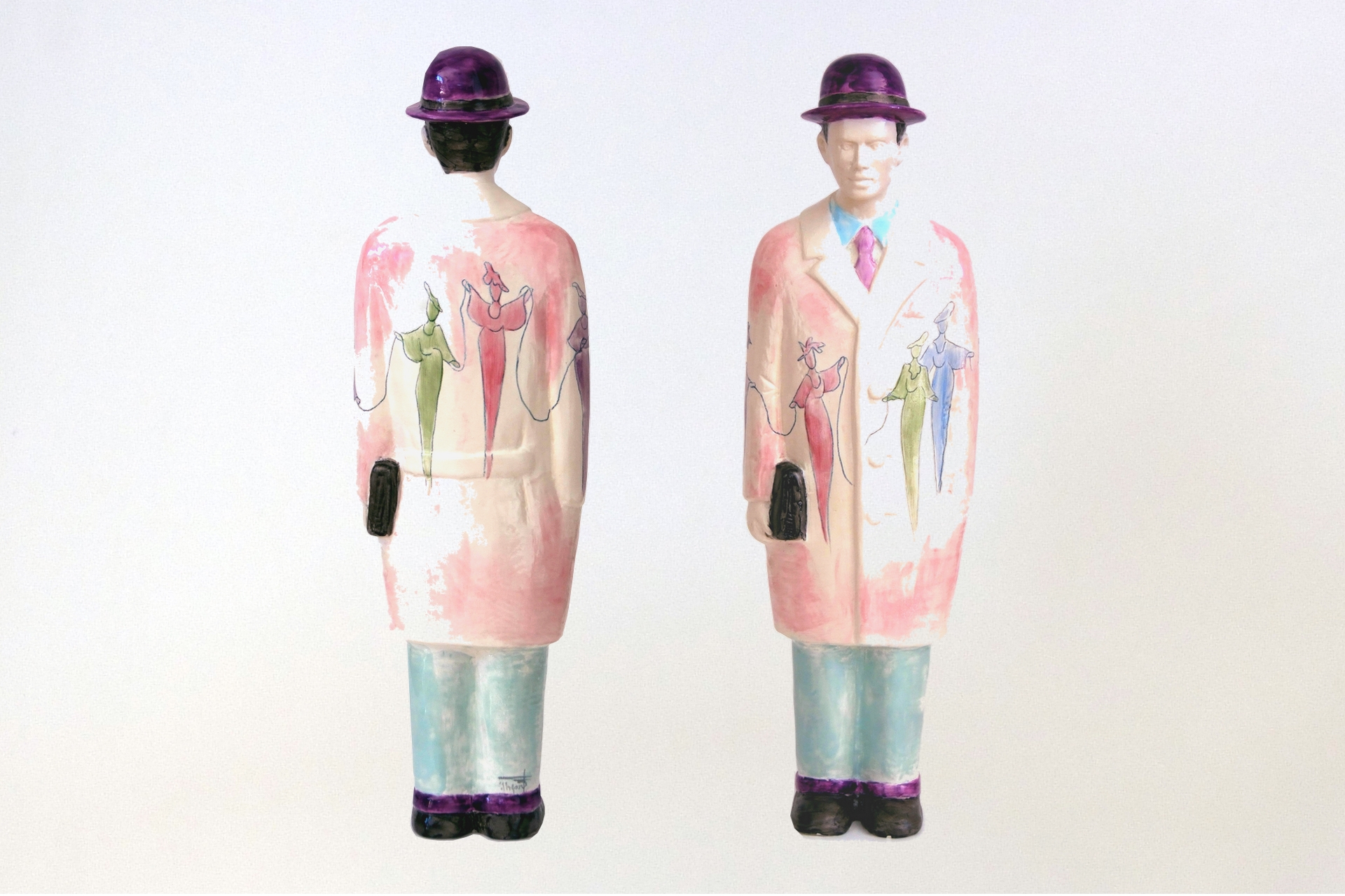 Donna colta e artista di vaglia, ottima disegnatrice e modellatrice, Fausta Cropelli ci offre qui – dopo i piccioni e gli spiritelli – la sua terza persuasiva serie di creature nate dall’alchimìa del gran fuoco e del piccolo fuoco, del biscuit, dalla preziosità degli smalti, delle cristalline, dei lustri, degli ori, degli engobi, insomma dalla varietà di quella plurisecolare tecnica ceramistica a più cotture, che lei ha appreso da autodidatta, ma che ha saputo aggiornare e reinventare con stile personale, uno stile che non esclude la commistione di materiali, la ricerca e la sperimentazione di nuove strade. Forme modulari e seriali, replicate con gli stampi, ma che divengono, come le definisce Fausta, “le mie tele”, le superfici sui cui esprimere e dilatare un’inesauribile, sontuoso repertorio pittorico, una saturazione decorativa fatta di pennellate talora astratte, di sapienti gocciolature, di segni, di motivi floreali, vegetali, figurativi, in un proliferare gestuale che va letto sia nel dettaglio sia nell’assieme.