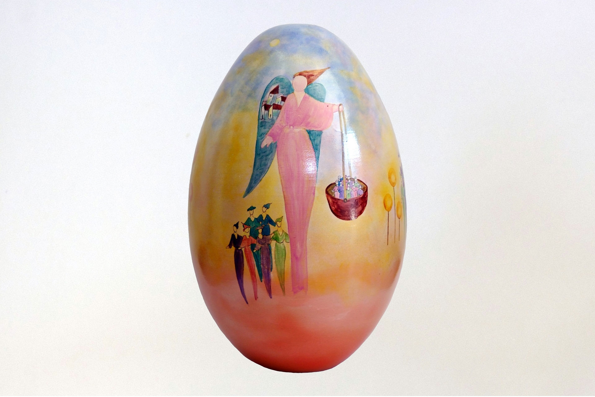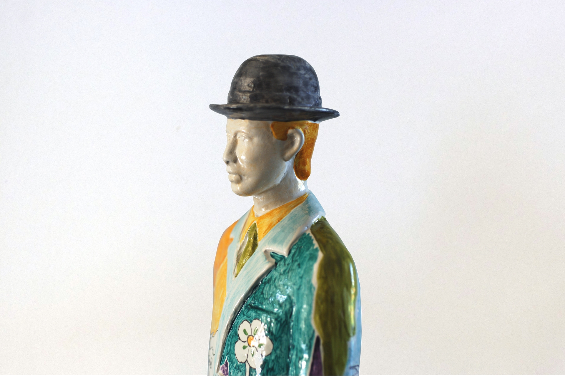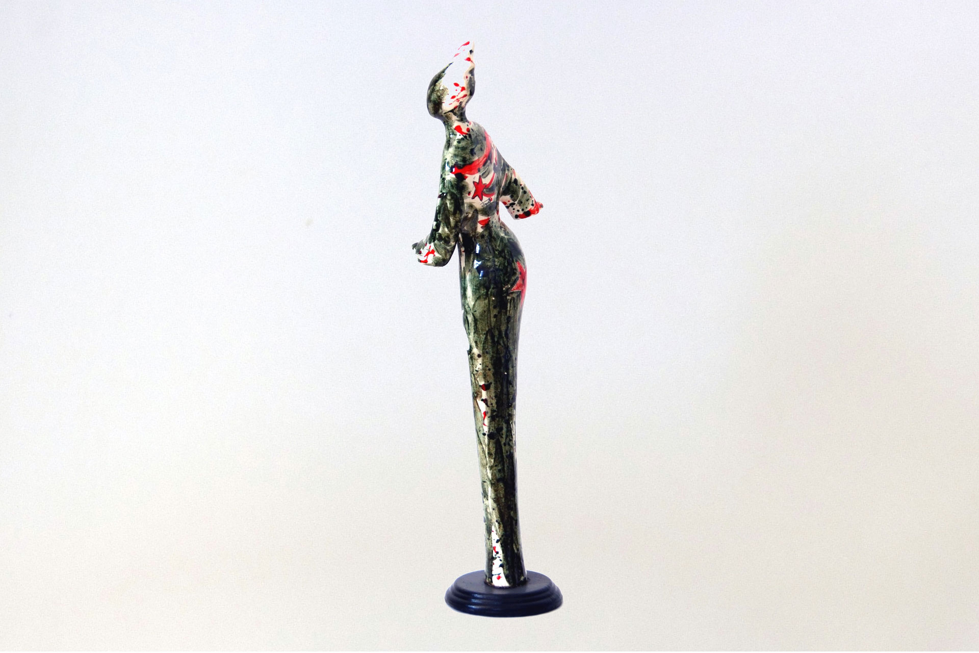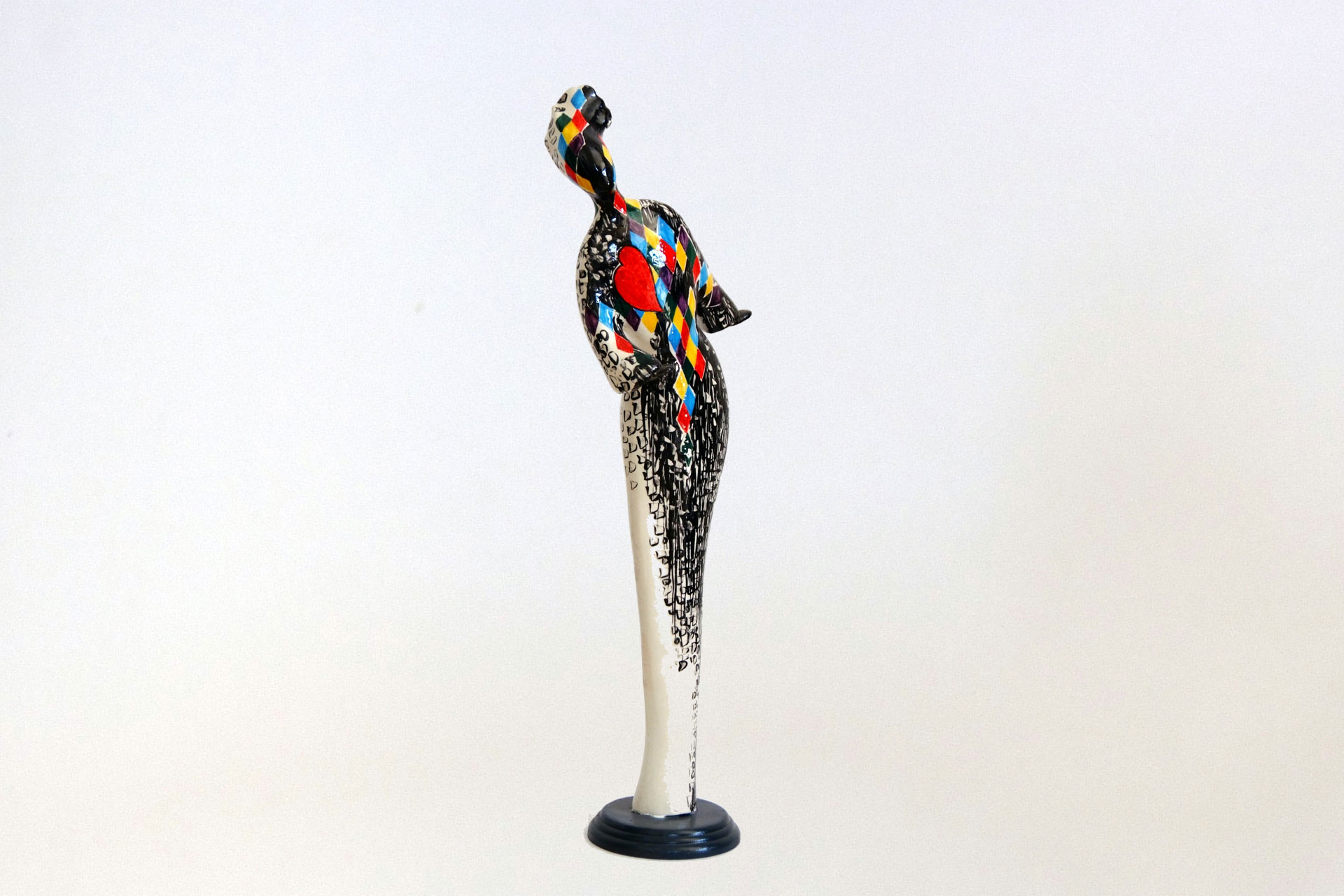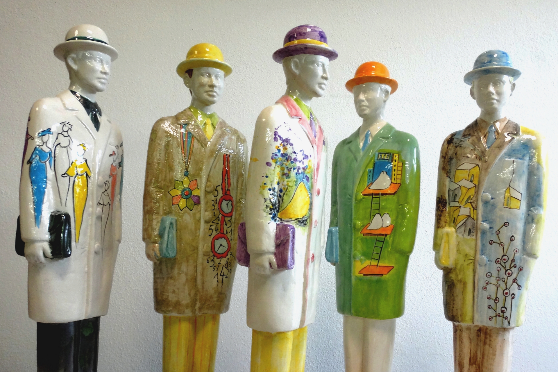 Donna colta e artista di vaglia, ottima disegnatrice e modellatrice, Fausta Cropelli ci offre qui – dopo i piccioni e gli spiritelli – la sua terza persuasiva serie di creature nate dall’alchimìa del gran fuoco e del piccolo fuoco, del biscuit, dalla preziosità degli smalti, delle cristalline, dei lustri, degli ori, degli engobi, insomma dalla varietà di quella plurisecolare tecnica ceramistica a più cotture, che lei ha appreso da autodidatta, ma che ha saputo aggiornare e reinventare con stile personale, uno stile che non esclude la commistione di materiali, la ricerca e la sperimentazione di nuove strade. Forme modulari e seriali, replicate con gli stampi, ma che divengono, come le definisce Fausta, “le mie tele”, le superfici sui cui esprimere e dilatare un’inesauribile, sontuoso repertorio pittorico, una saturazione decorativa fatta di pennellate talora astratte, di sapienti gocciolature, di segni, di motivi floreali, vegetali, figurativi, in un proliferare gestuale che va letto sia nel dettaglio sia nell’assieme.