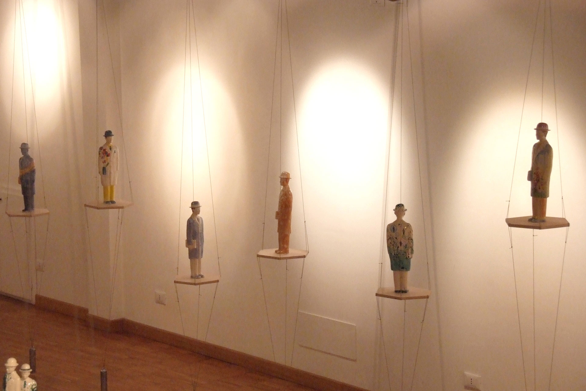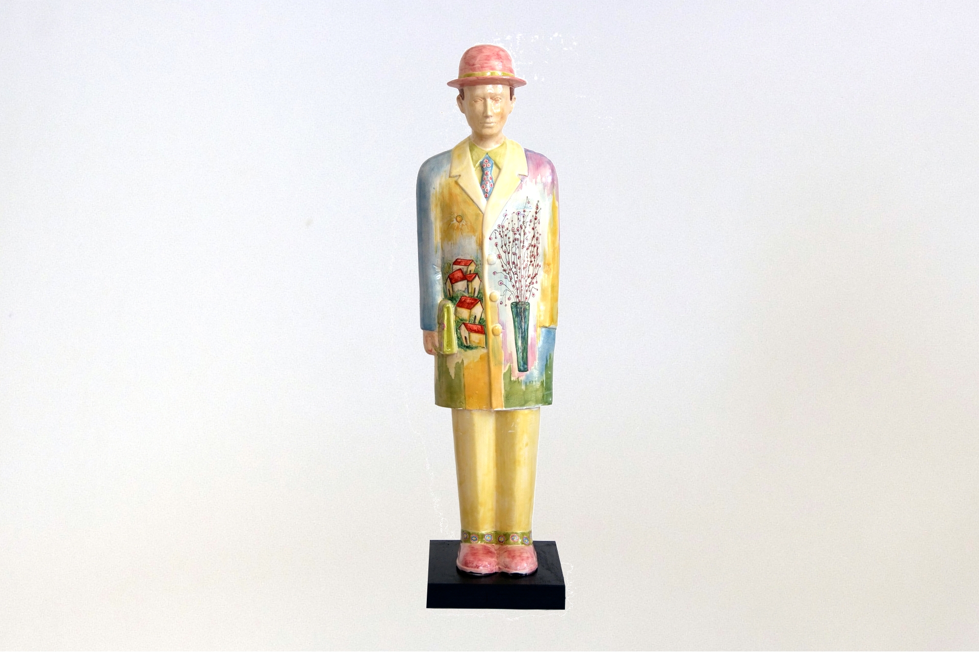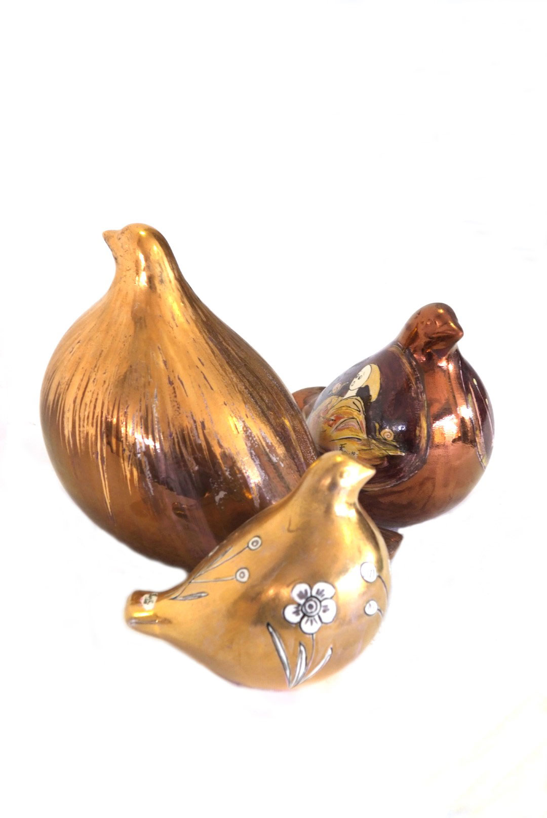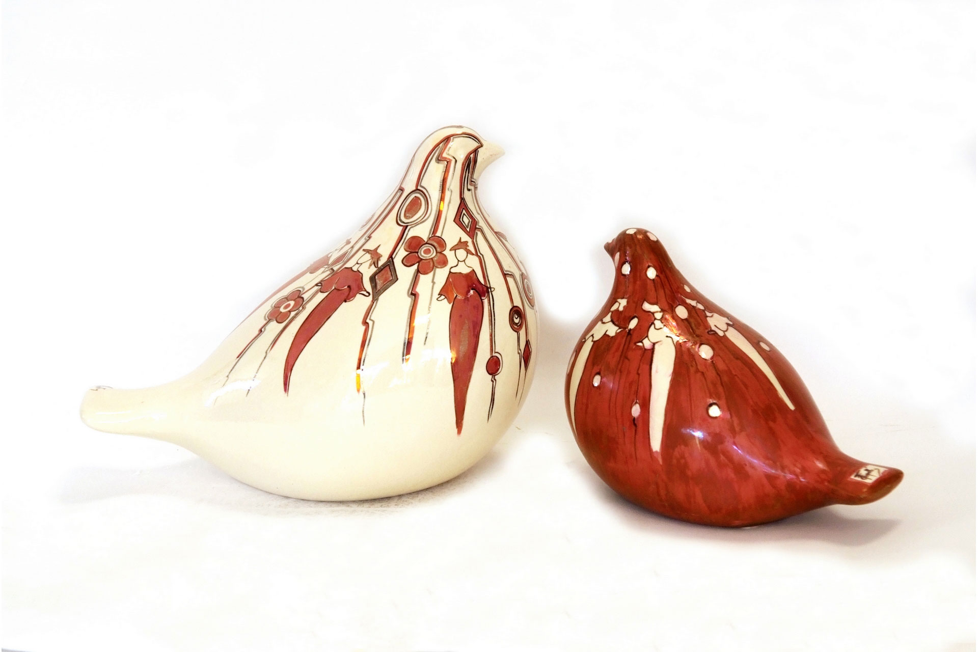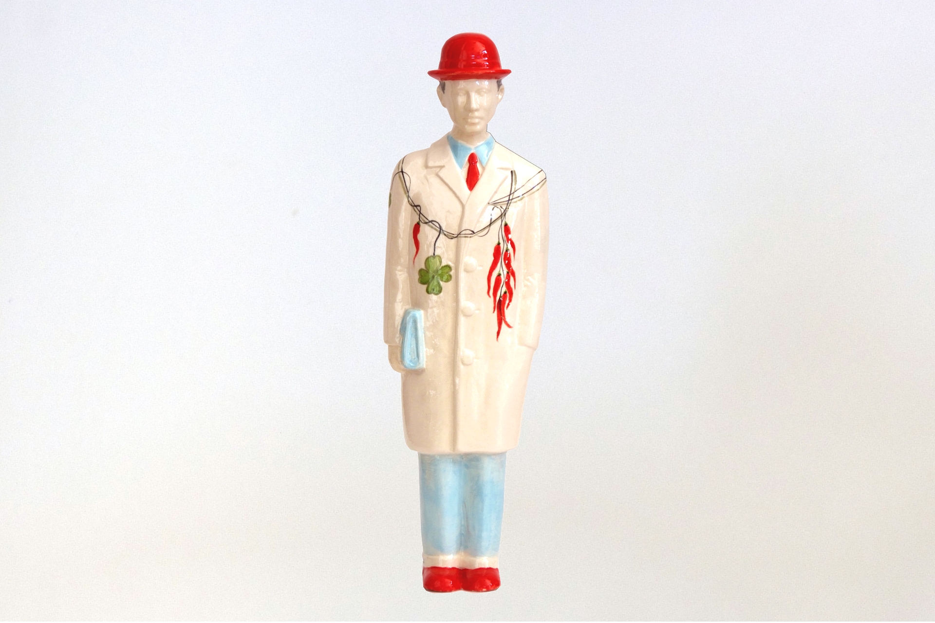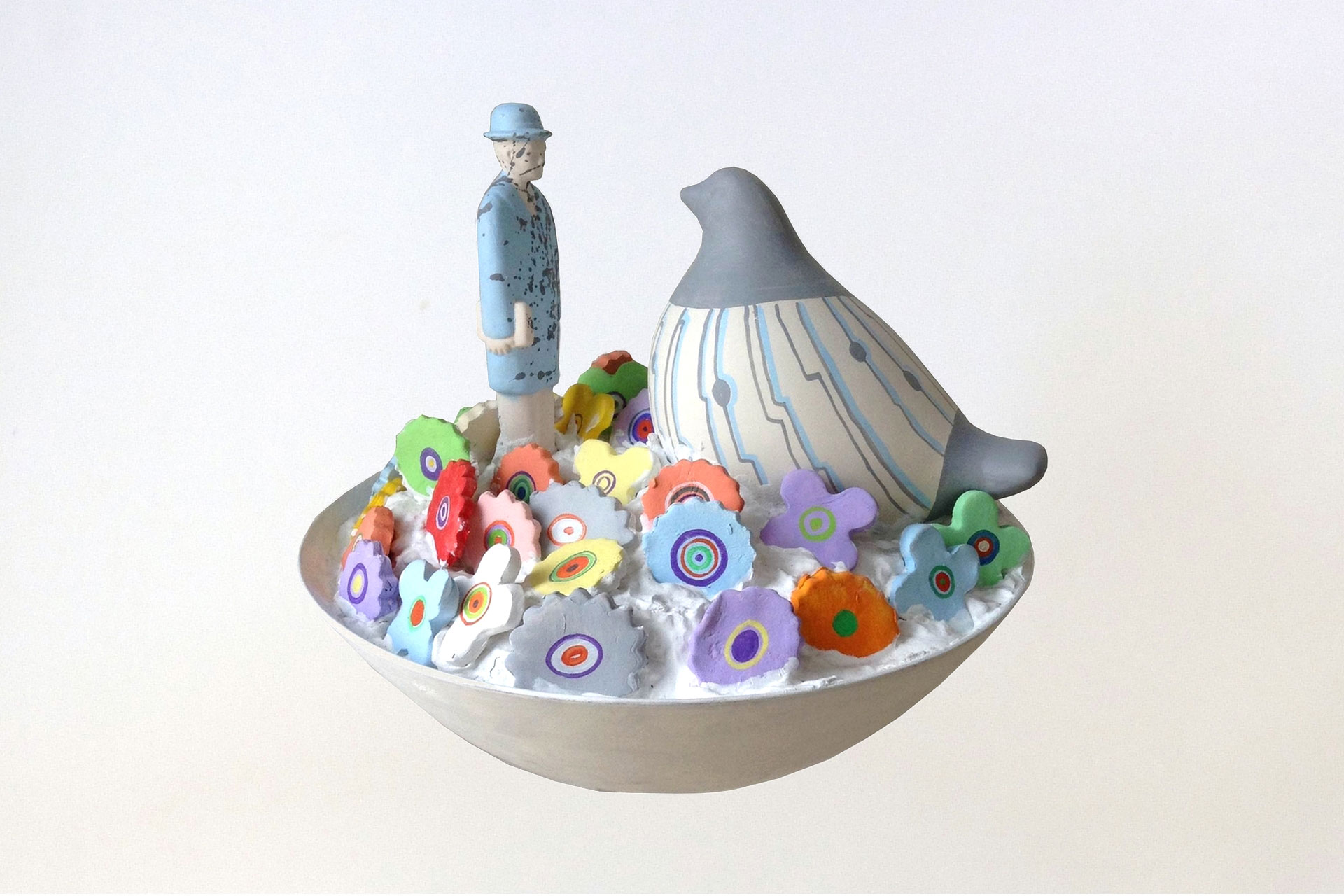 Donna colta e artista di vaglia, ottima disegnatrice e modellatrice, Fausta Cropelli ci offre qui – dopo i piccioni e gli spiritelli – la sua terza persuasiva serie di creature nate dall’alchimìa del gran fuoco e del piccolo fuoco, del biscuit, dalla preziosità degli smalti, delle cristalline, dei lustri, degli ori, degli engobi, insomma dalla varietà di quella plurisecolare tecnica ceramistica a più cotture, che lei ha appreso da autodidatta, ma che ha saputo aggiornare e reinventare con stile personale, uno stile che non esclude la commistione di materiali, la ricerca e la sperimentazione di nuove strade. Forme modulari e seriali, replicate con gli stampi, ma che divengono, come le definisce Fausta, “le mie tele”, le superfici sui cui esprimere e dilatare un’inesauribile, sontuoso repertorio pittorico, una saturazione decorativa fatta di pennellate talora astratte, di sapienti gocciolature, di segni, di motivi floreali, vegetali, figurativi, in un proliferare gestuale che va letto sia nel dettaglio sia nell’assieme.