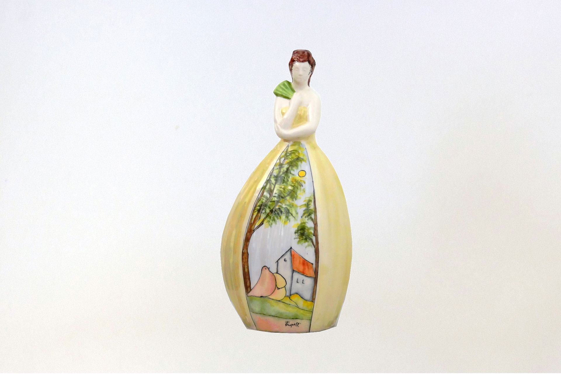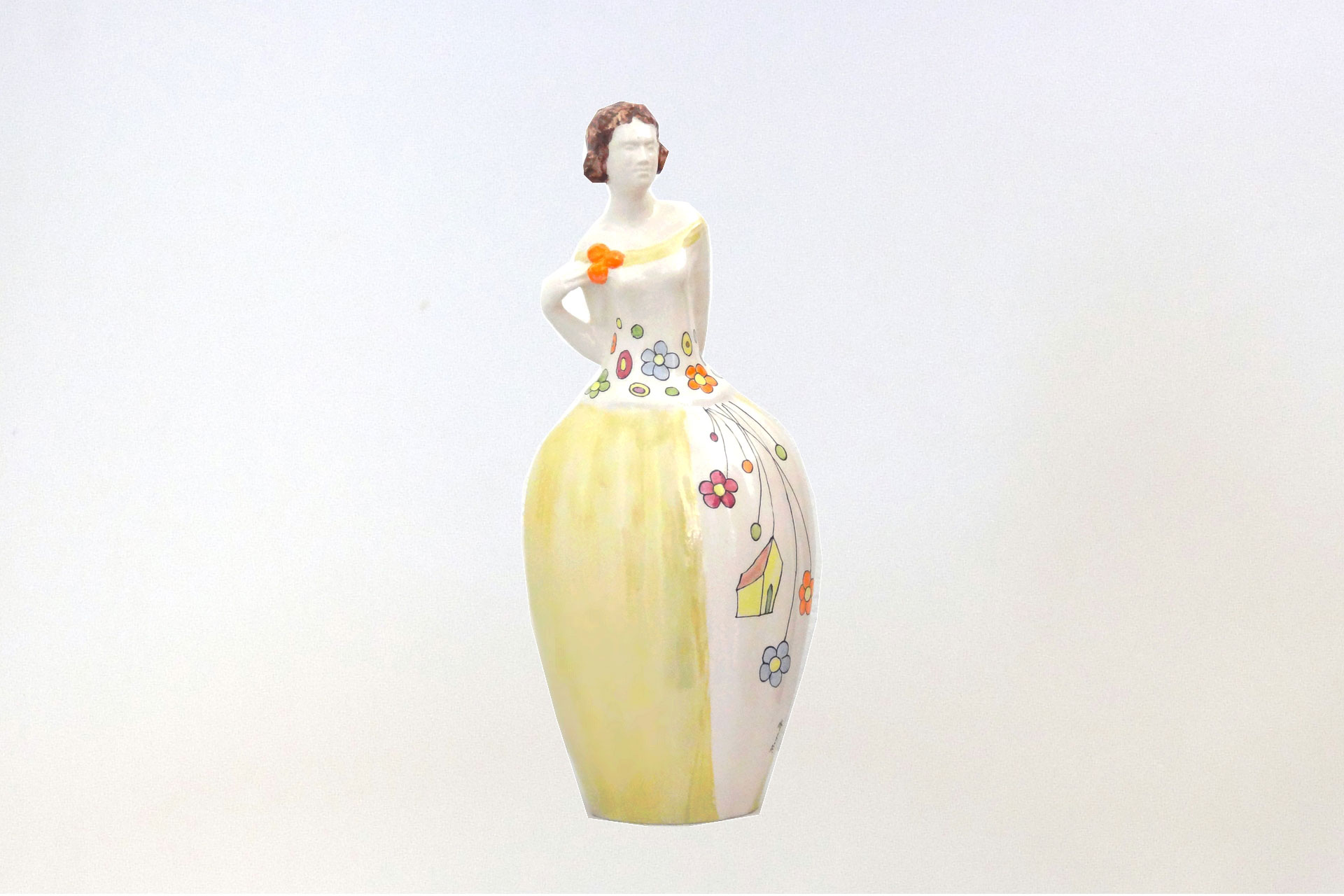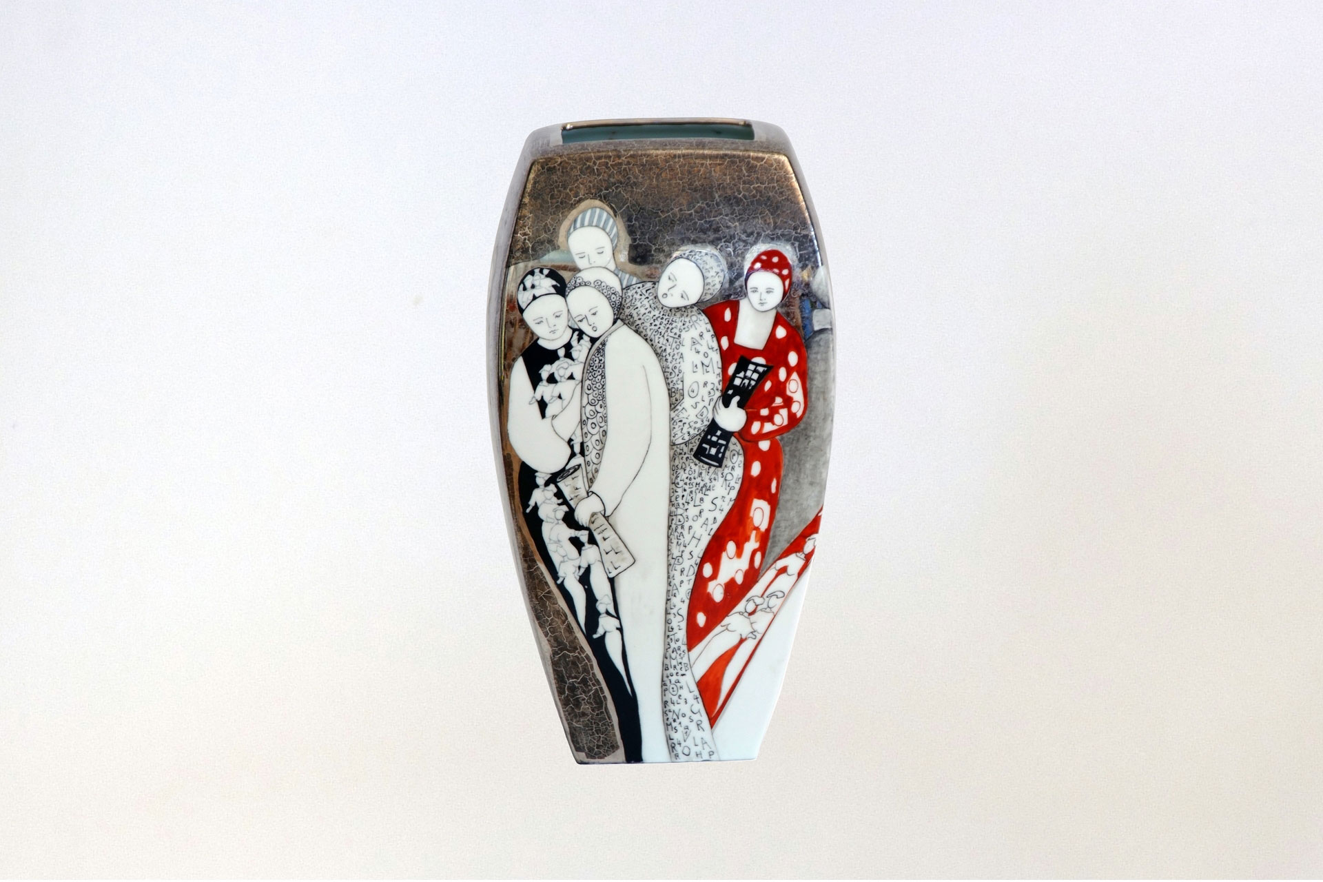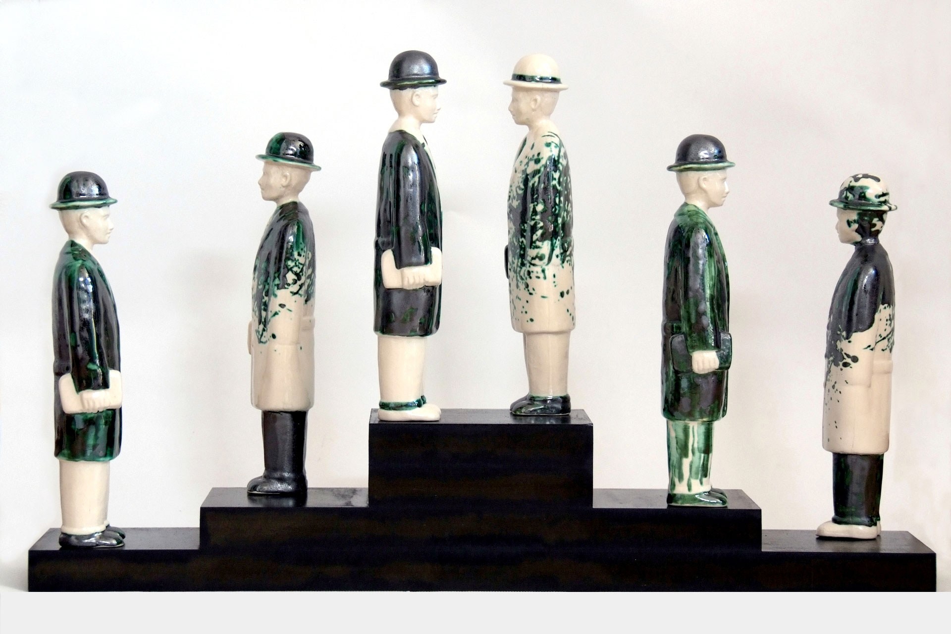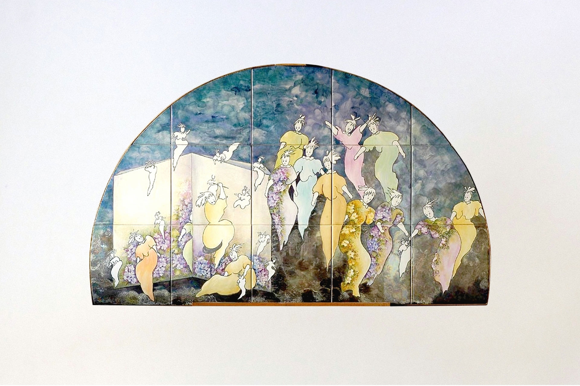 Donna colta e artista di vaglia, ottima disegnatrice e modellatrice, Fausta Cropelli ci offre qui – dopo i piccioni e gli spiritelli – la sua terza persuasiva serie di creature nate dall’alchimìa del gran fuoco e del piccolo fuoco, del biscuit, dalla preziosità degli smalti, delle cristalline, dei lustri, degli ori, degli engobi, insomma dalla varietà di quella plurisecolare tecnica ceramistica a più cotture, che lei ha appreso da autodidatta, ma che ha saputo aggiornare e reinventare con stile personale, uno stile che non esclude la commistione di materiali, la ricerca e la sperimentazione di nuove strade. Forme modulari e seriali, replicate con gli stampi, ma che divengono, come le definisce Fausta, “le mie tele”, le superfici sui cui esprimere e dilatare un’inesauribile, sontuoso repertorio pittorico, una saturazione decorativa fatta di pennellate talora astratte, di sapienti gocciolature, di segni, di motivi floreali, vegetali, figurativi, in un proliferare gestuale che va letto sia nel dettaglio sia nell’assieme.