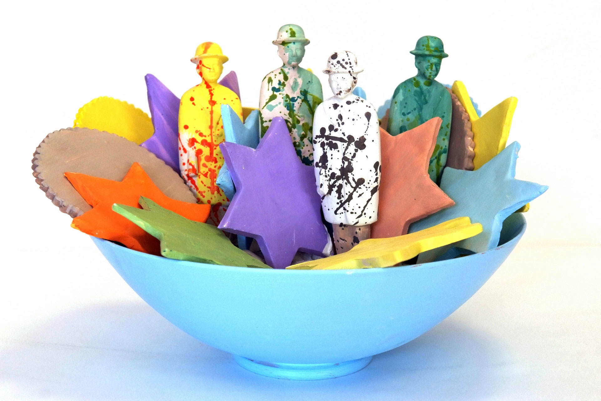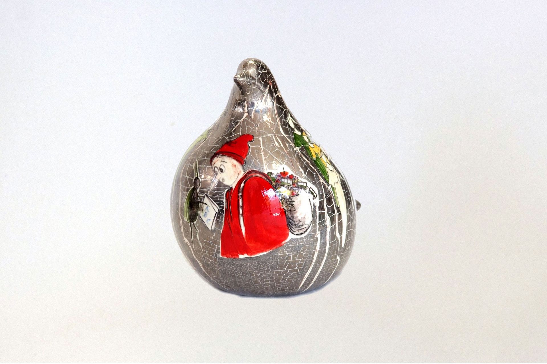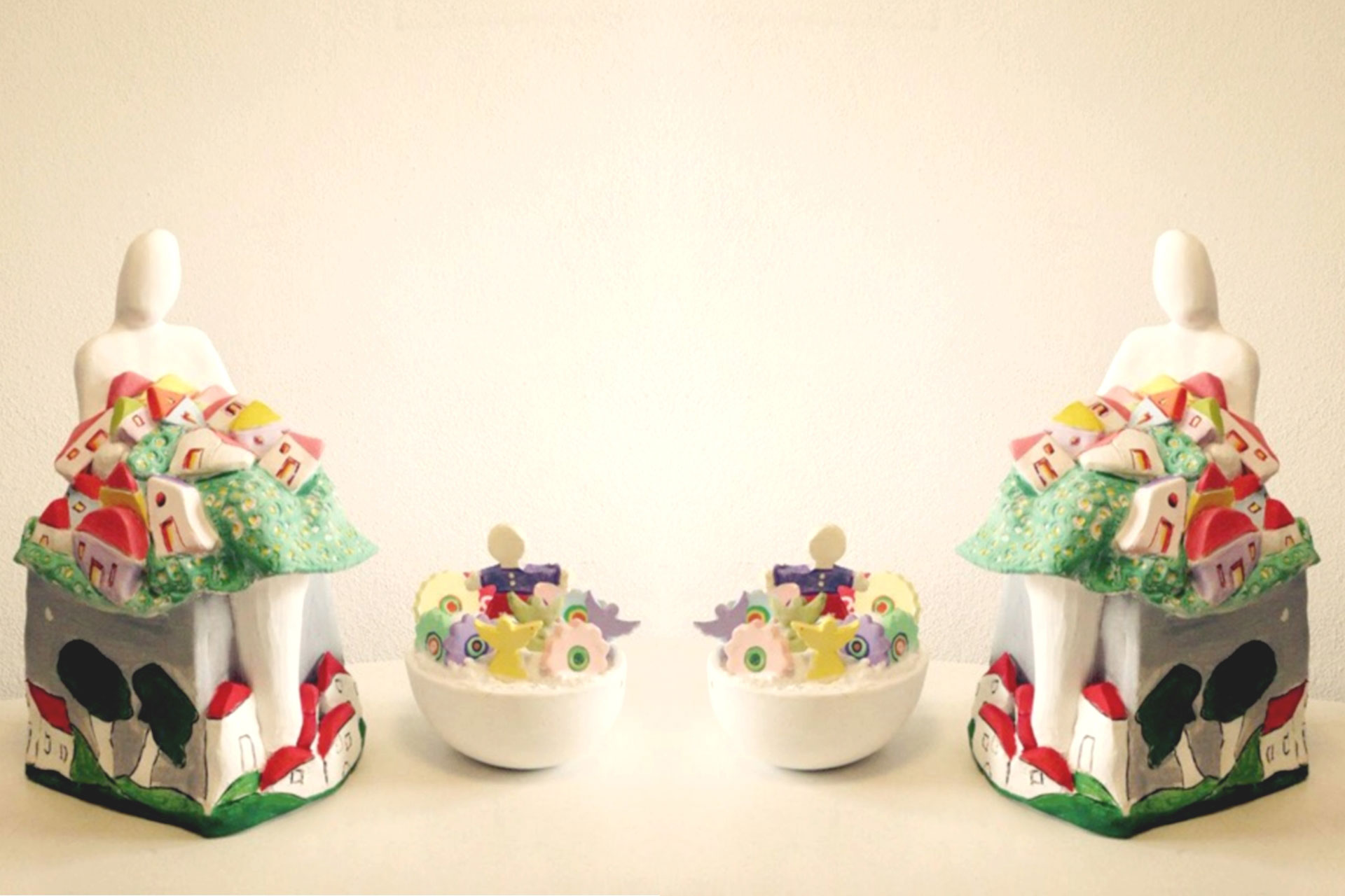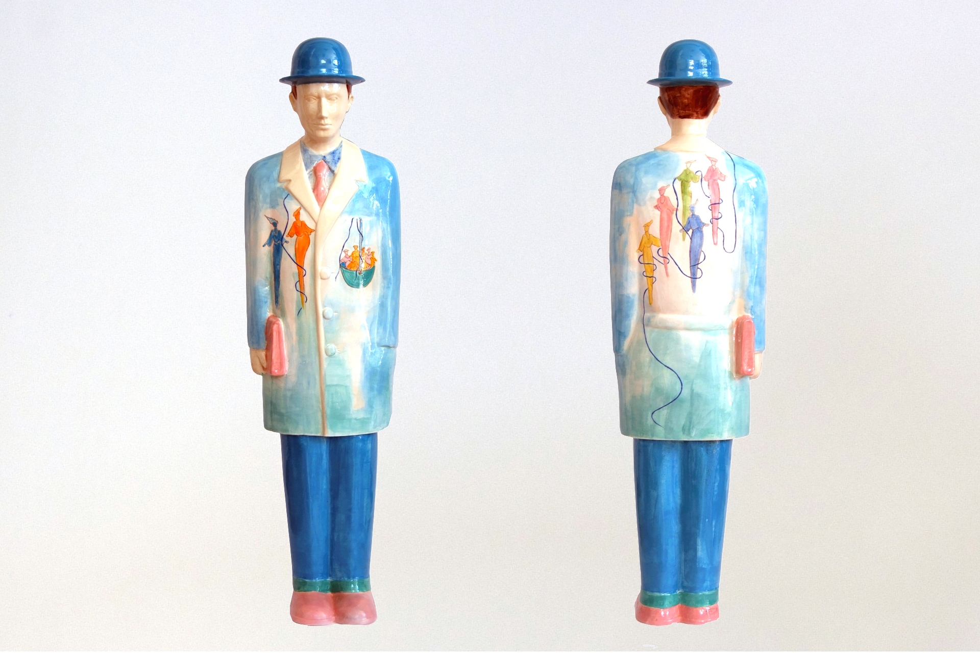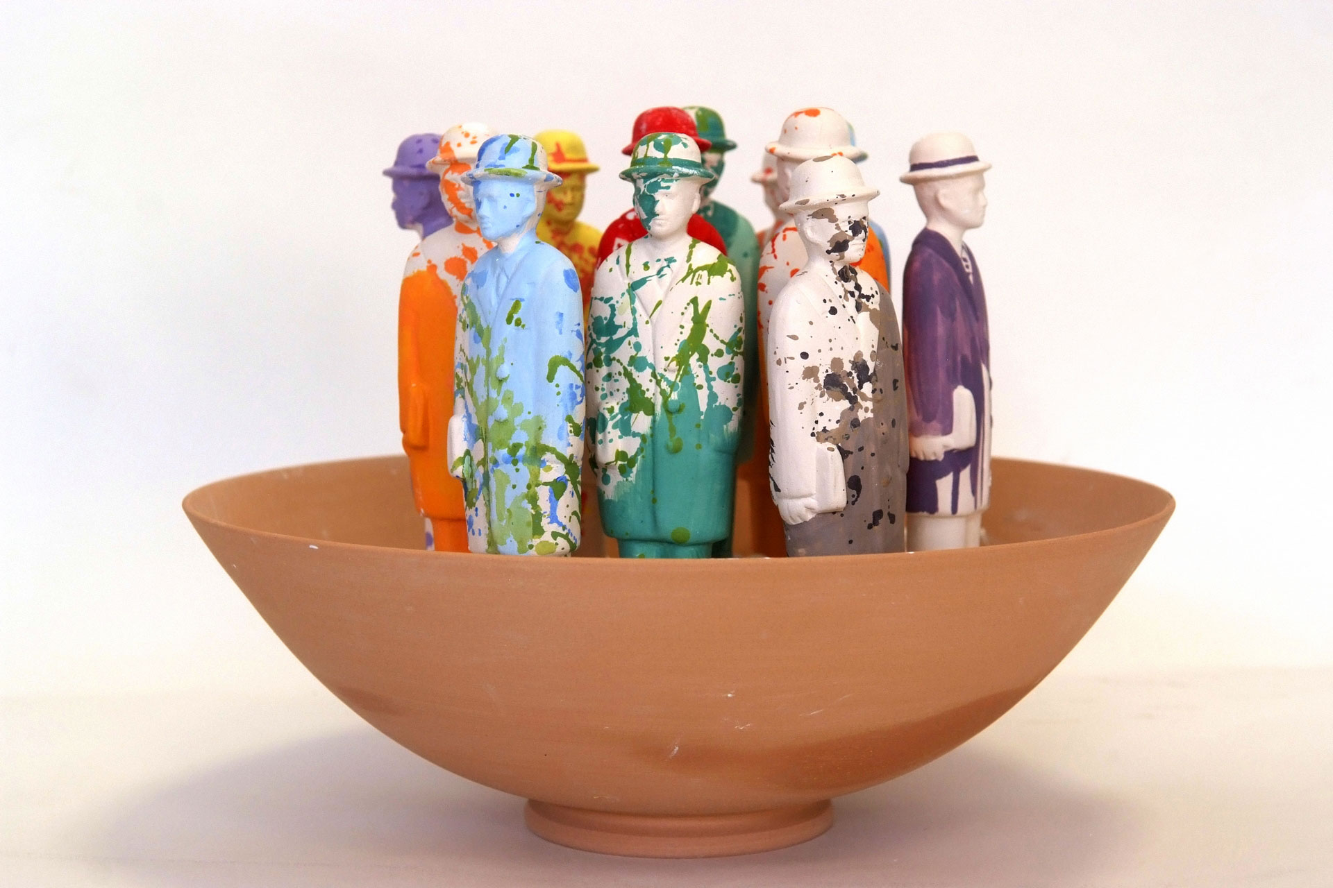 Donna colta e artista di vaglia, ottima disegnatrice e modellatrice, Fausta Cropelli ci offre qui – dopo i piccioni e gli spiritelli – la sua terza persuasiva serie di creature nate dall’alchimìa del gran fuoco e del piccolo fuoco, del biscuit, dalla preziosità degli smalti, delle cristalline, dei lustri, degli ori, degli engobi, insomma dalla varietà di quella plurisecolare tecnica ceramistica a più cotture, che lei ha appreso da autodidatta, ma che ha saputo aggiornare e reinventare con stile personale, uno stile che non esclude la commistione di materiali, la ricerca e la sperimentazione di nuove strade. Forme modulari e seriali, replicate con gli stampi, ma che divengono, come le definisce Fausta, “le mie tele”, le superfici sui cui esprimere e dilatare un’inesauribile, sontuoso repertorio pittorico, una saturazione decorativa fatta di pennellate talora astratte, di sapienti gocciolature, di segni, di motivi floreali, vegetali, figurativi, in un proliferare gestuale che va letto sia nel dettaglio sia nell’assieme.