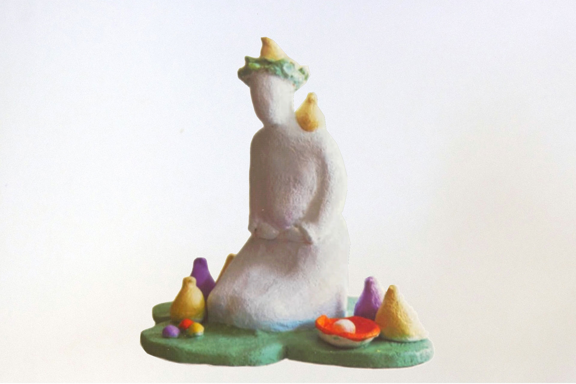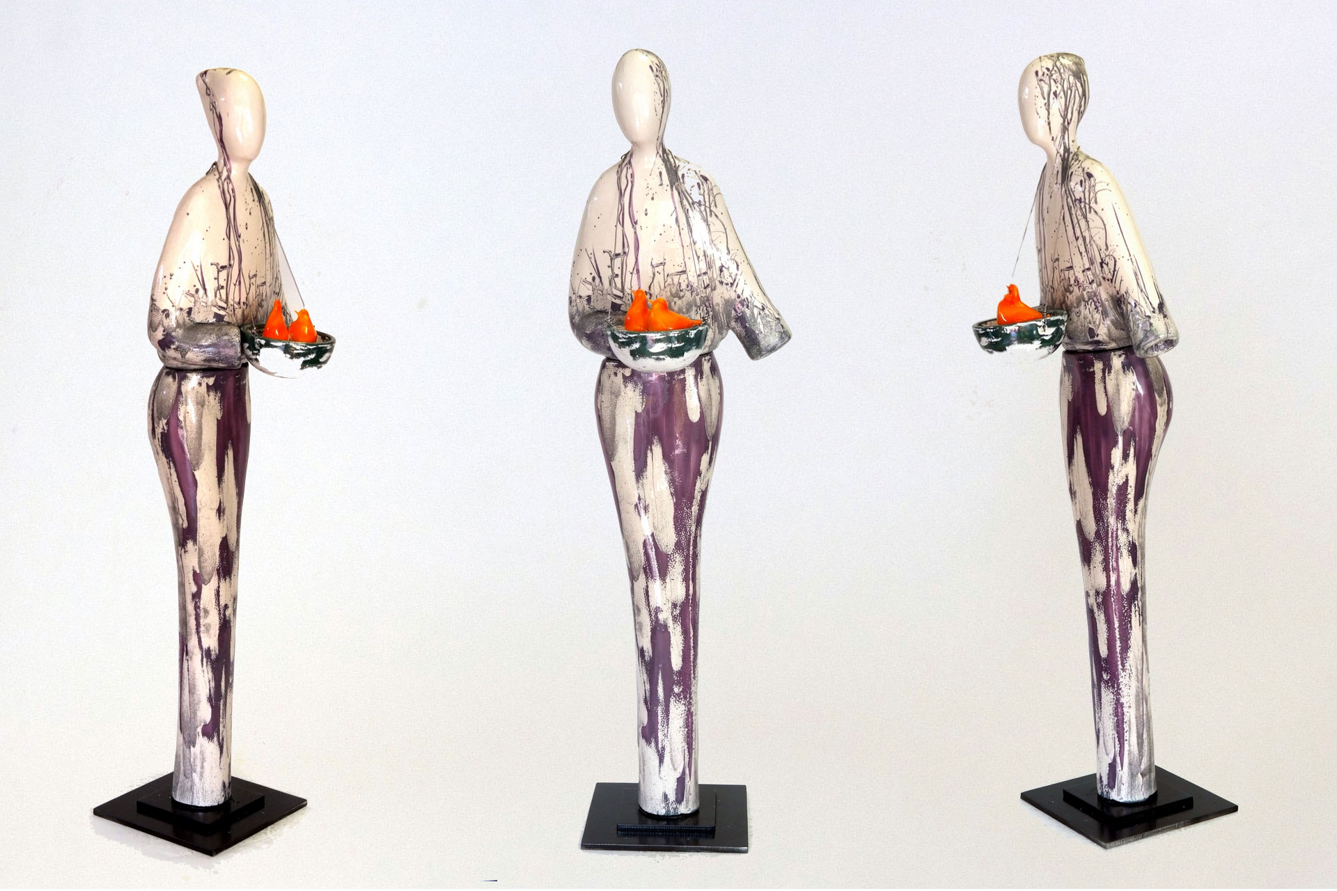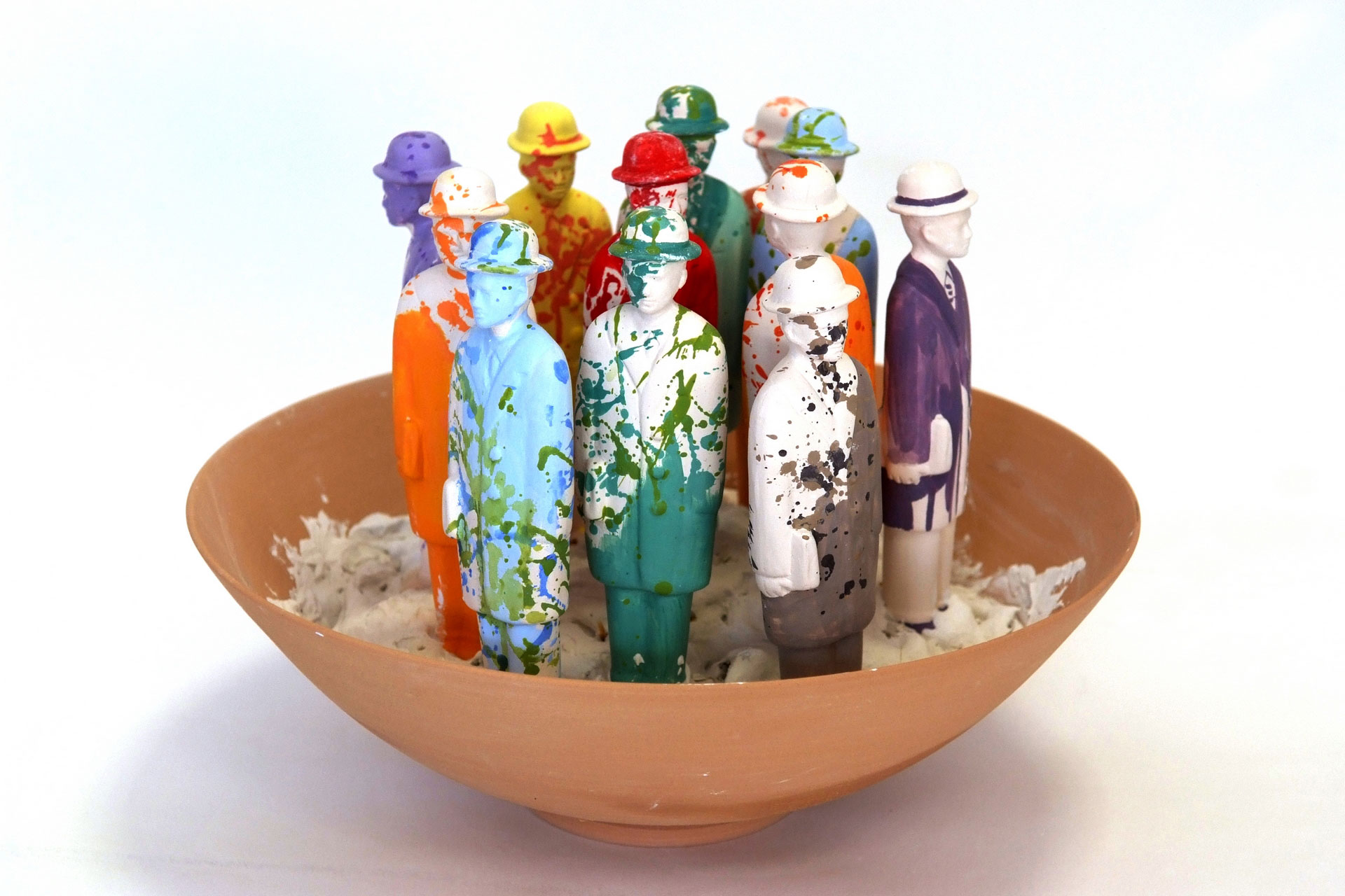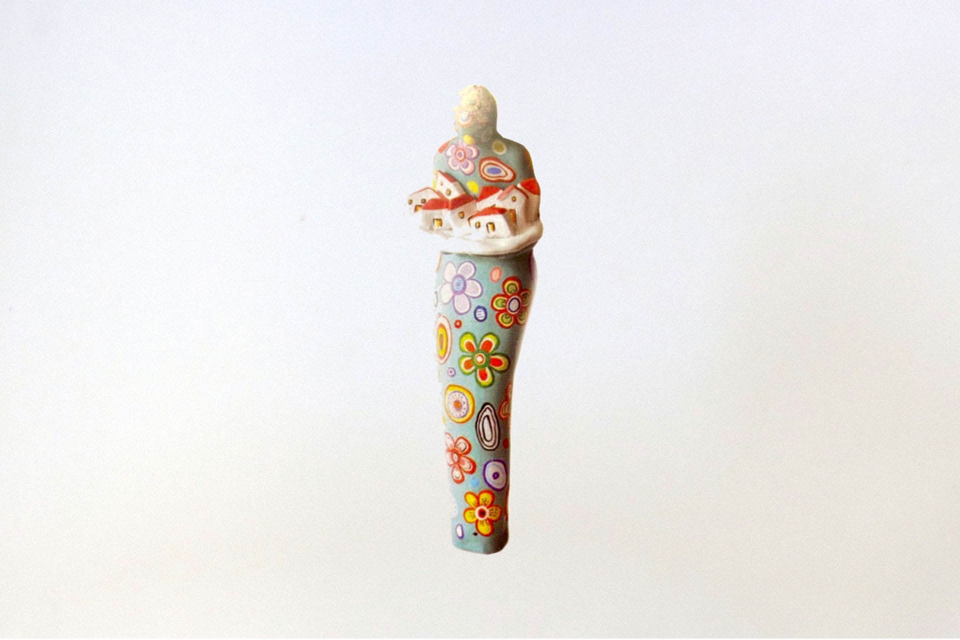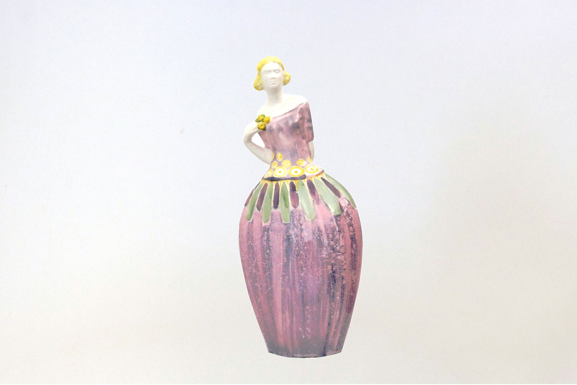 Donna colta e artista di vaglia, ottima disegnatrice e modellatrice, Fausta Cropelli ci offre qui – dopo i piccioni e gli spiritelli – la sua terza persuasiva serie di creature nate dall’alchimìa del gran fuoco e del piccolo fuoco, del biscuit, dalla preziosità degli smalti, delle cristalline, dei lustri, degli ori, degli engobi, insomma dalla varietà di quella plurisecolare tecnica ceramistica a più cotture, che lei ha appreso da autodidatta, ma che ha saputo aggiornare e reinventare con stile personale, uno stile che non esclude la commistione di materiali, la ricerca e la sperimentazione di nuove strade. Forme modulari e seriali, replicate con gli stampi, ma che divengono, come le definisce Fausta, “le mie tele”, le superfici sui cui esprimere e dilatare un’inesauribile, sontuoso repertorio pittorico, una saturazione decorativa fatta di pennellate talora astratte, di sapienti gocciolature, di segni, di motivi floreali, vegetali, figurativi, in un proliferare gestuale che va letto sia nel dettaglio sia nell’assieme.