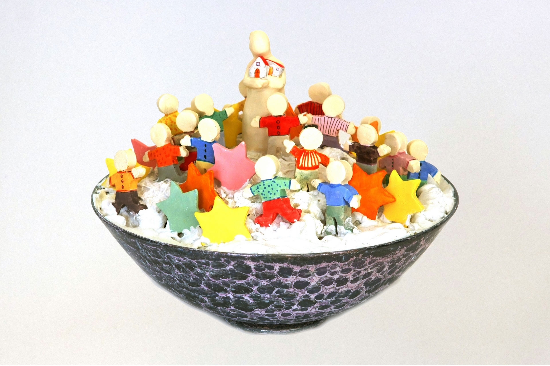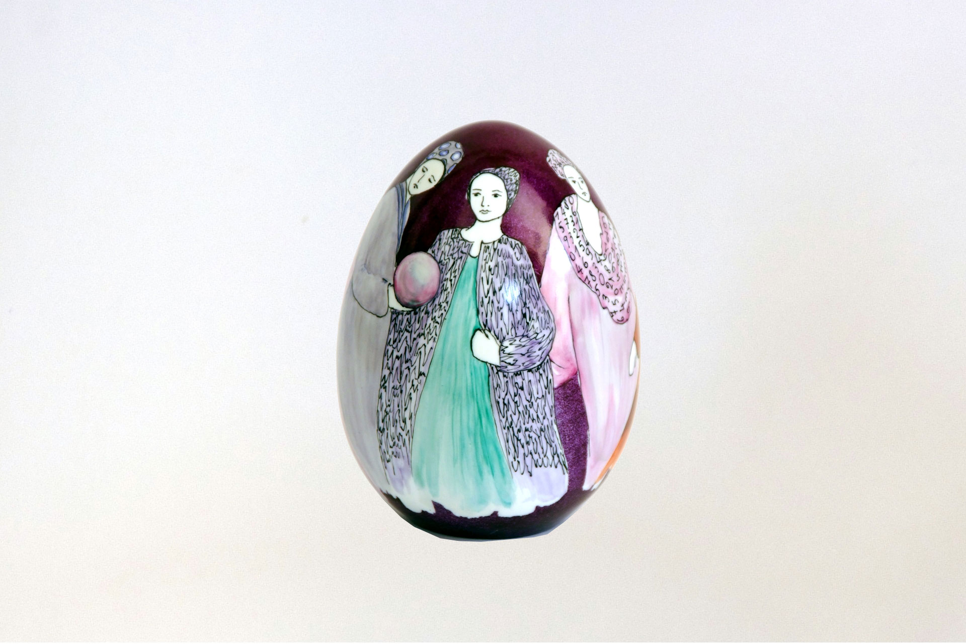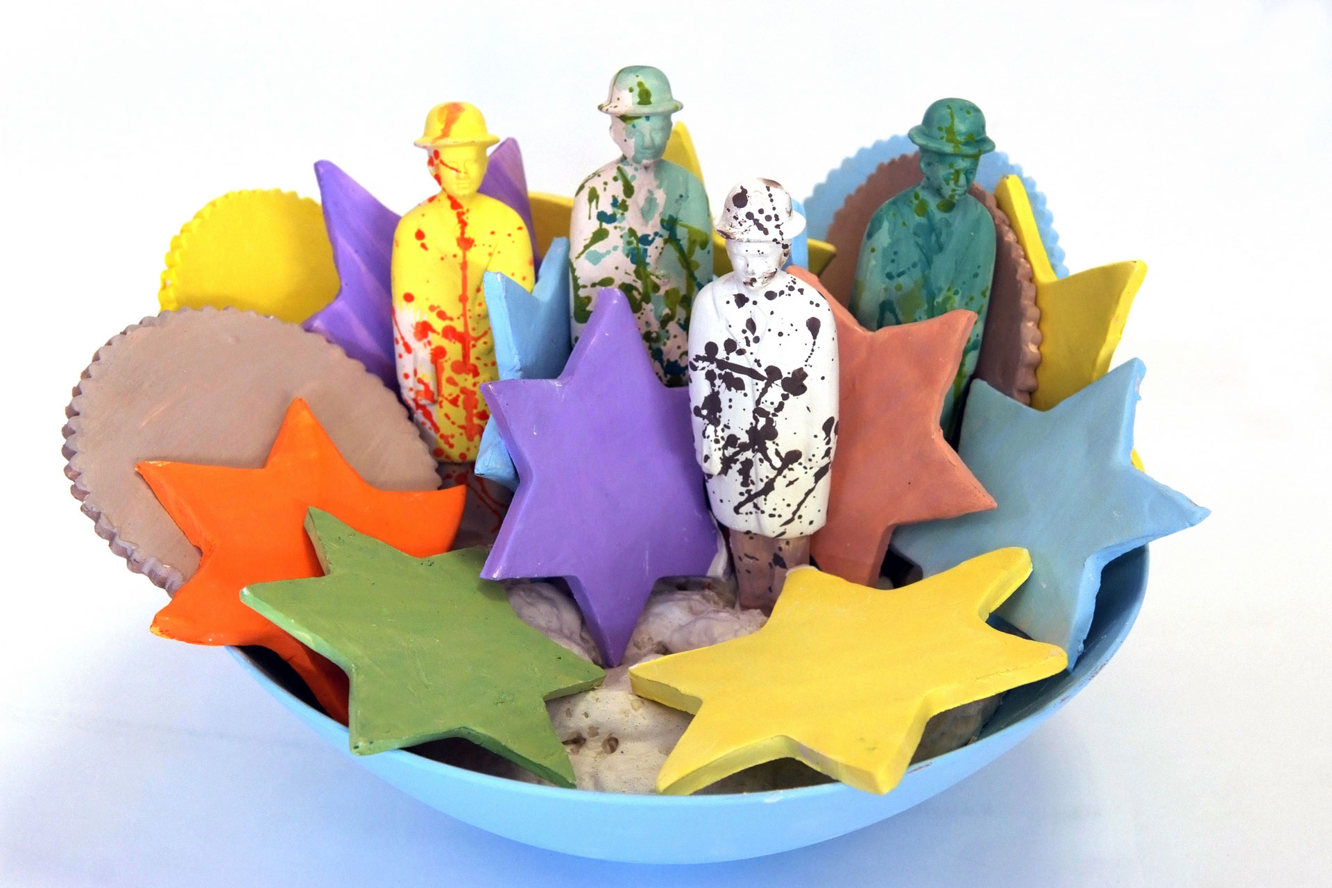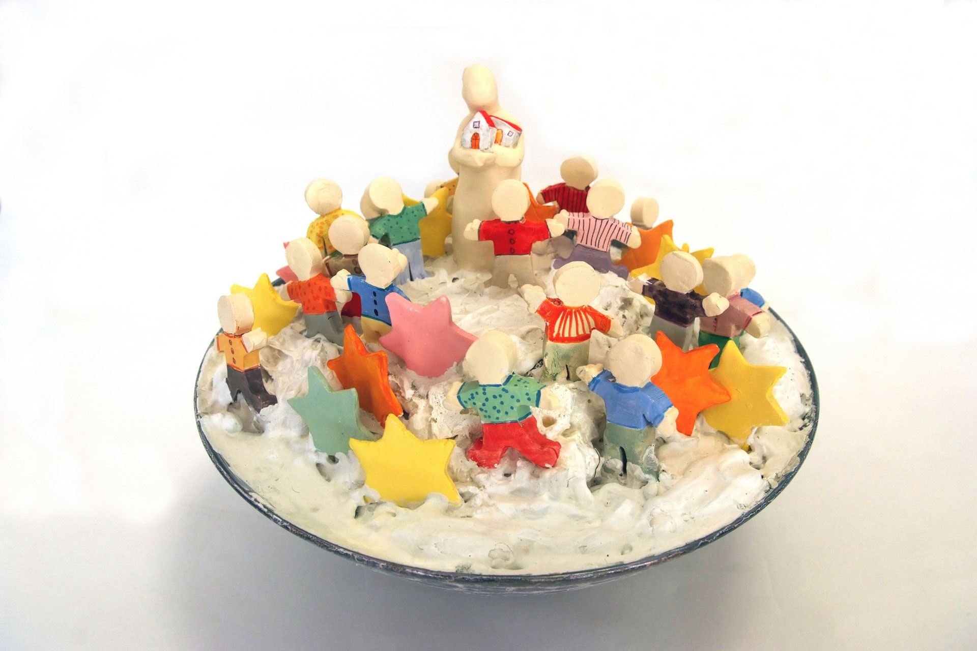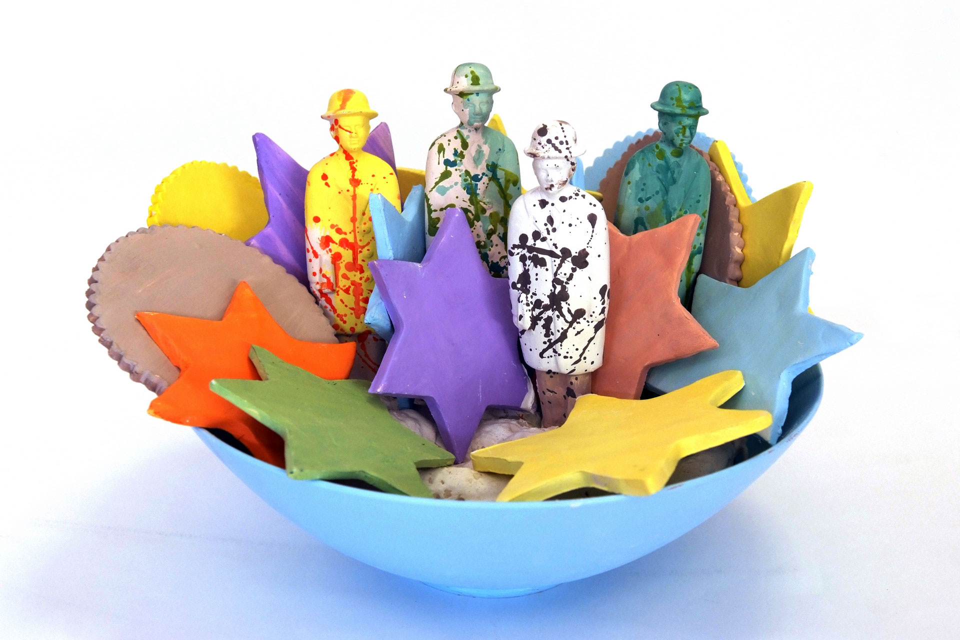 Donna colta e artista di vaglia, ottima disegnatrice e modellatrice, Fausta Cropelli ci offre qui – dopo i piccioni e gli spiritelli – la sua terza persuasiva serie di creature nate dall’alchimìa del gran fuoco e del piccolo fuoco, del biscuit, dalla preziosità degli smalti, delle cristalline, dei lustri, degli ori, degli engobi, insomma dalla varietà di quella plurisecolare tecnica ceramistica a più cotture, che lei ha appreso da autodidatta, ma che ha saputo aggiornare e reinventare con stile personale, uno stile che non esclude la commistione di materiali, la ricerca e la sperimentazione di nuove strade. Forme modulari e seriali, replicate con gli stampi, ma che divengono, come le definisce Fausta, “le mie tele”, le superfici sui cui esprimere e dilatare un’inesauribile, sontuoso repertorio pittorico, una saturazione decorativa fatta di pennellate talora astratte, di sapienti gocciolature, di segni, di motivi floreali, vegetali, figurativi, in un proliferare gestuale che va letto sia nel dettaglio sia nell’assieme.