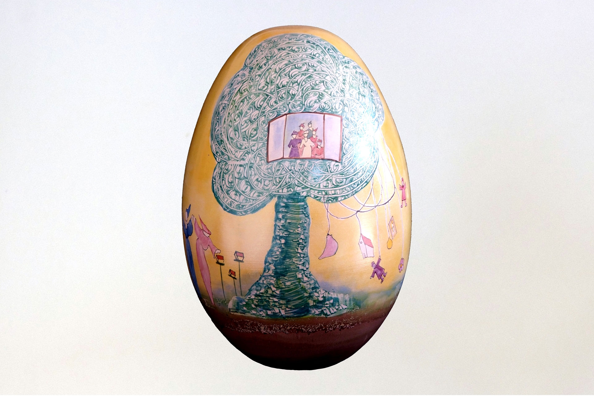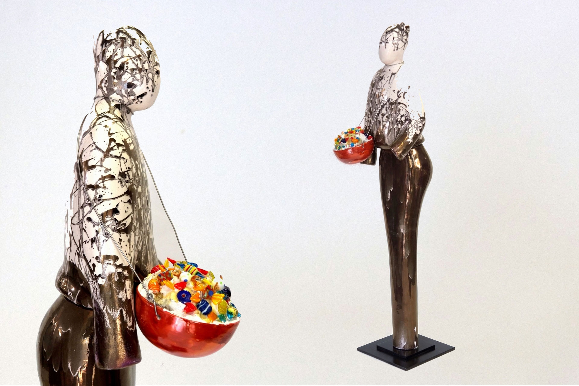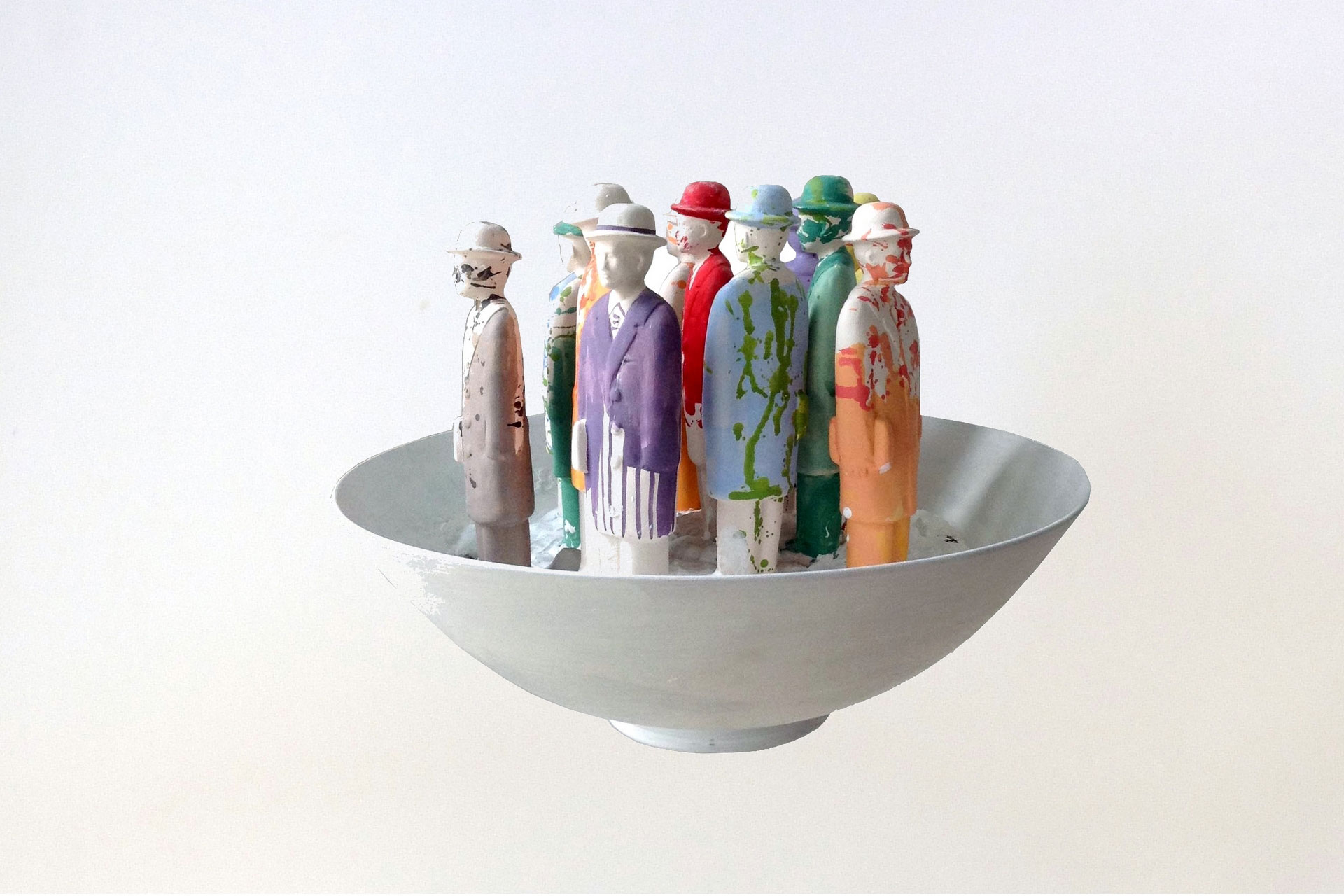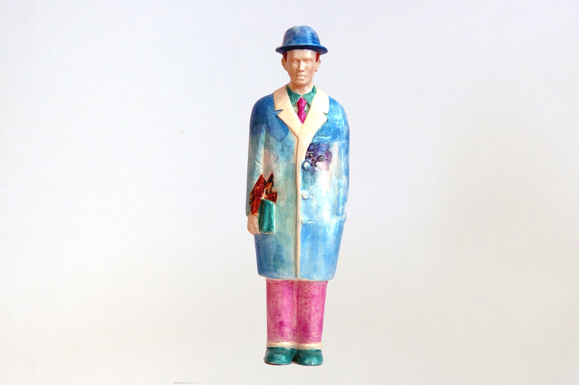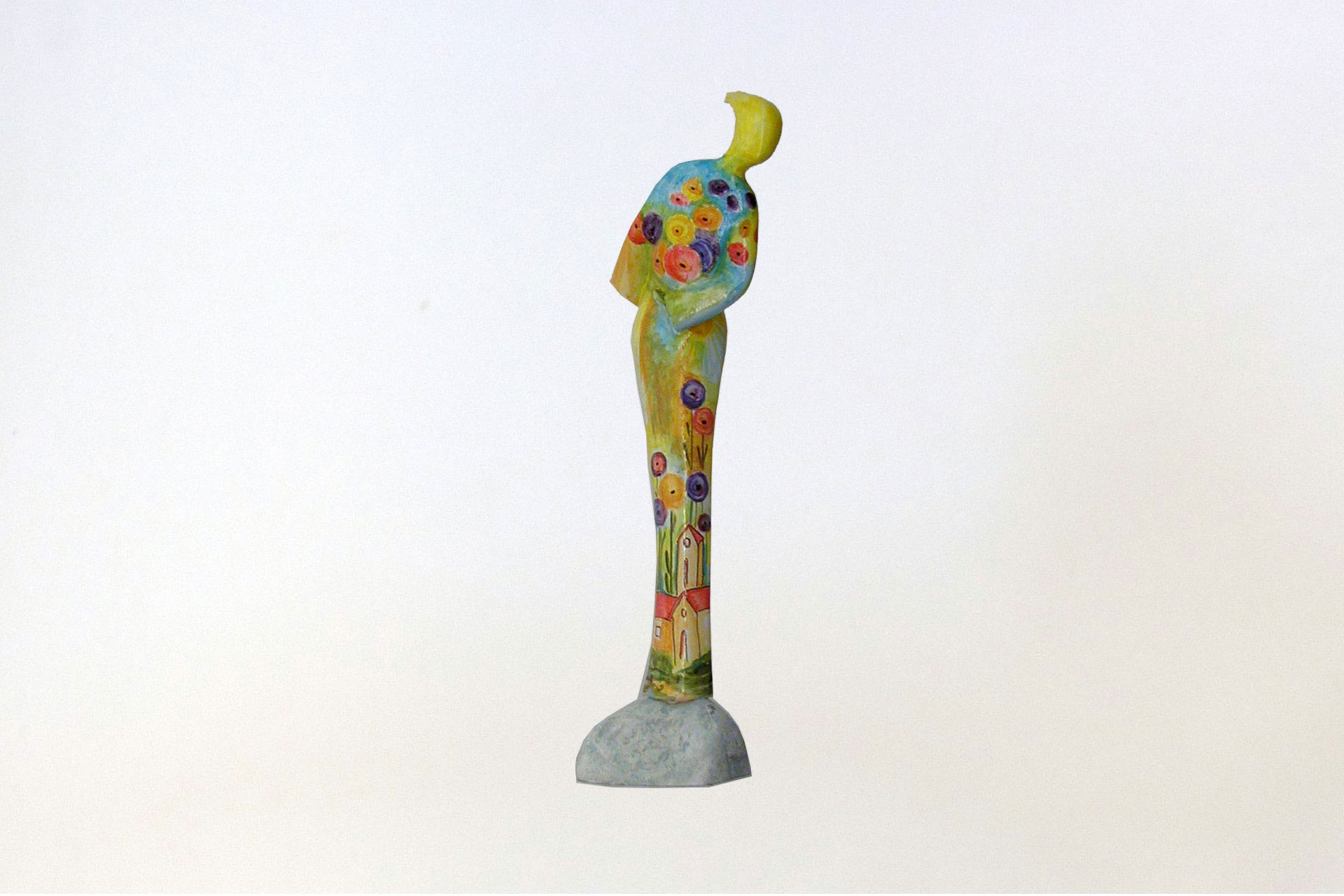 Donna colta e artista di vaglia, ottima disegnatrice e modellatrice, Fausta Cropelli ci offre qui – dopo i piccioni e gli spiritelli – la sua terza persuasiva serie di creature nate dall’alchimìa del gran fuoco e del piccolo fuoco, del biscuit, dalla preziosità degli smalti, delle cristalline, dei lustri, degli ori, degli engobi, insomma dalla varietà di quella plurisecolare tecnica ceramistica a più cotture, che lei ha appreso da autodidatta, ma che ha saputo aggiornare e reinventare con stile personale, uno stile che non esclude la commistione di materiali, la ricerca e la sperimentazione di nuove strade. Forme modulari e seriali, replicate con gli stampi, ma che divengono, come le definisce Fausta, “le mie tele”, le superfici sui cui esprimere e dilatare un’inesauribile, sontuoso repertorio pittorico, una saturazione decorativa fatta di pennellate talora astratte, di sapienti gocciolature, di segni, di motivi floreali, vegetali, figurativi, in un proliferare gestuale che va letto sia nel dettaglio sia nell’assieme.