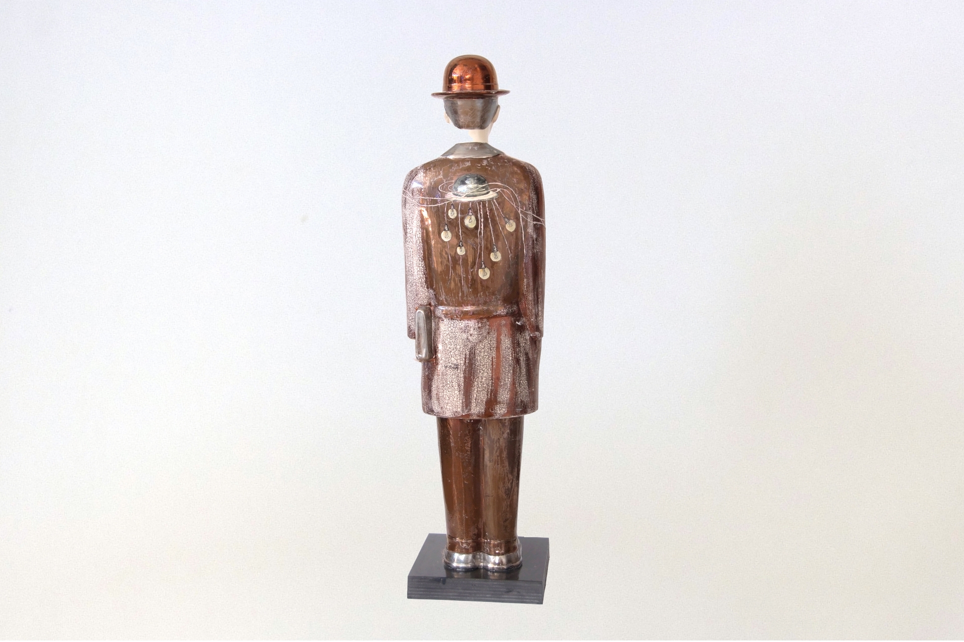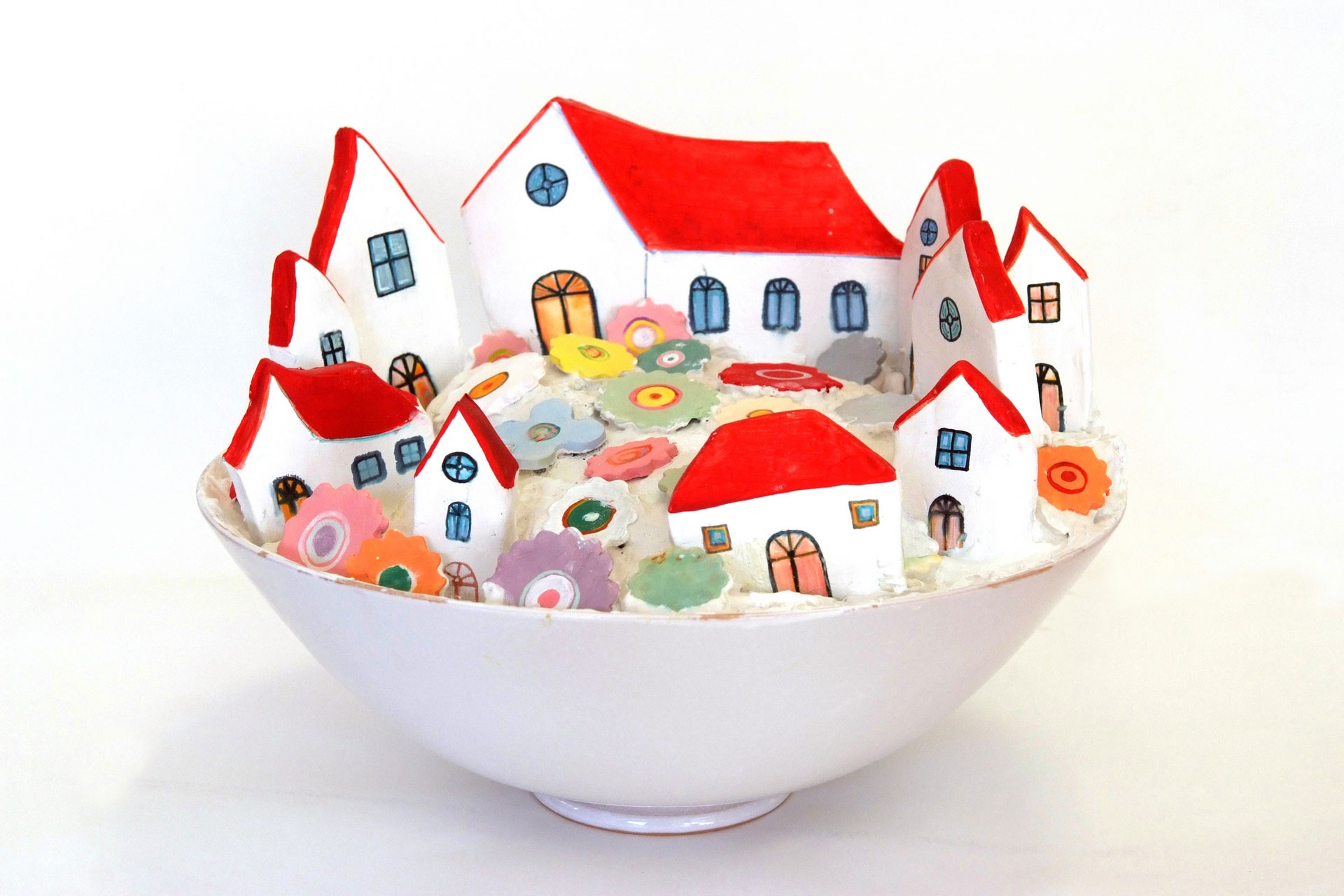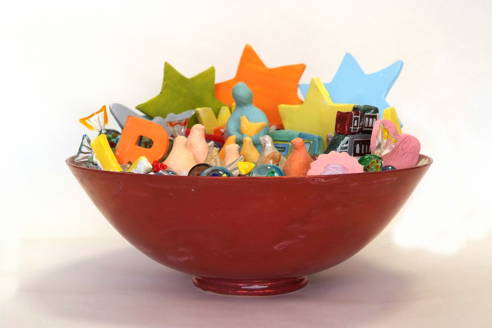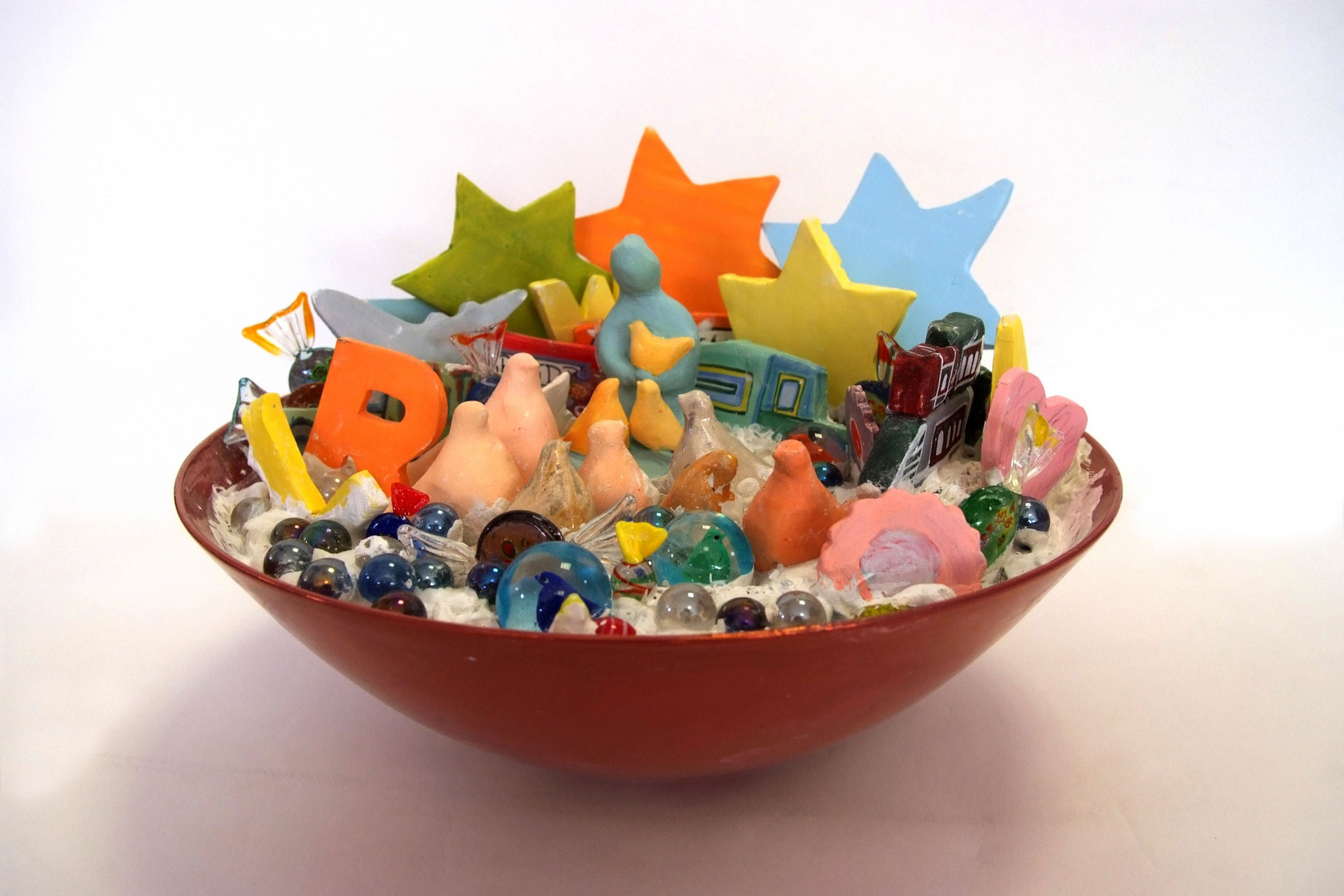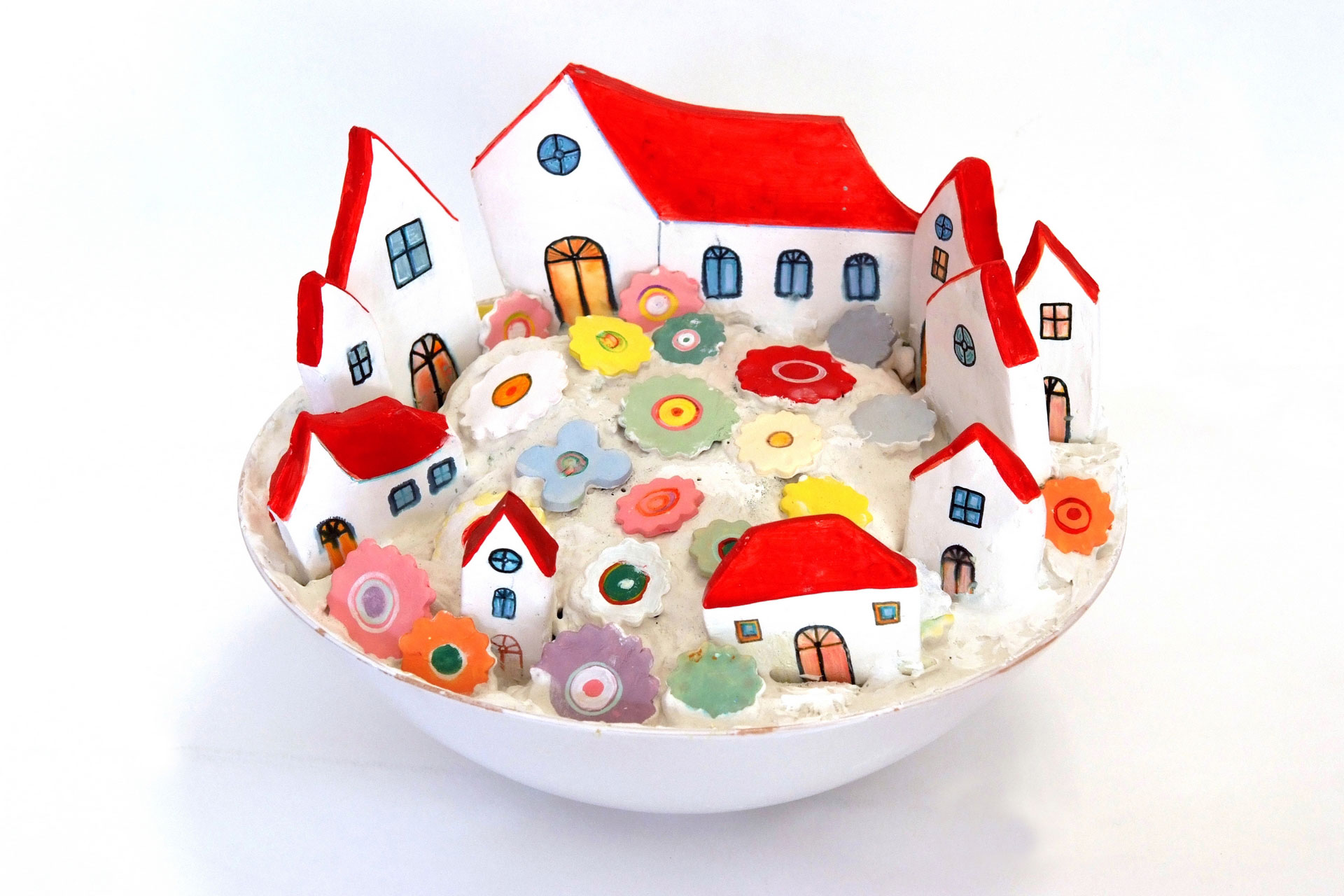 Donna colta e artista di vaglia, ottima disegnatrice e modellatrice, Fausta Cropelli ci offre qui – dopo i piccioni e gli spiritelli – la sua terza persuasiva serie di creature nate dall’alchimìa del gran fuoco e del piccolo fuoco, del biscuit, dalla preziosità degli smalti, delle cristalline, dei lustri, degli ori, degli engobi, insomma dalla varietà di quella plurisecolare tecnica ceramistica a più cotture, che lei ha appreso da autodidatta, ma che ha saputo aggiornare e reinventare con stile personale, uno stile che non esclude la commistione di materiali, la ricerca e la sperimentazione di nuove strade. Forme modulari e seriali, replicate con gli stampi, ma che divengono, come le definisce Fausta, “le mie tele”, le superfici sui cui esprimere e dilatare un’inesauribile, sontuoso repertorio pittorico, una saturazione decorativa fatta di pennellate talora astratte, di sapienti gocciolature, di segni, di motivi floreali, vegetali, figurativi, in un proliferare gestuale che va letto sia nel dettaglio sia nell’assieme.